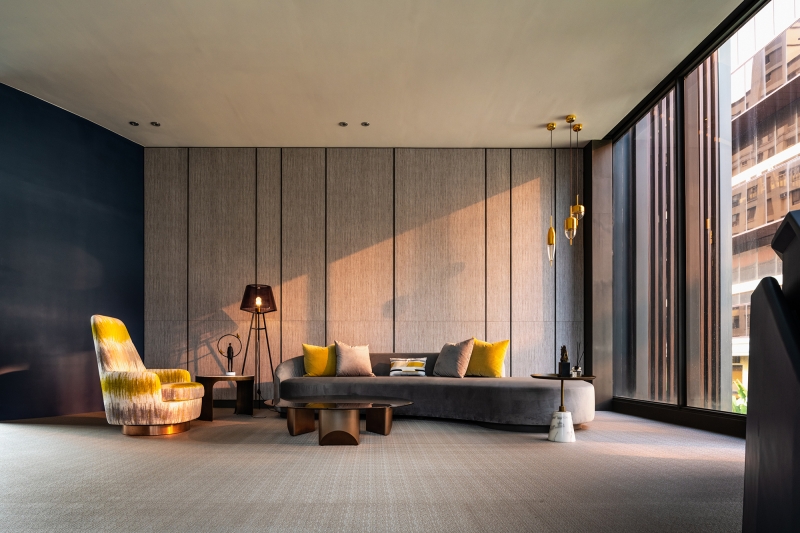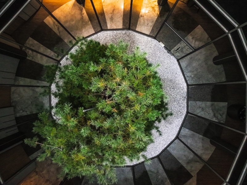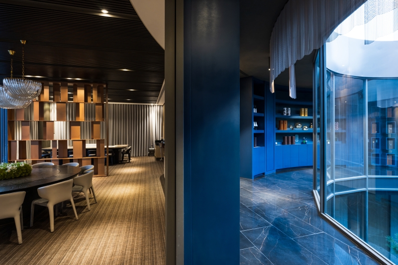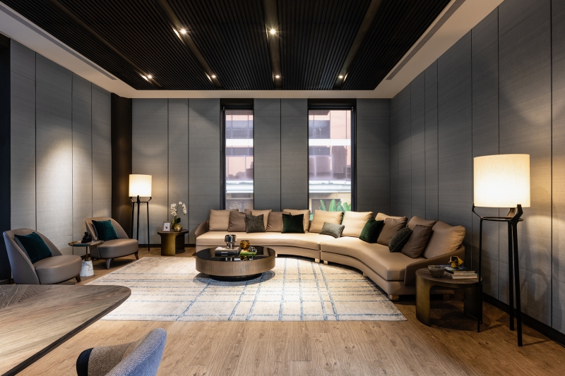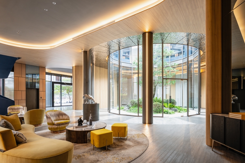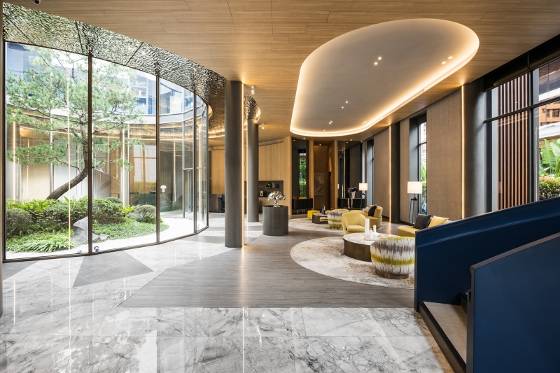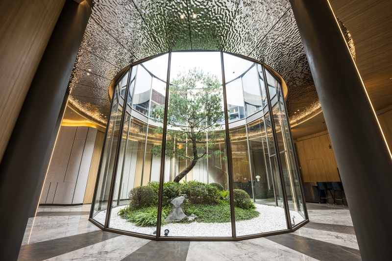 The clubhouse boasts a delicate design that departs from the rigidity and enclosed nature of traditional halls. In addition to enlarging the spatial scale through an open layout, the project team has incorporated natural elements into the space. This, in turn, enables visitors to experience natural spatial surroundings. The atrium garden, surrounded by cylindrical glass, serves as the highlight of this project. It offers a 360-degree view angle and enhances the light and transparency of the interior. As a result, visitors can engage in comfortable and pleasant conversations in this tranquil atmosphere.