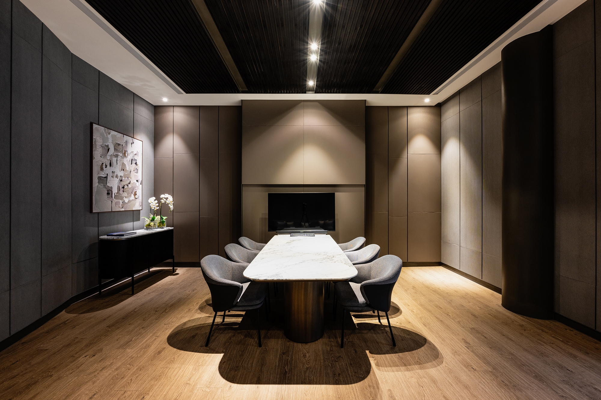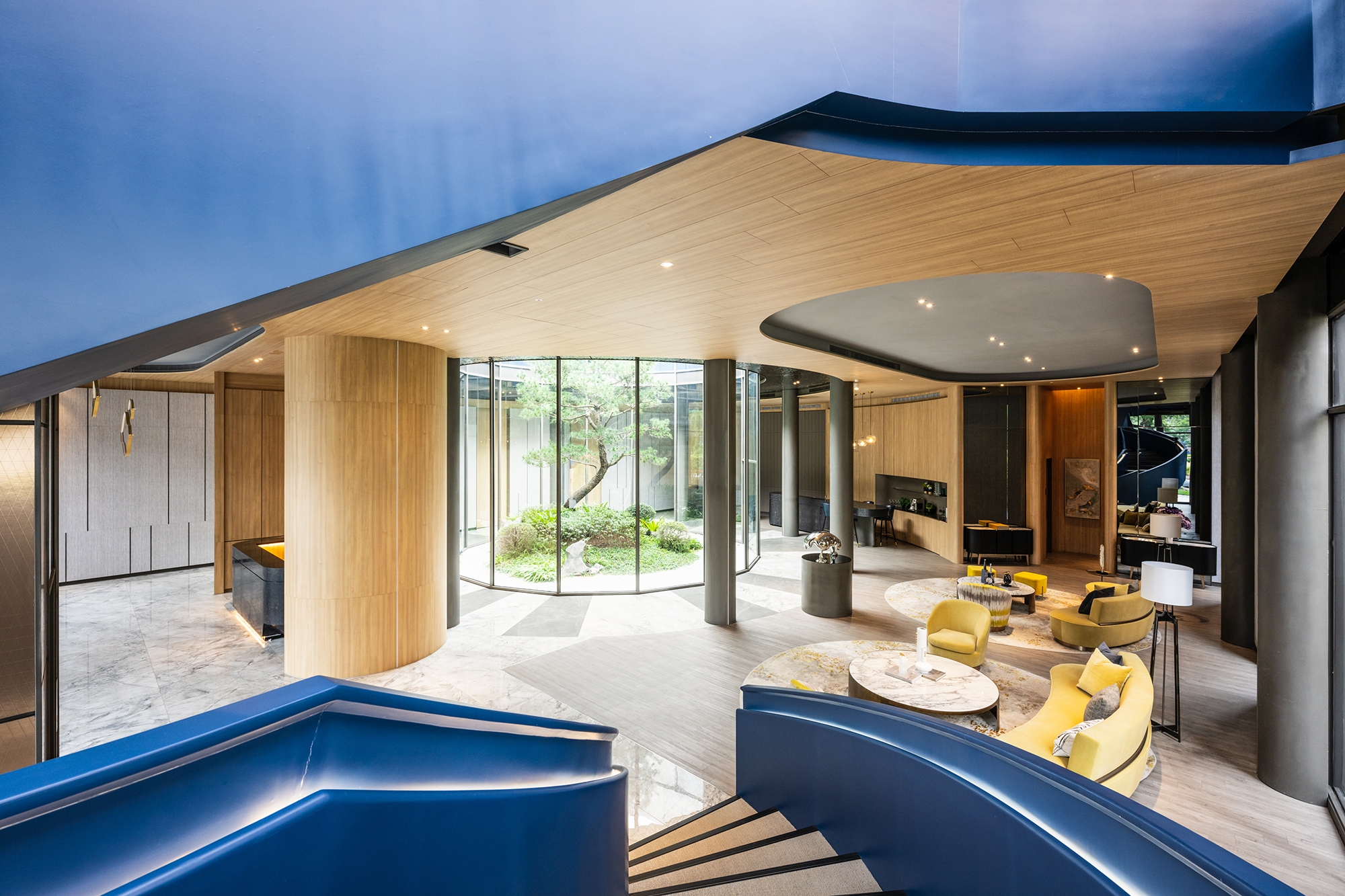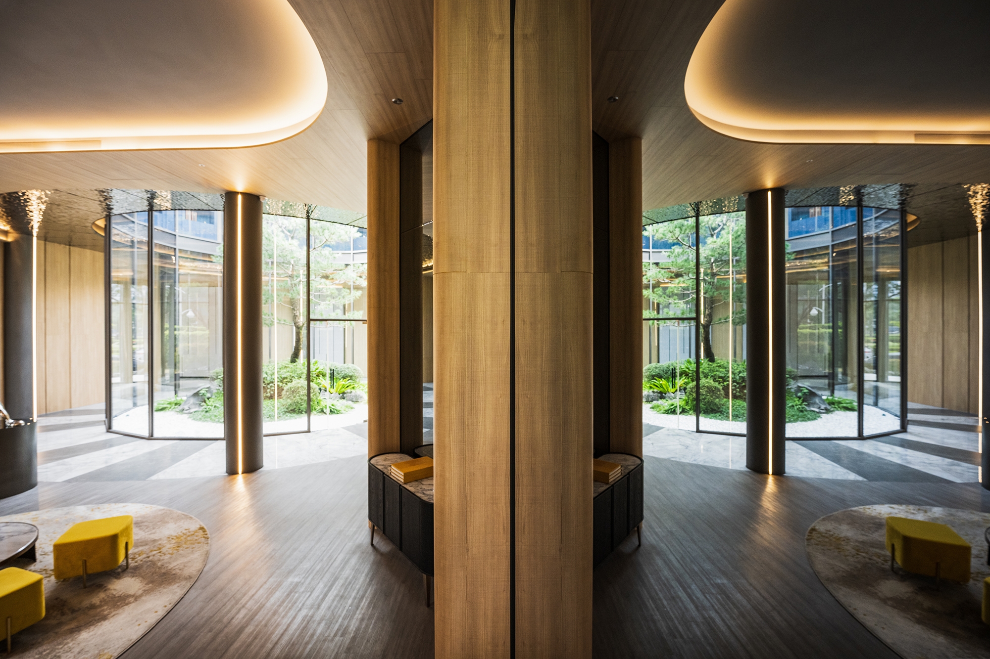 The clubhouse boasts a delicate design that departs from the rigidity and enclosed nature of traditional halls. In addition to enlarging the spatial scale through an open layout, the project team has incorporated natural elements into the space. This, in turn, enables visitors to experience natural spatial surroundings. The atrium garden, surrounded by cylindrical glass, serves as the highlight of this project. It offers a 360-degree view angle and enhances the light and transparency of the interior. As a result, visitors can engage in comfortable and pleasant conversations in this tranquil atmosphere.