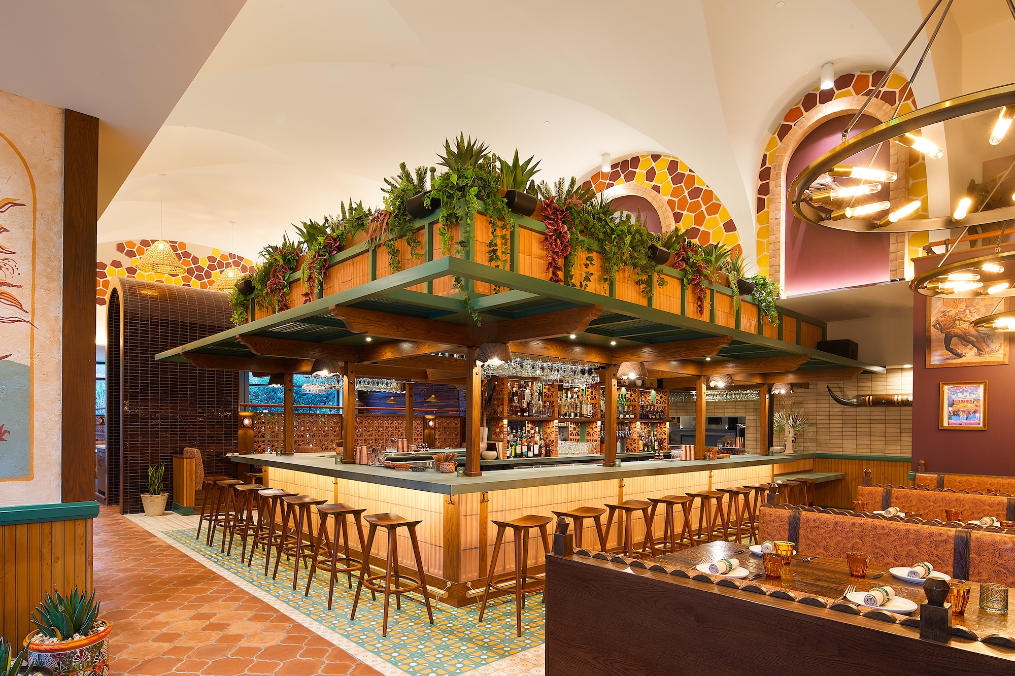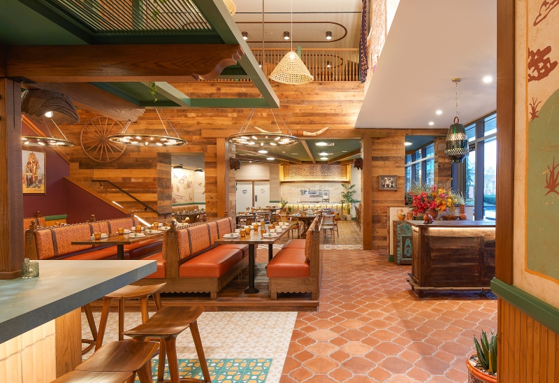 The space references the two cultures through cuisine, décor, and overall guest experience, boasting expansive dining rooms decorated with antique, vintage, and handmade artisan goods. The restaurant includes multiple dining areas, a large outdoor bar, and a second-floor mezzanine lounge with private dining capabilities.