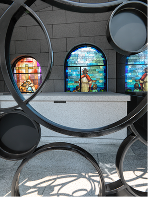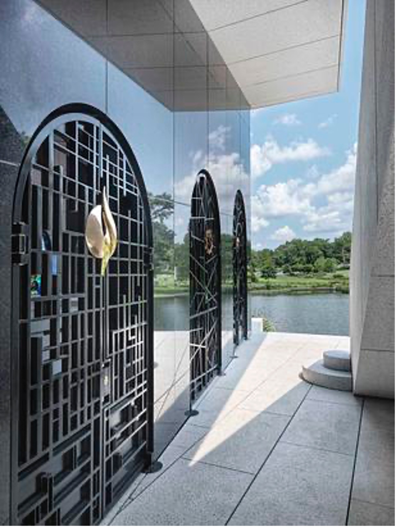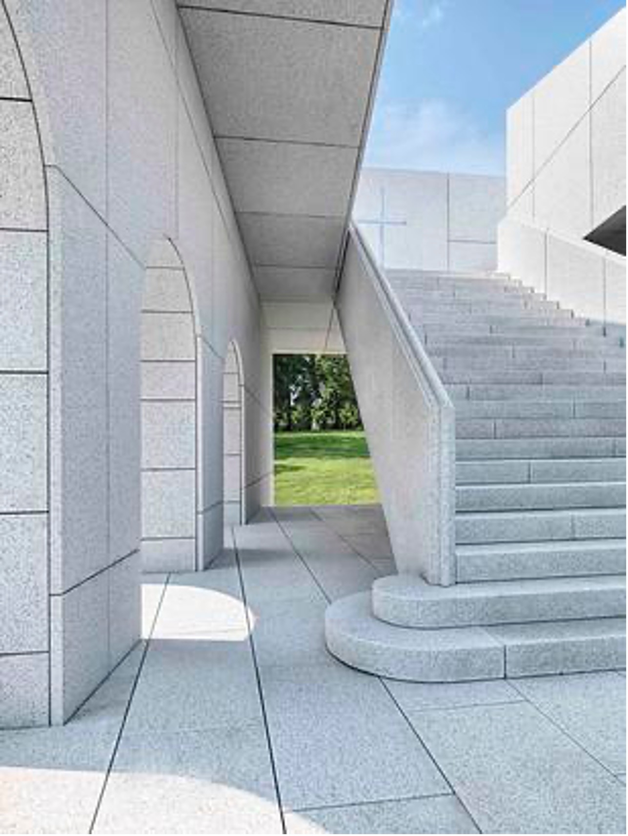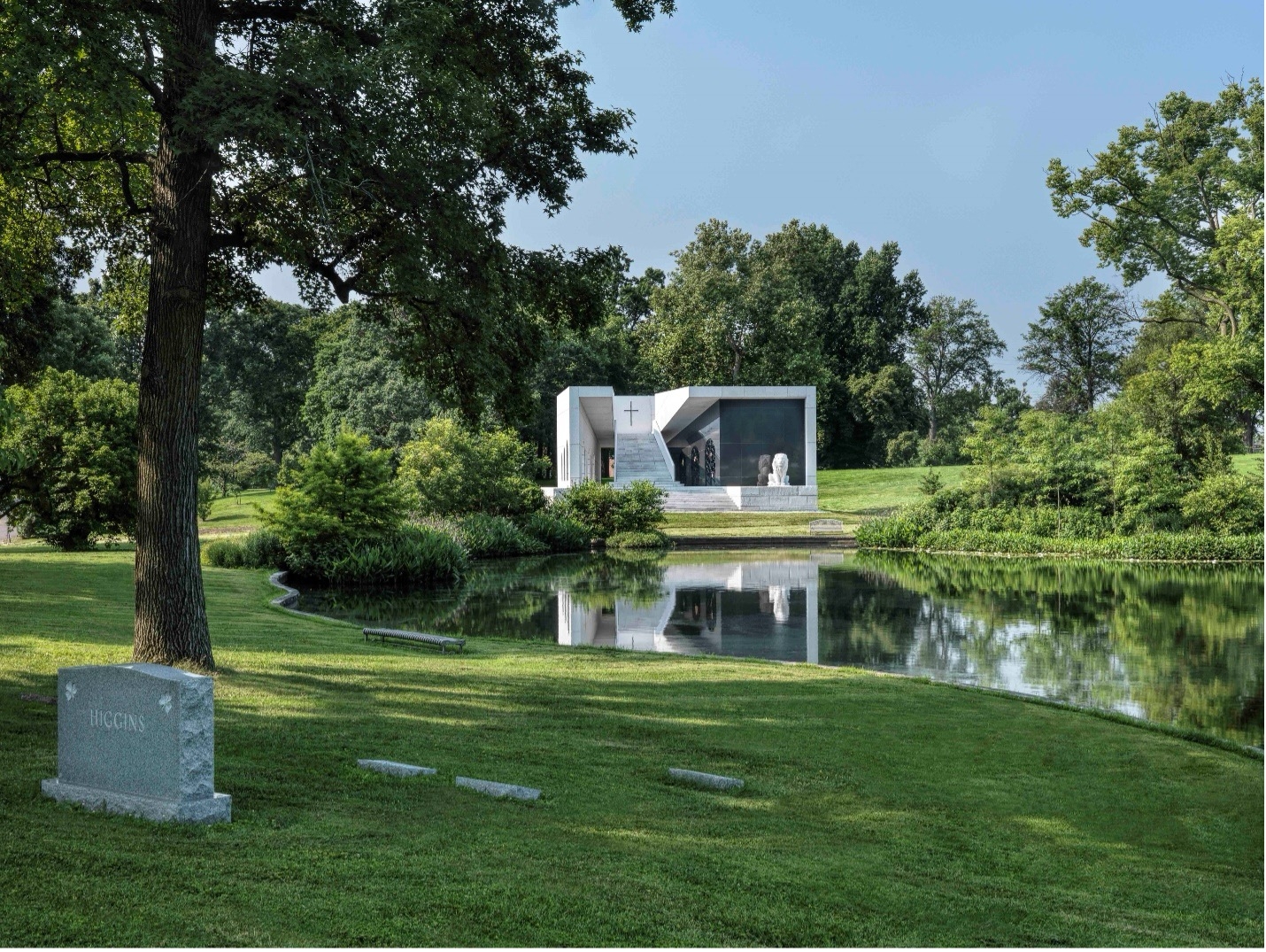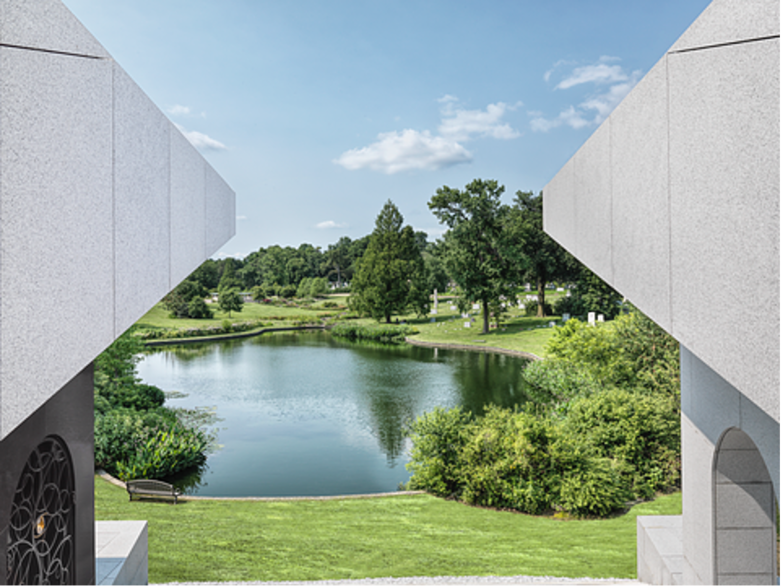 The Cascade Mausoleum was a very special project, not only is it the first new mausoleum in Bellefontaine Cemetery in over 70 years, but we were also given creative freedom by the client to develop the concept. The result is one of our most inspired works. Using the client’s faith as the basis for design, we created a grid system that overlaps the Holy Trinity with the three primary elements of man: mind-body-spirit. The intersection of these grid lines establishes the location for the meaningful and influential moments of the design. The mausoleum also features a cross at the top of the stairs that is cut into a two-foot-thick block of granite. On December 20th at 12 noon (a date important to the client), a projection of the cross shines onto the landing at the crypt level. To ascend the mausoleum is to take a metaphorical journey from life (outside) to death (crypt level) and finally ascending to the afterlife (the top level) where one is gifted the expansive and glorious views otherwise hidden. Our work on the Mausoleum was full service in every sense of the word.