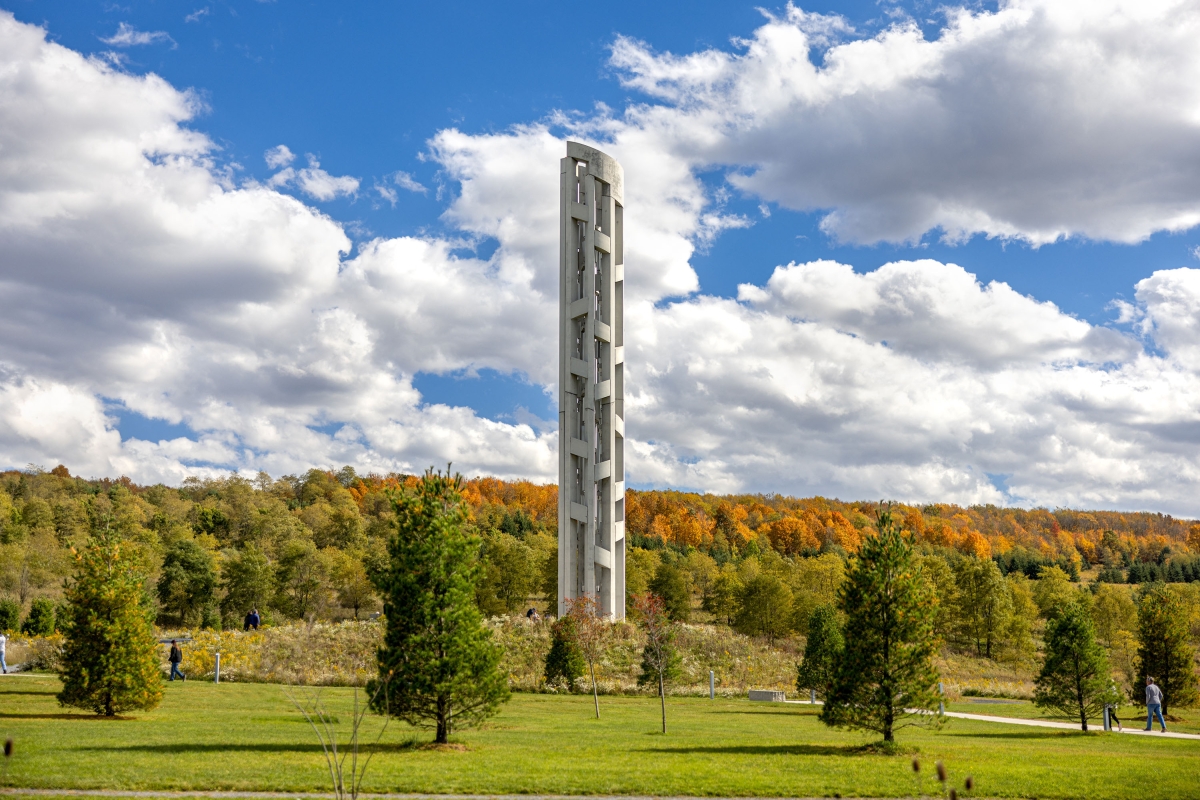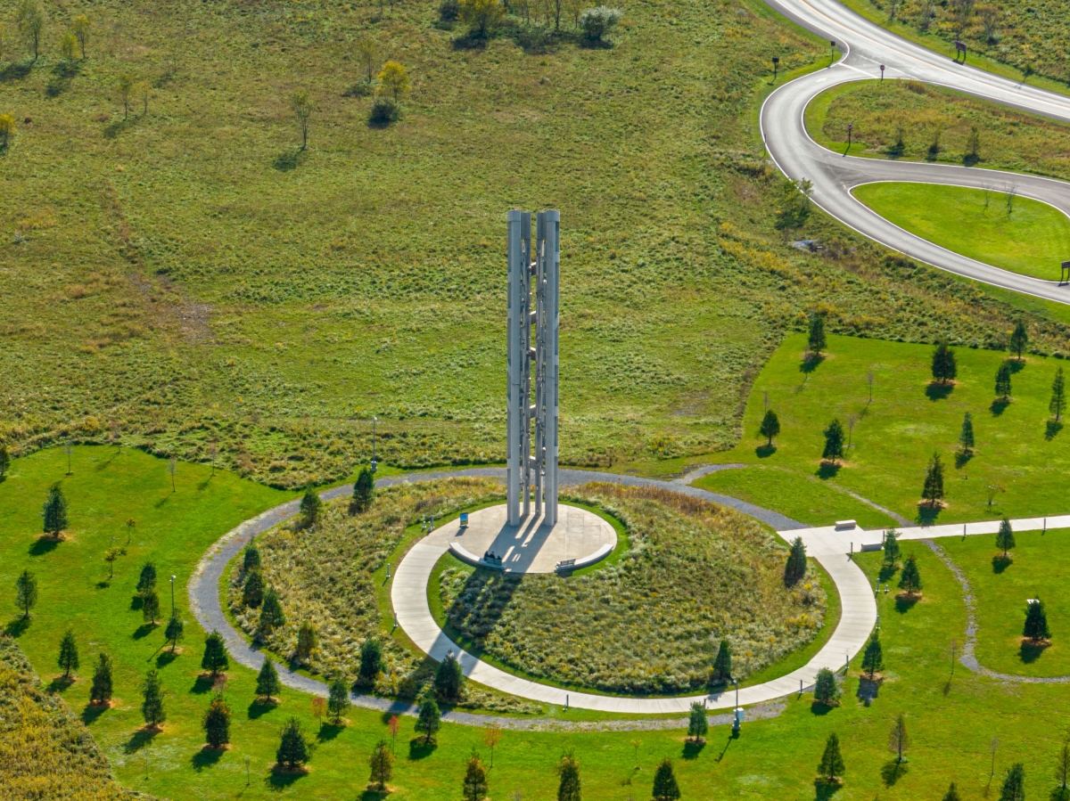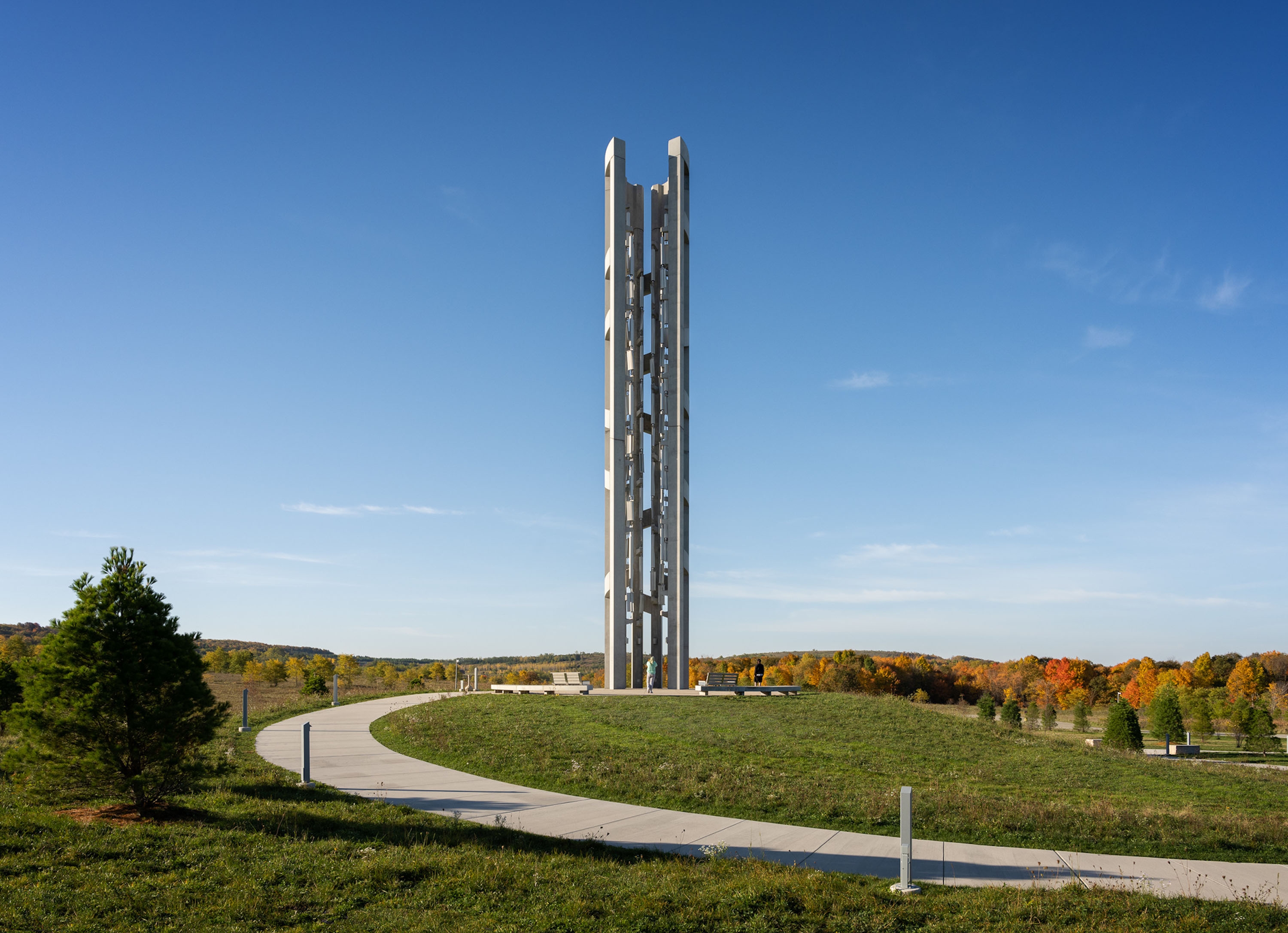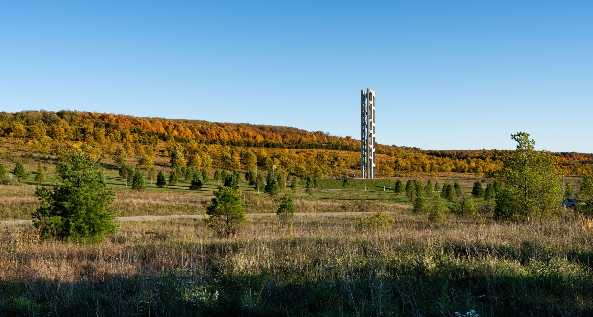 The Tower of Voices is a 93-feet tall musical instrument near the entrance to the Flight 93 National Memorial, a national park located where United Flight 93 crashed on September 11, 2001. The tower holds 40 wind chimes that commemorate the heroic action of 40 passengers and crewmembers onboard the plane, as a living memorial in sound to remember the 40 through their ongoing voices.