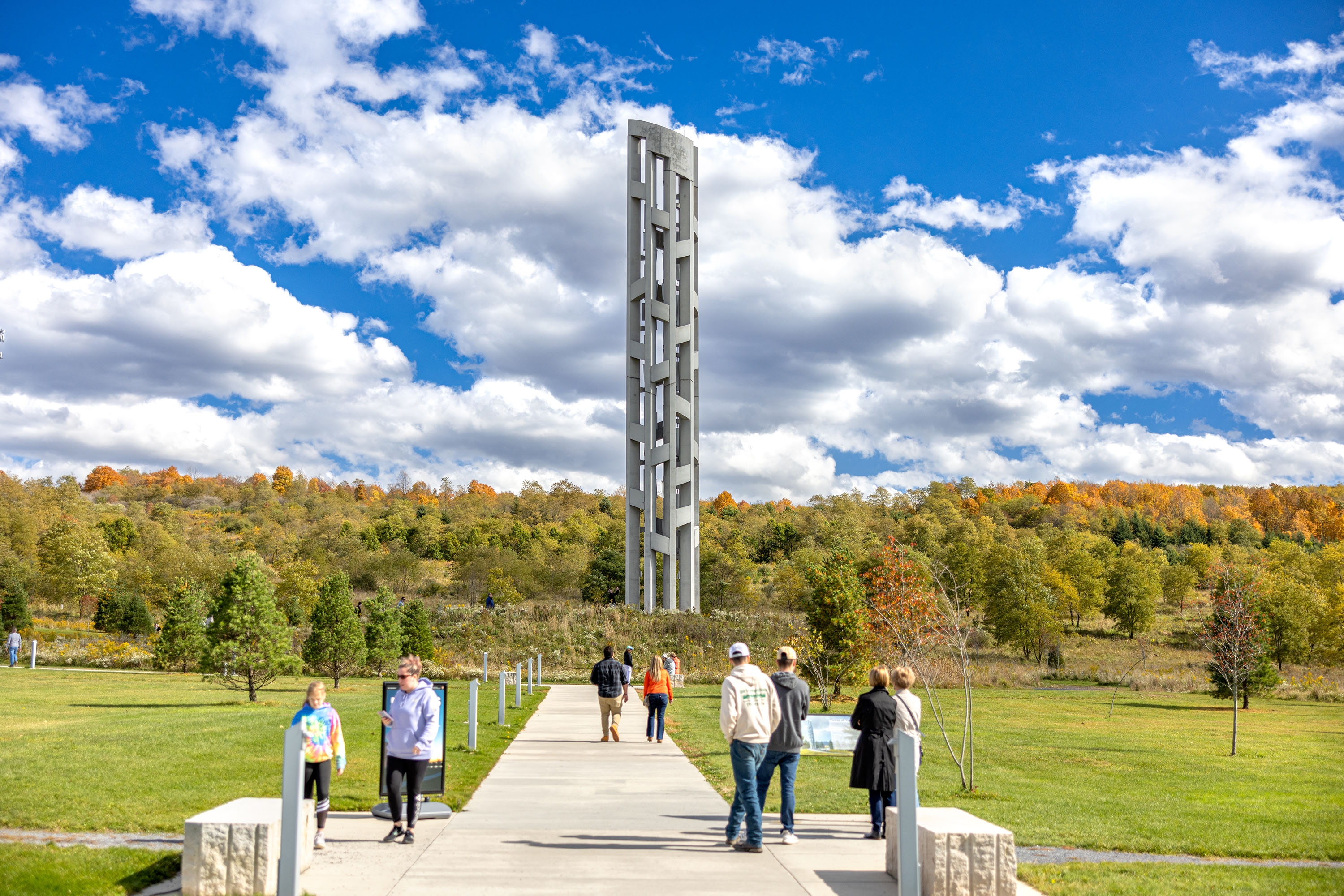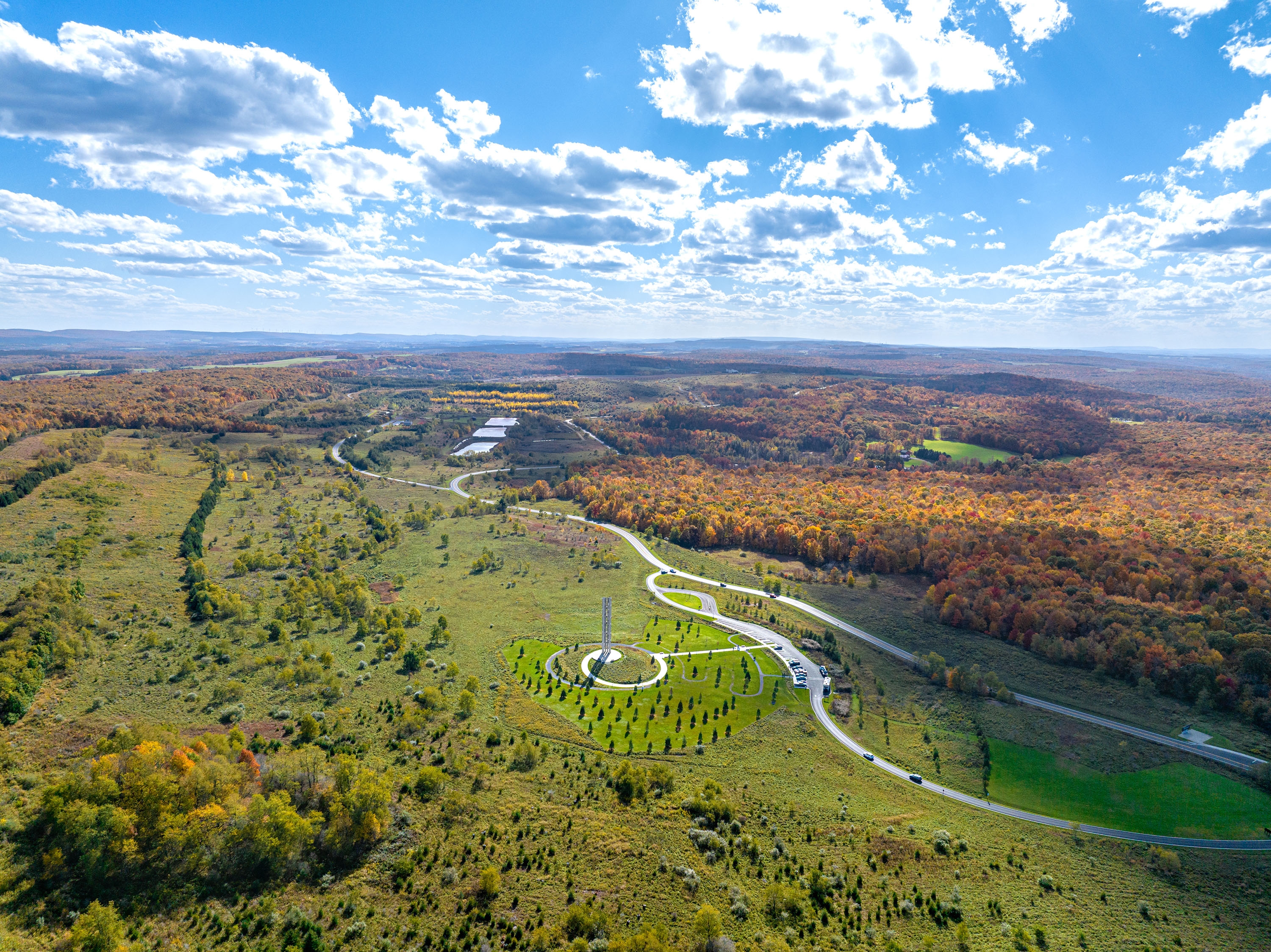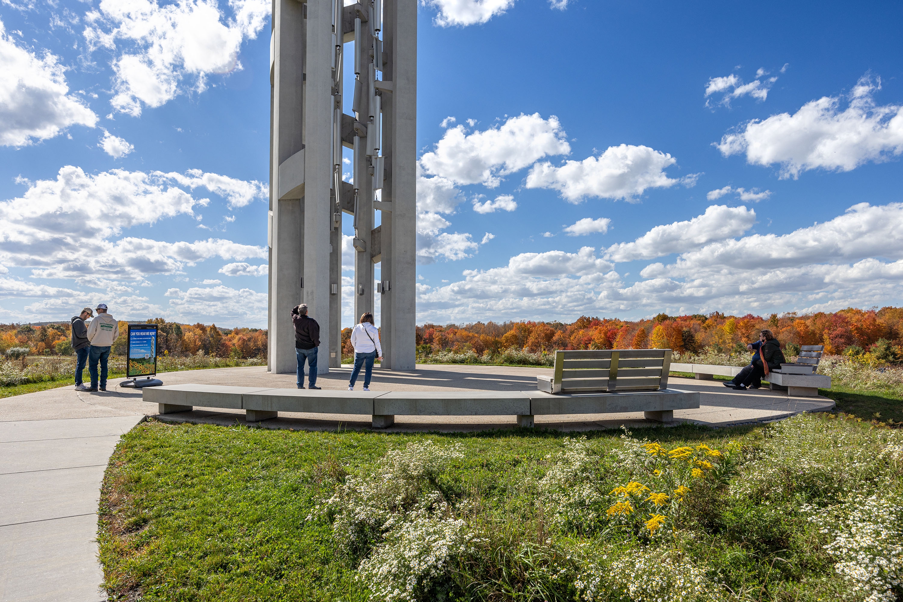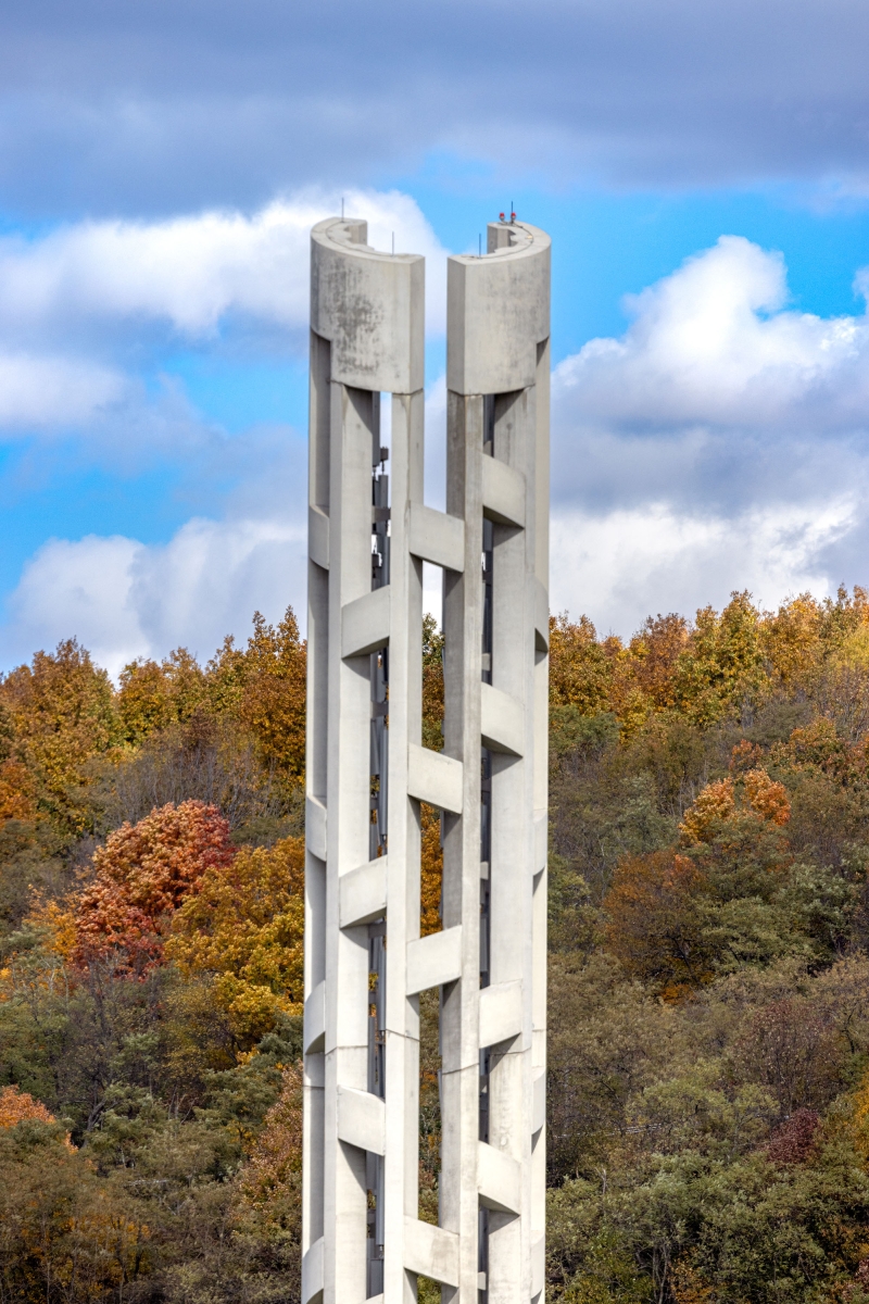 The Tower of Voices is a 93-feet tall musical instrument near the entrance to the Flight 93 National Memorial, a national park located where United Flight 93 crashed on September 11, 2001. The tower holds 40 wind chimes that commemorate the heroic action of 40 passengers and crewmembers onboard the plane, as a living memorial in sound to remember the 40 through their ongoing voices.