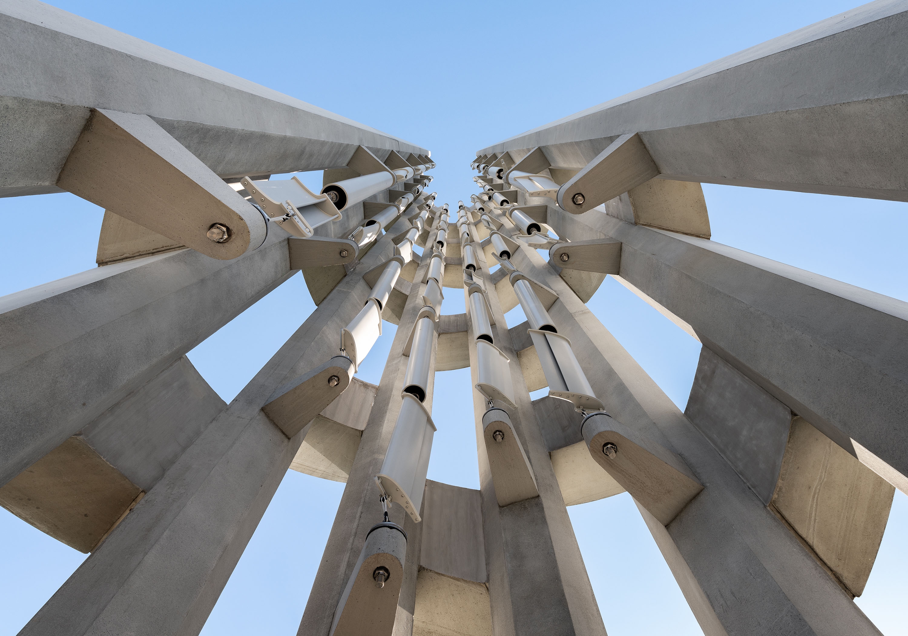 The tower cradles the chimes in a circular form that opens towards an elevated public plaza. Eight precast concrete columns with branch connectors recall the trunk and branch structure of trees in the Hemlock grove at the crash site. Openings between the structural elements allow wind to pass through to activate the chime assemblies with aluminum tubes of various lengths tuned to different frequencies.