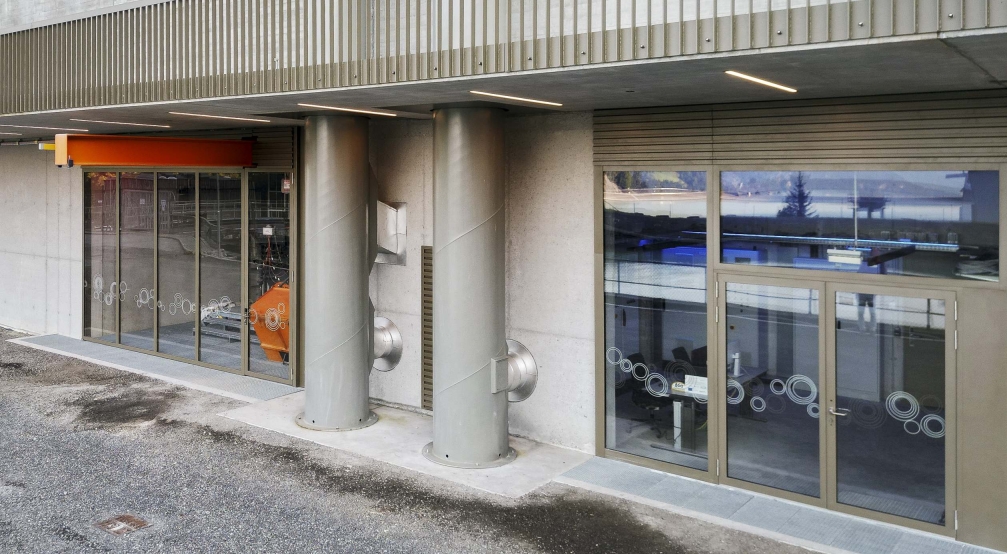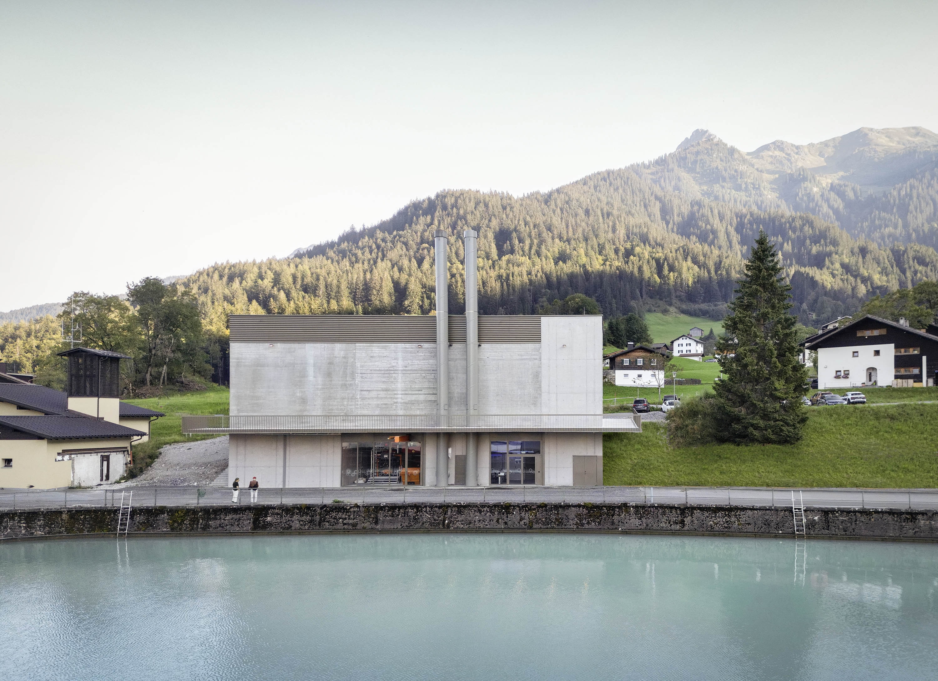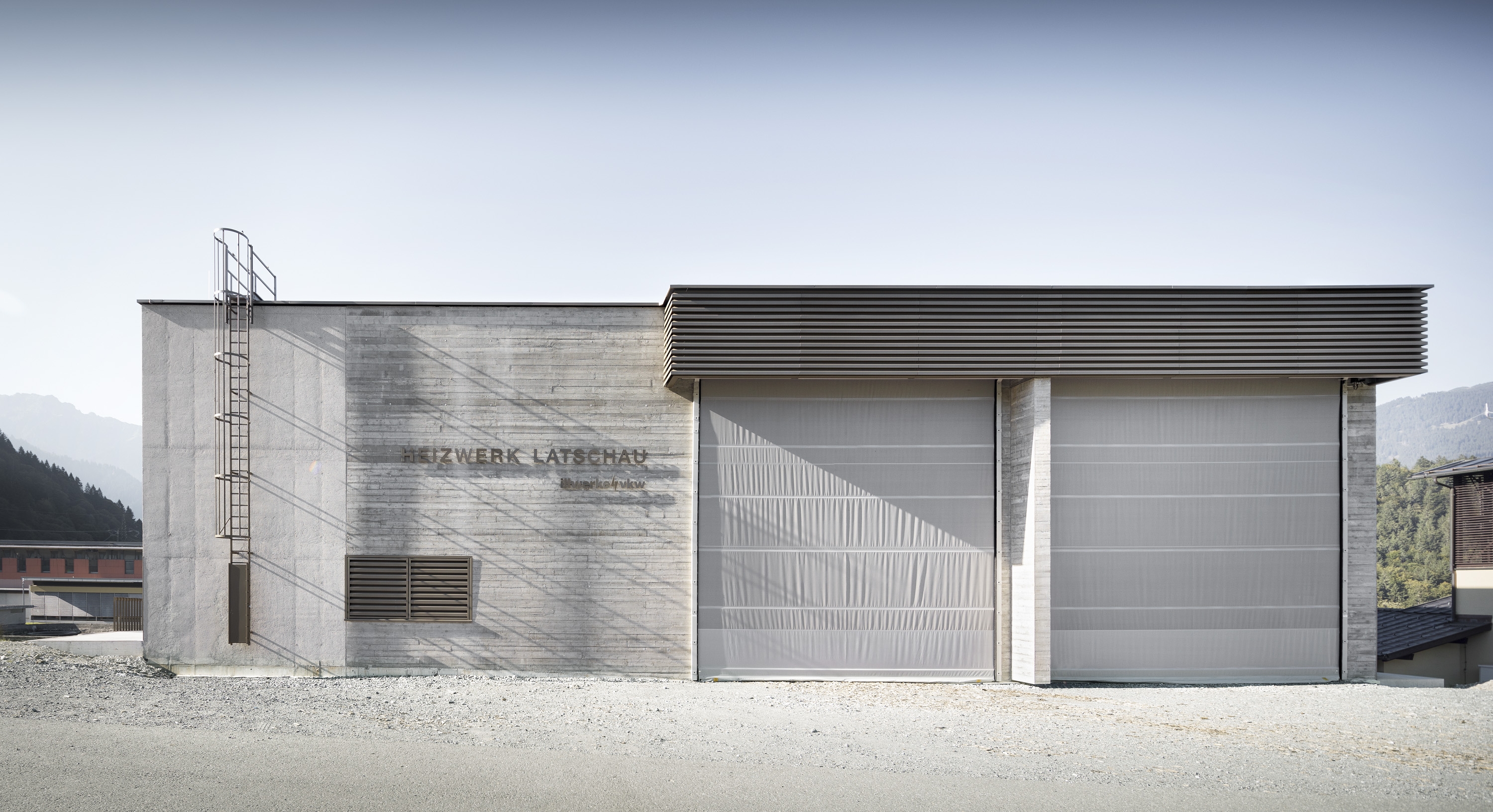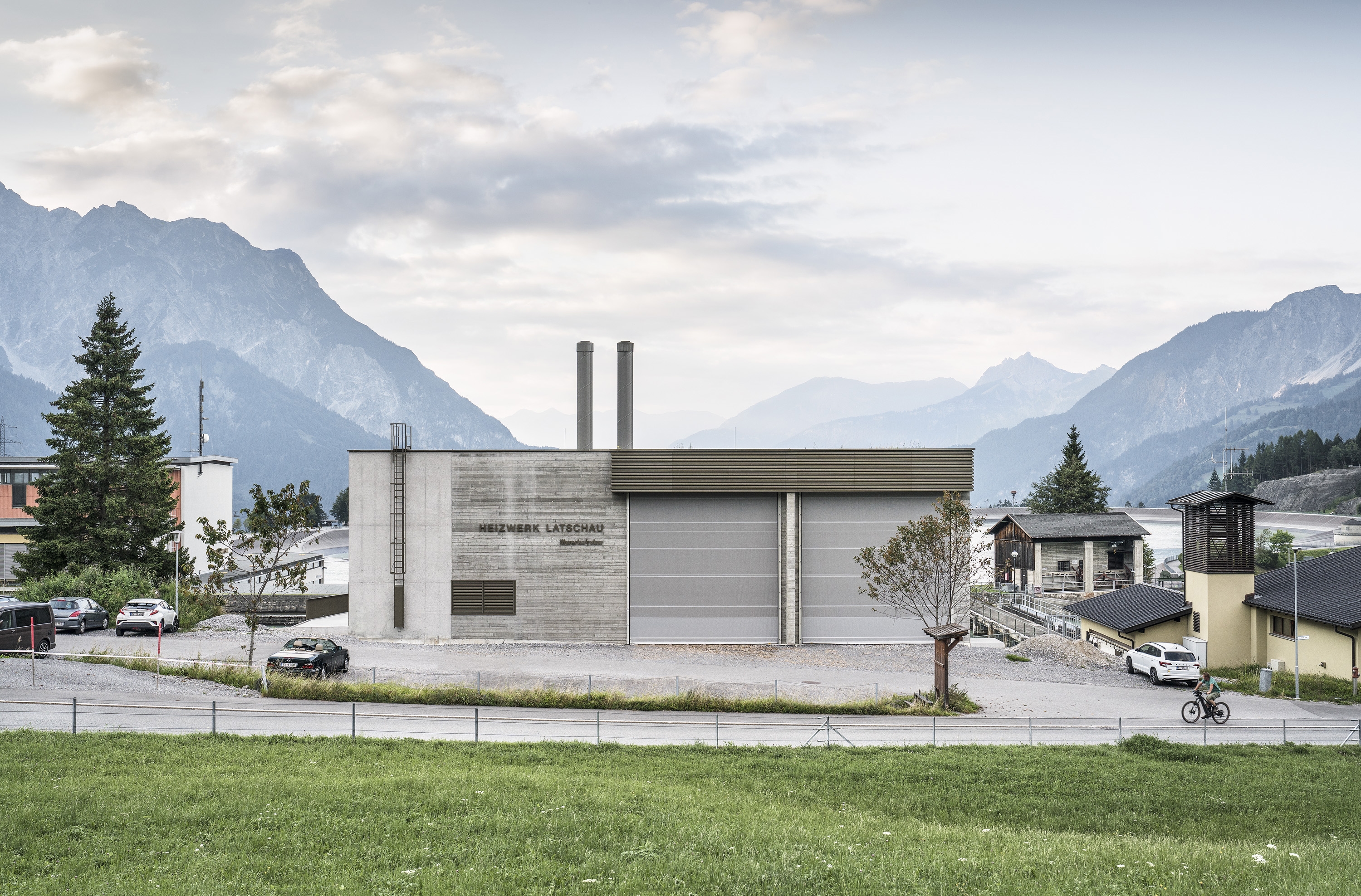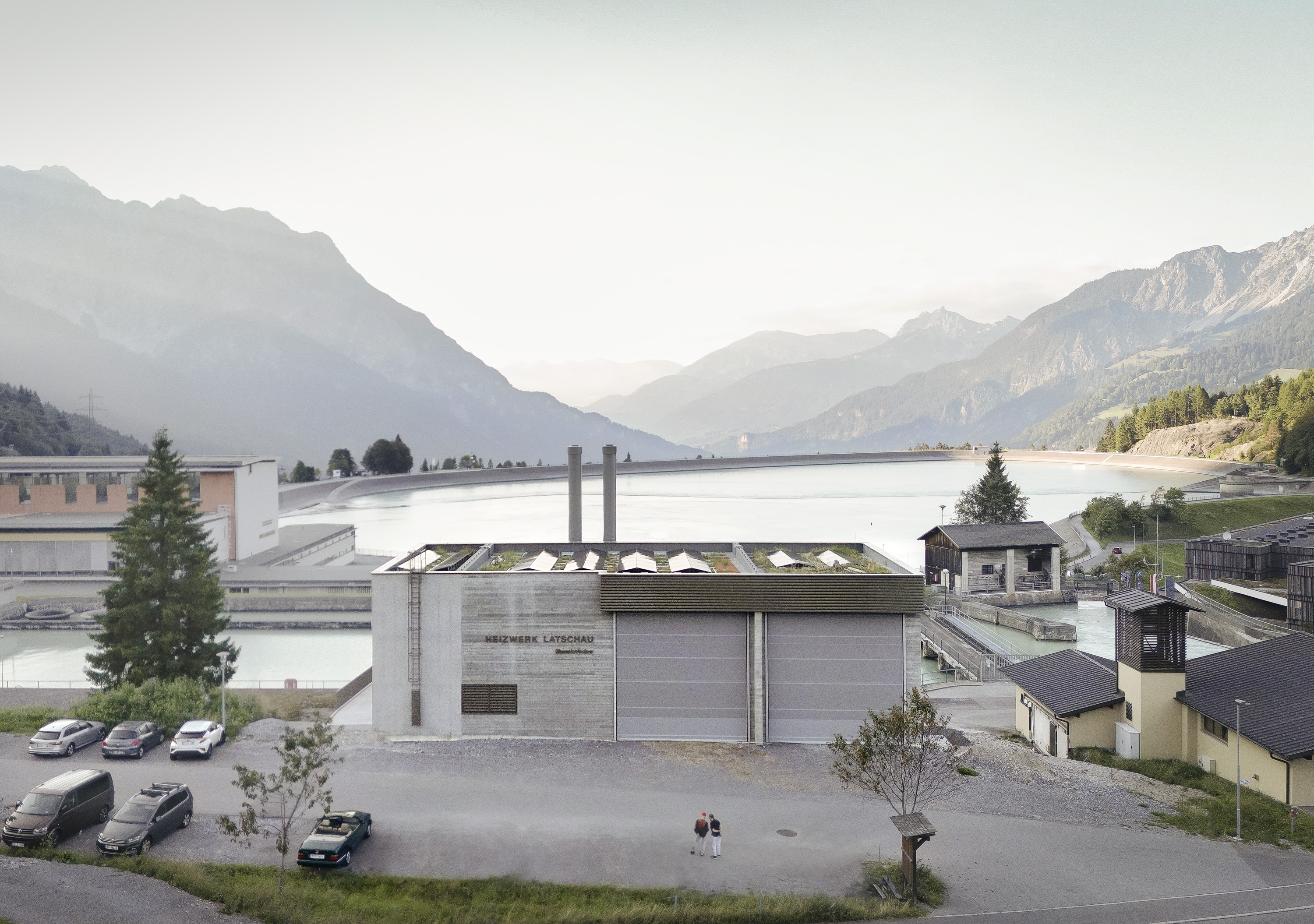 In the case of the Latschau heating plant, building in the Alps means choosing materials and colours in such a way that the building blends into the landscape with the aim of reflecting the elegant monotony of the mountains. A solid concrete body structured by different surface textures and a single spot colour for all metal surfaces are picking up on the surrounding atmosphere and are carrying it forward. A dedicated ecological concept links the building with its surroundings: biomass from the surrounding area as an energy source to feed the local heating network, free cooling from the reservoir to provide cooling capacity for the hotel and the combination of a photovoltaic system and a green roof.