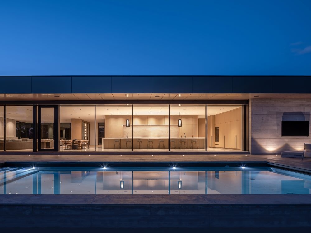 intricately the building interacts with the land, the interplay of shapes and materials, and the livable opulence that will be revealed within. The home is the result of a thorough understanding of and creative response to the site’s conditions. Its T-shape floorplan graphically anchors the massing of the structure and internally organizes the uses, aligning them sequentially. While fortified in the front with a 130ft cantilevered screen, and few windows facing the street, the exact opposite is true at the rear portion. Here south-facing, structure-wrapping glass walls allow the home to open completely to the nature of the site, with views as far as the horizon allows.