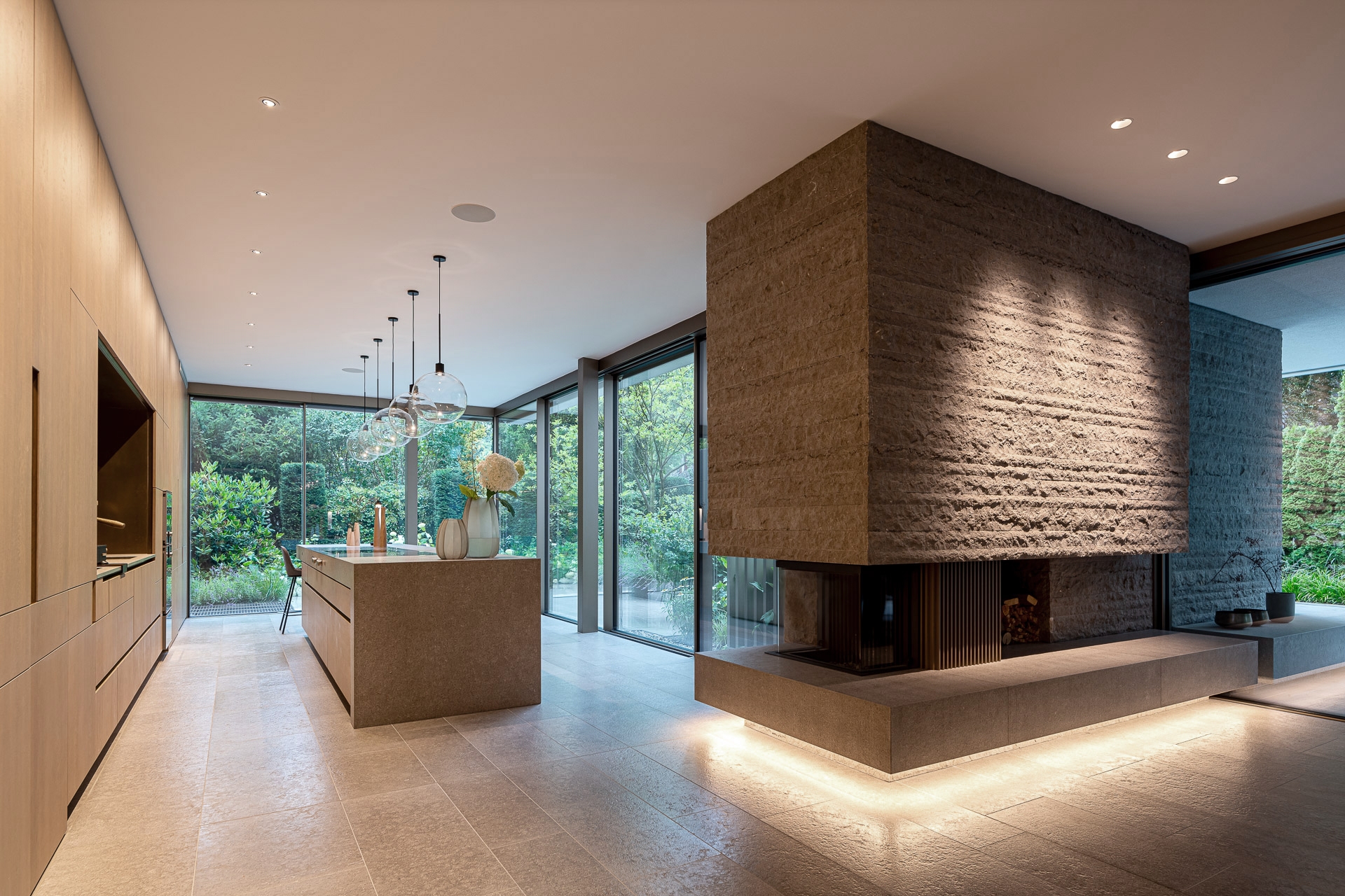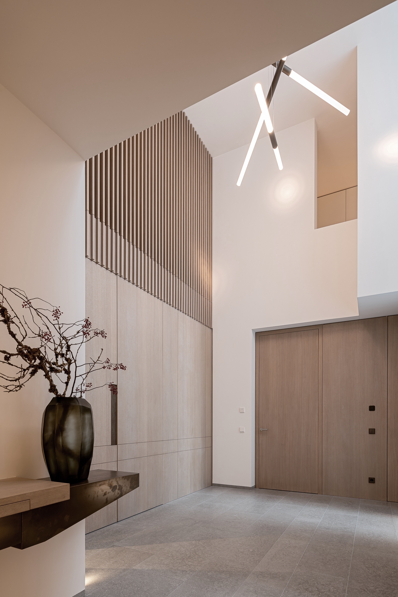 A unique light feature in the entree was handcrafted by world famous Austrian Bartenbach Lichtdesign.