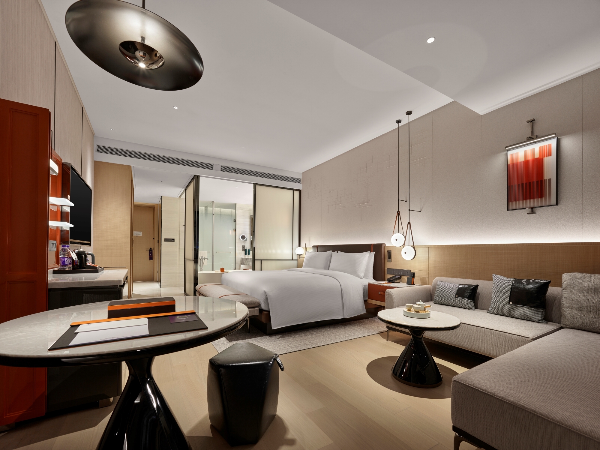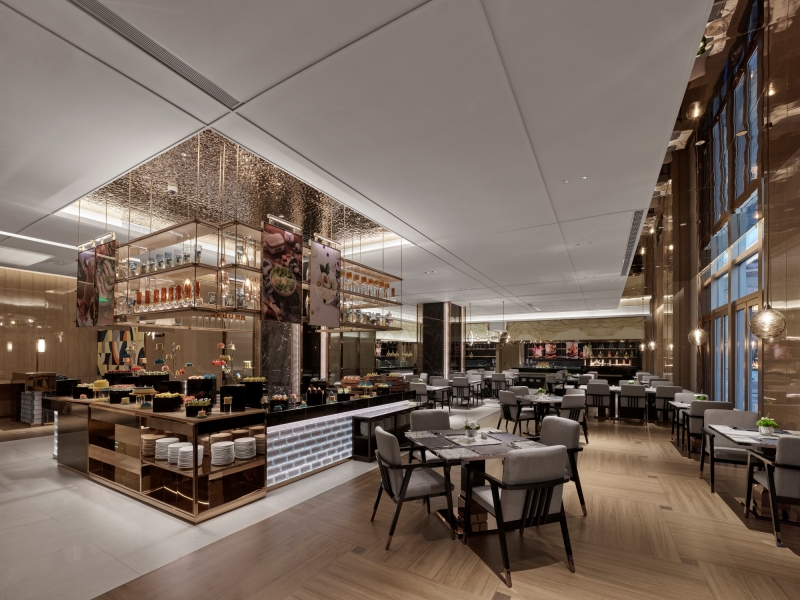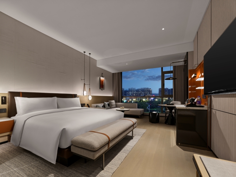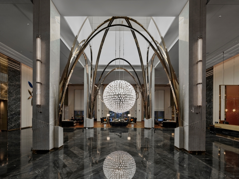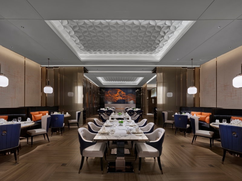 It draws inspiration from the "Mountain-Sea Homestead," making every design detail a dance between art and inspiration, abstractly interpreting the new vibe of Cangnan life. DoubleTree by Hilton Cangnan embraces the landscape between the mountains and the sea with an inclusive gesture, sketching a vision of life in southern Zhejiang. The entrance of the lobby is extracted from the shape of Faberge eggs, symbolizing abundance and rebirth. 888 hand-blown azaleas in bloom symbolize health, beauty. The lobby bar features a high-grade dark marble floor and grey walls, creating a simple tone. The all-day dining restaurant takes a modern approach to tradition. The Chinese restaurant has a symmetrical approach throughout the spatial structure and the layout of the dining tables and chairs. The private rooms of Chinese restaurant are wrapped in pastel colored finishes with oriental motifs seamlessly integrated with contemporary furniture. The hotel has a total of 329 rooms, including 35 suites. The furnishings, details, and lighting in various places are all telling the mood of Cangnan, where the simple beauty of nature and the deep affection of humanity reflect each other.