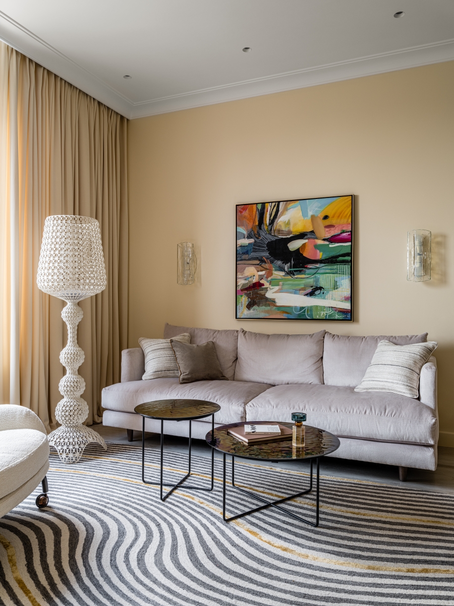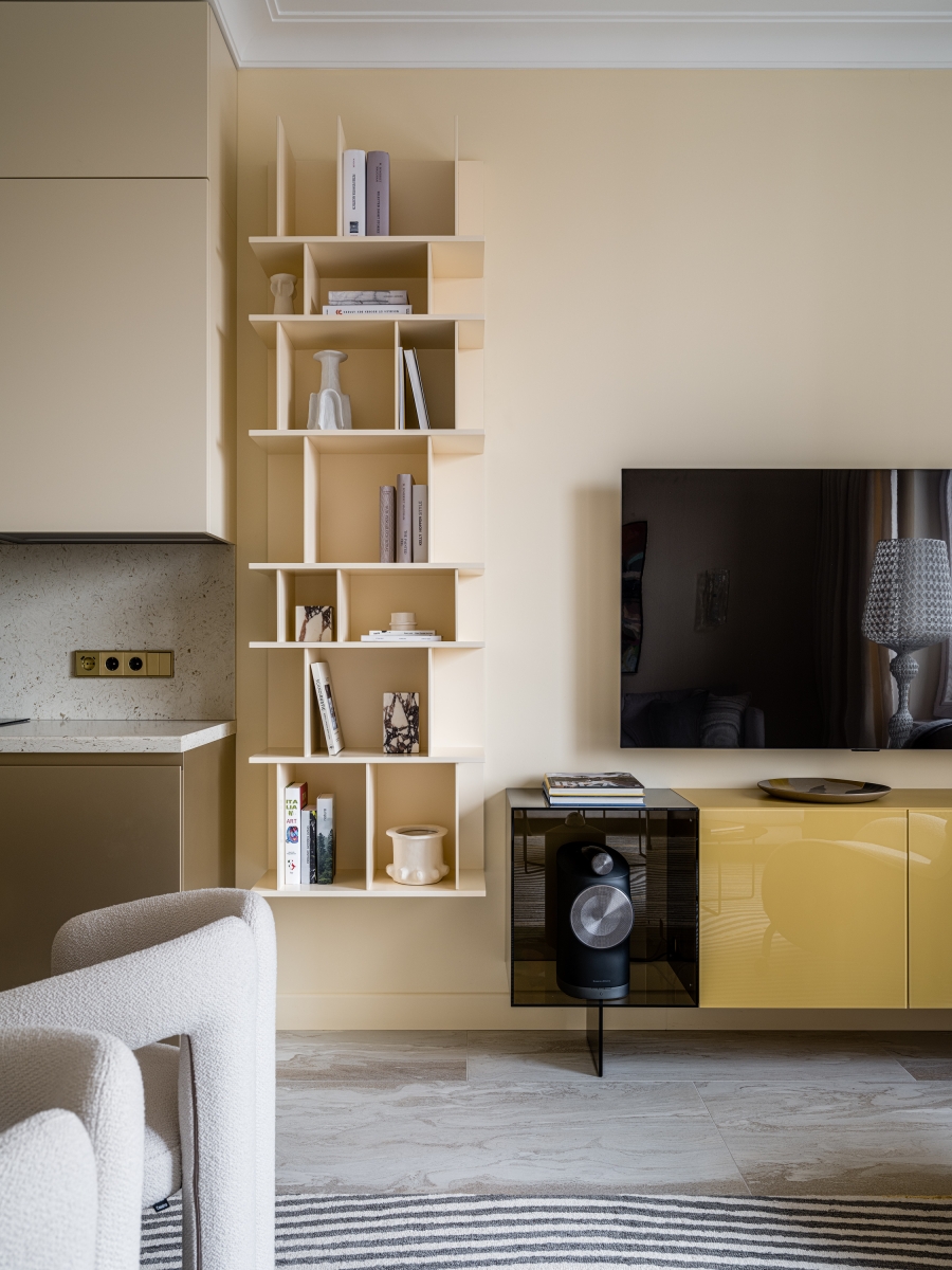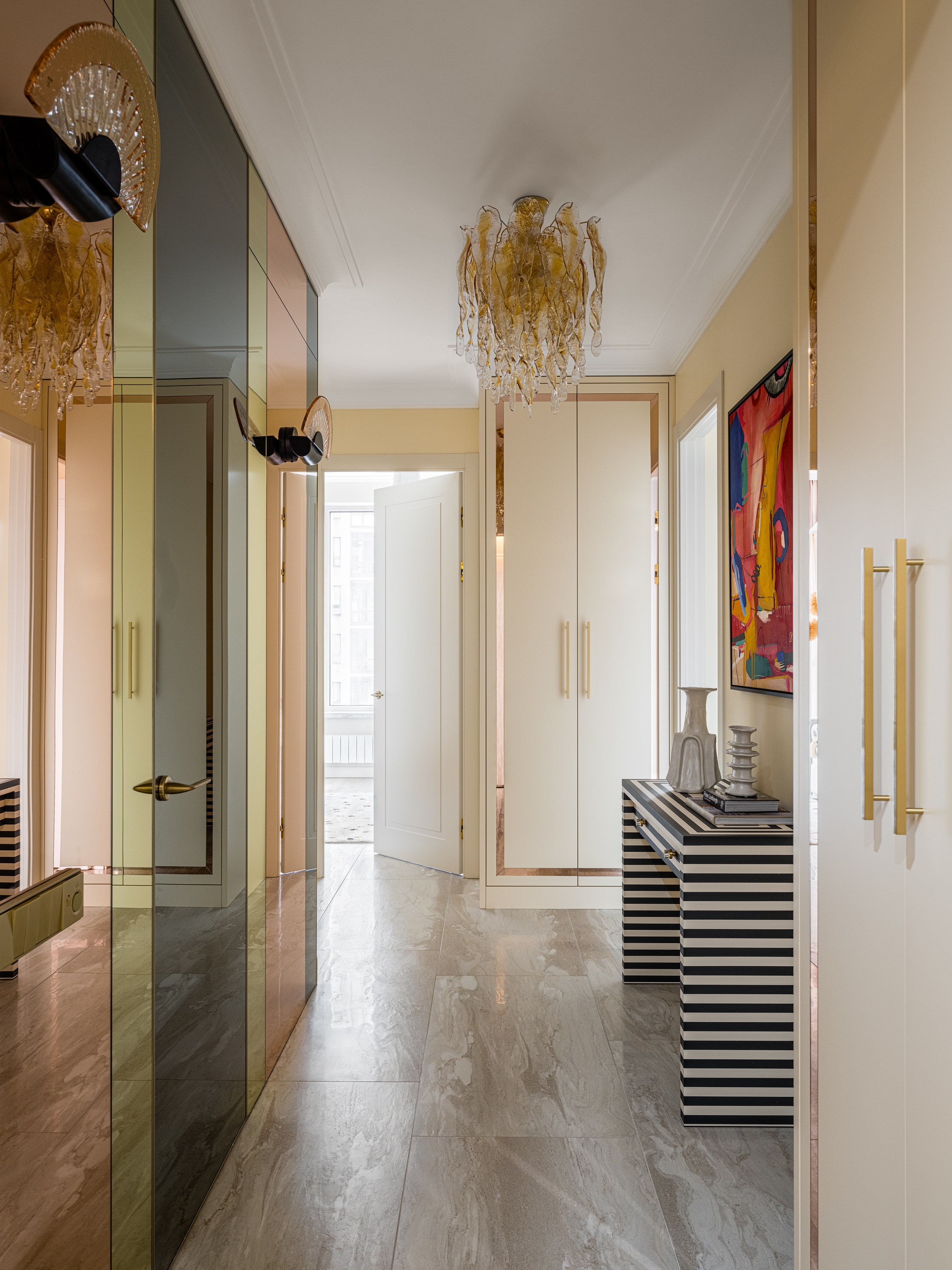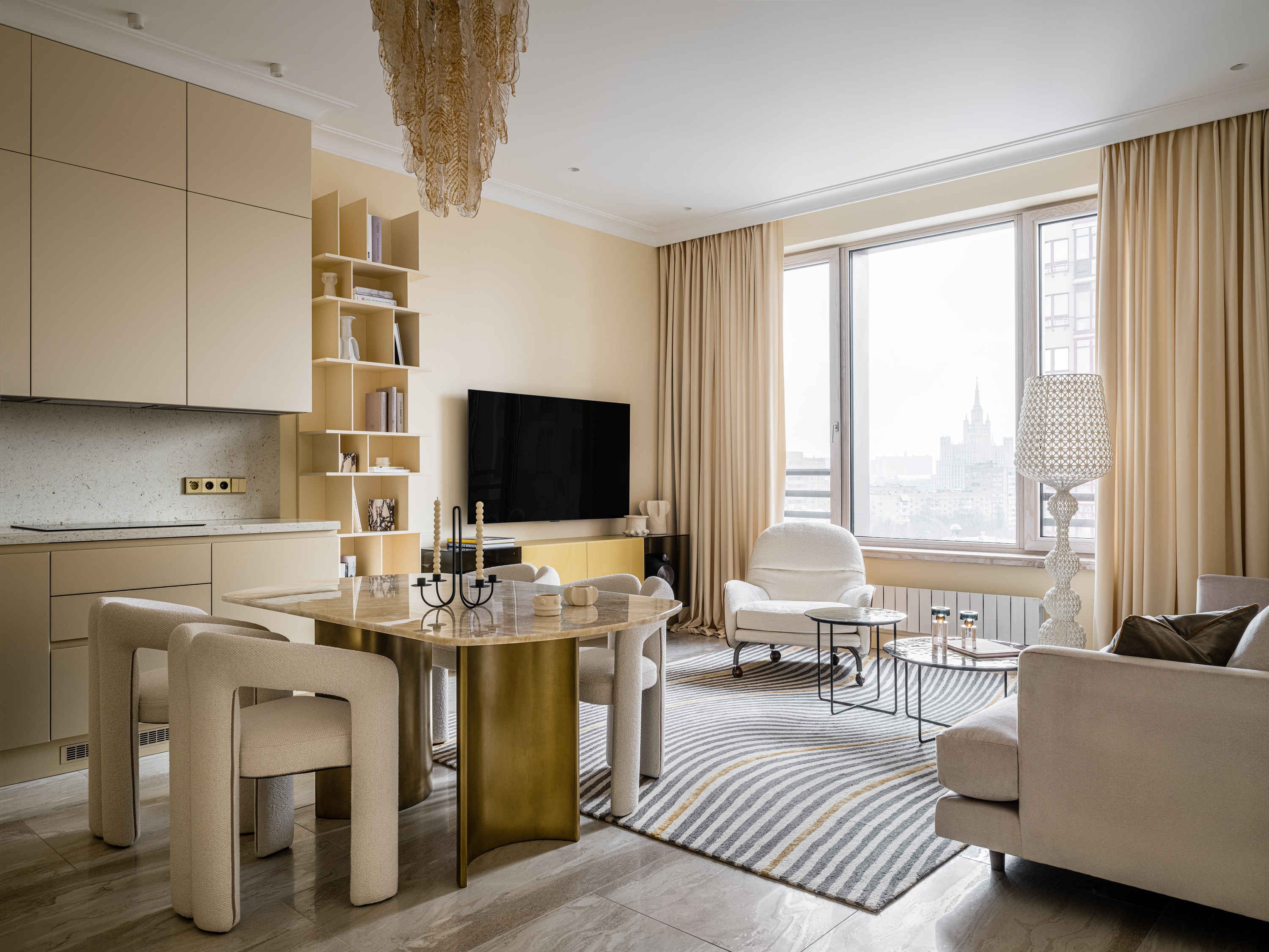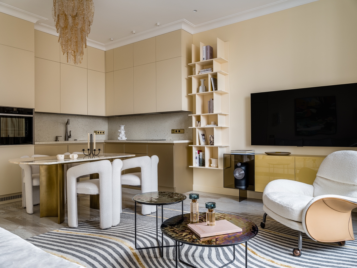 We are constantly in a rush living in big cities. But sometimes it is really worth to slow down this breakneck pace a bit, pause, look around and start to see and appreciate life around us. To enjoy the “here and now” moment, the small things and everyday moments. We called the project La Dolce Vita as the client is a busy financial advisor working non-stop in the office and this apartment is her shelter from the intense work. The apartment enjoys the rare Moscow sun and we wanted to "keep" the sun as long as possible - filling the apartment with the warmth by introducing the light creme brûlée colour of the walls in the whole apartment. The homogeneous colour integrates the whole apartment and makes your journey smooth and relaxed. The colour palette of the furniture is light and the shapes are rounded and smooth thus inviting to relax and indulge. The accents are done by a few bright pictures on the walls and pieces of furniture. There are a lot of mirrors and polished surfaces in the apartment which beautifully reflect the light. The wall-size coloured mirrors visually enlarge the entry area and hide the walk-in wardrobe. Thus the monochrome colour palette is vivid and playful.