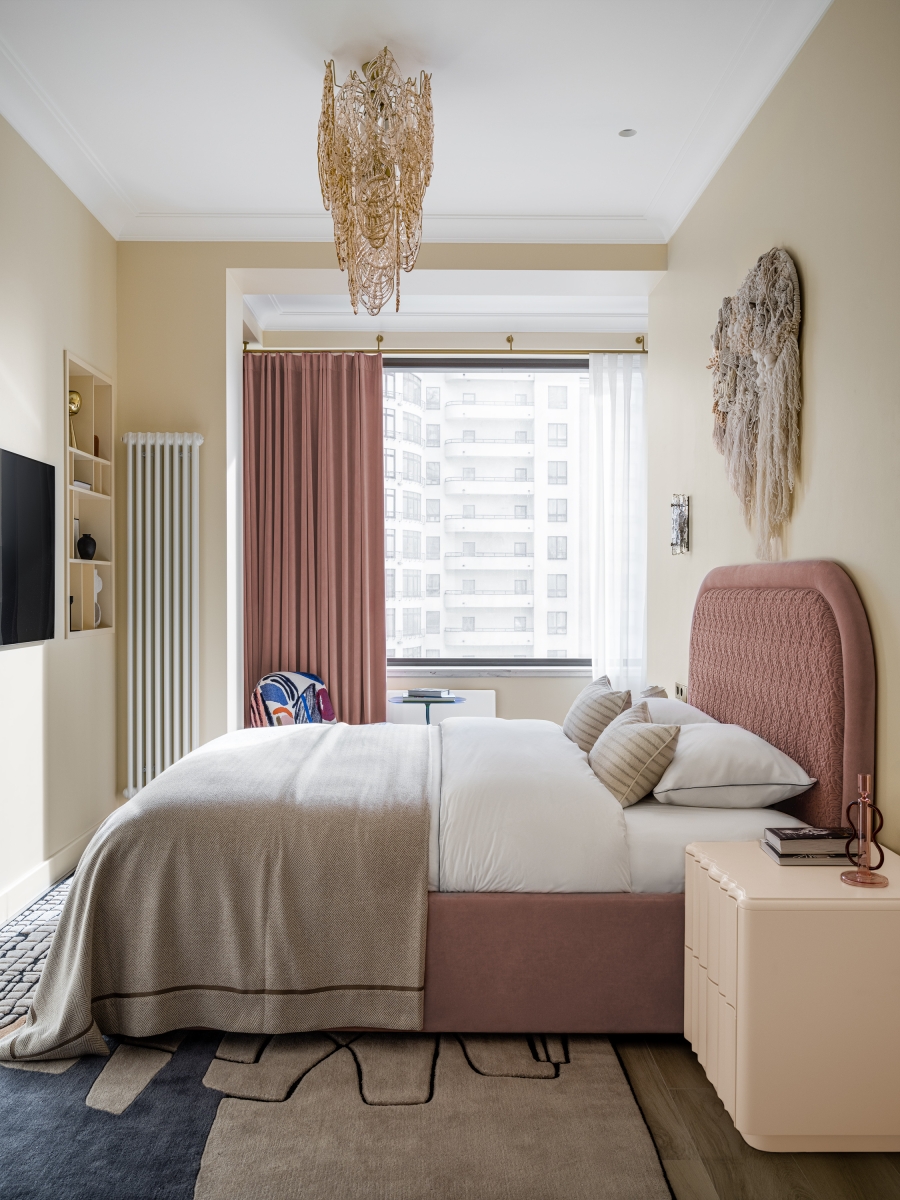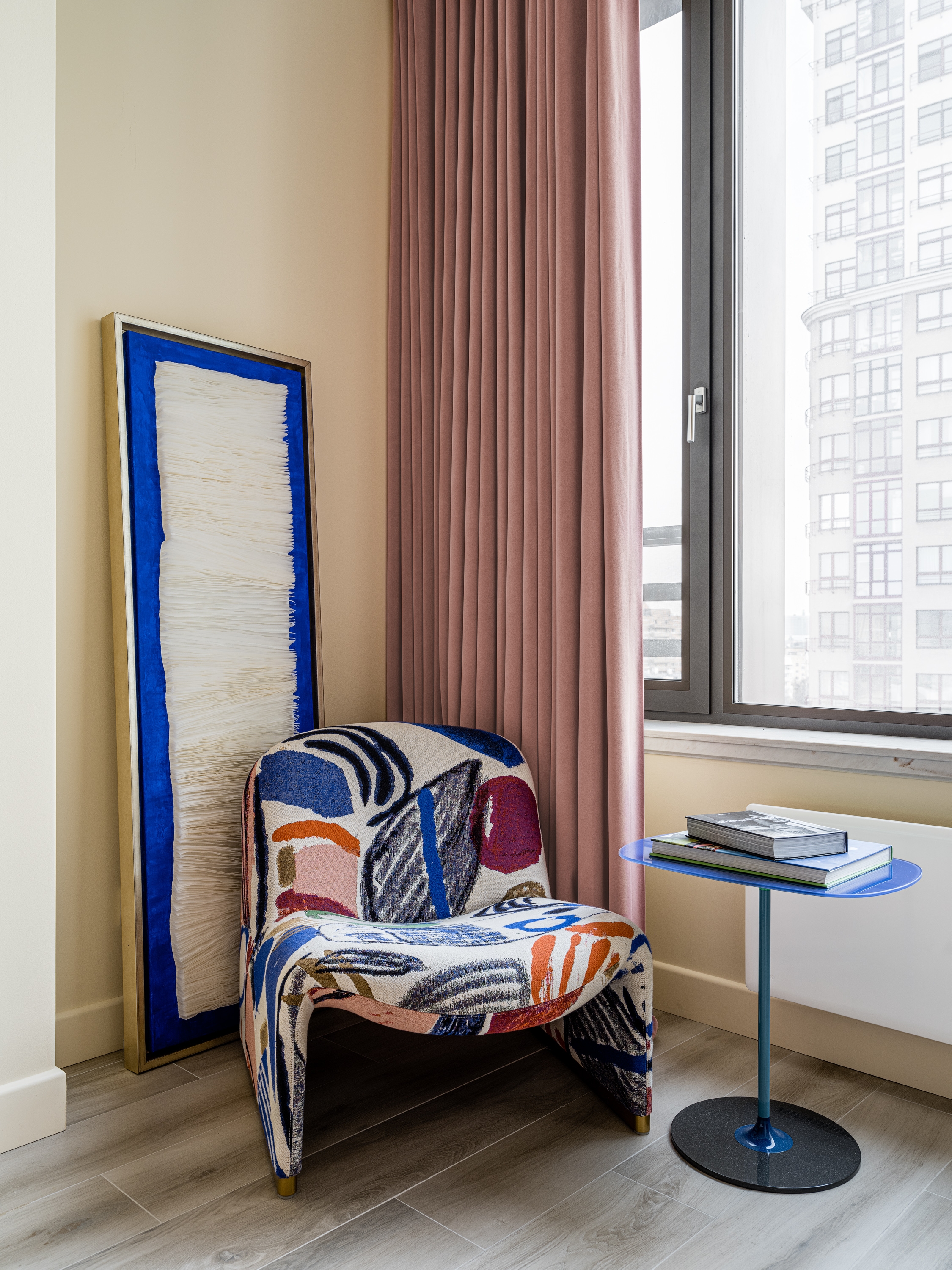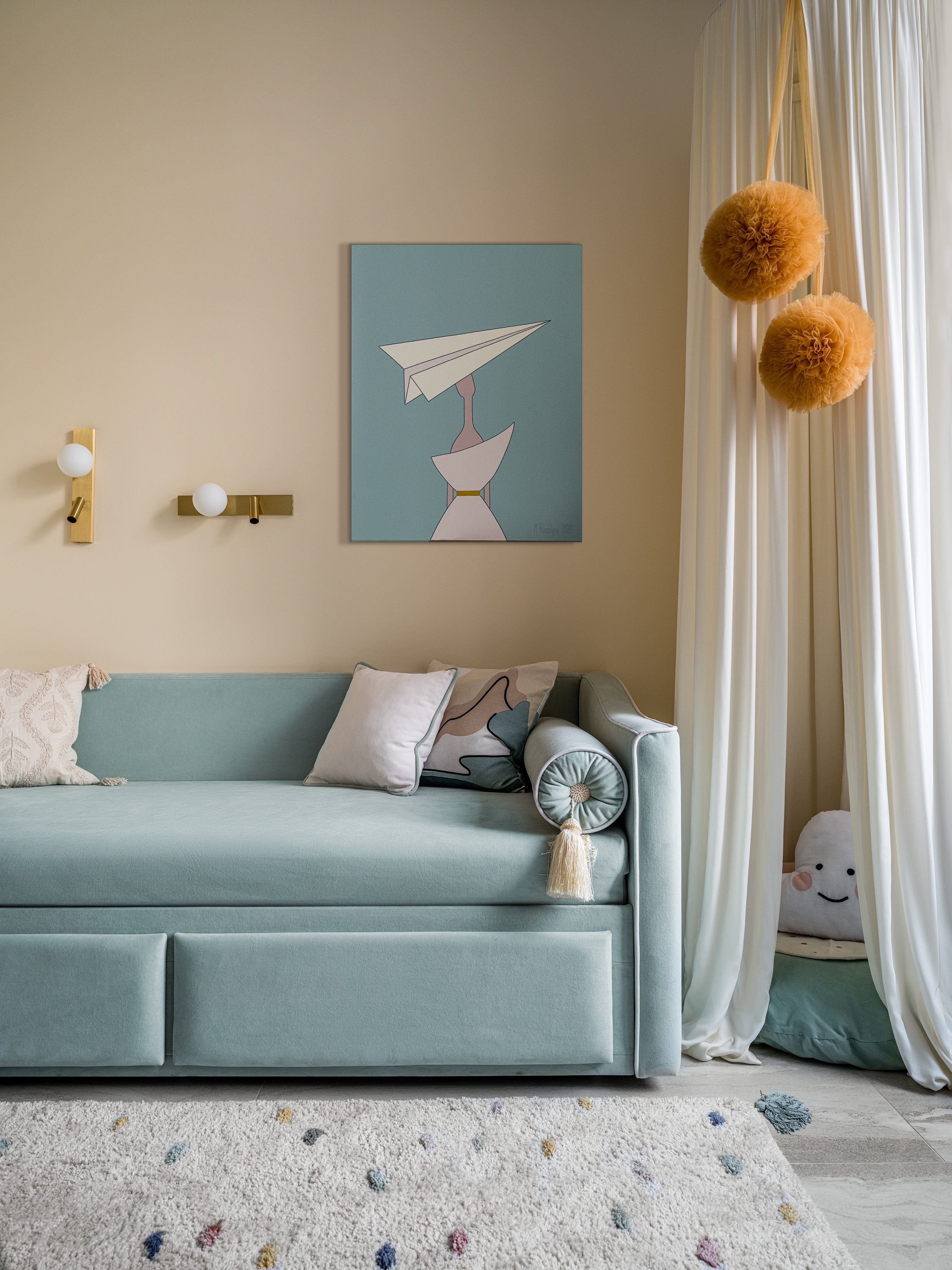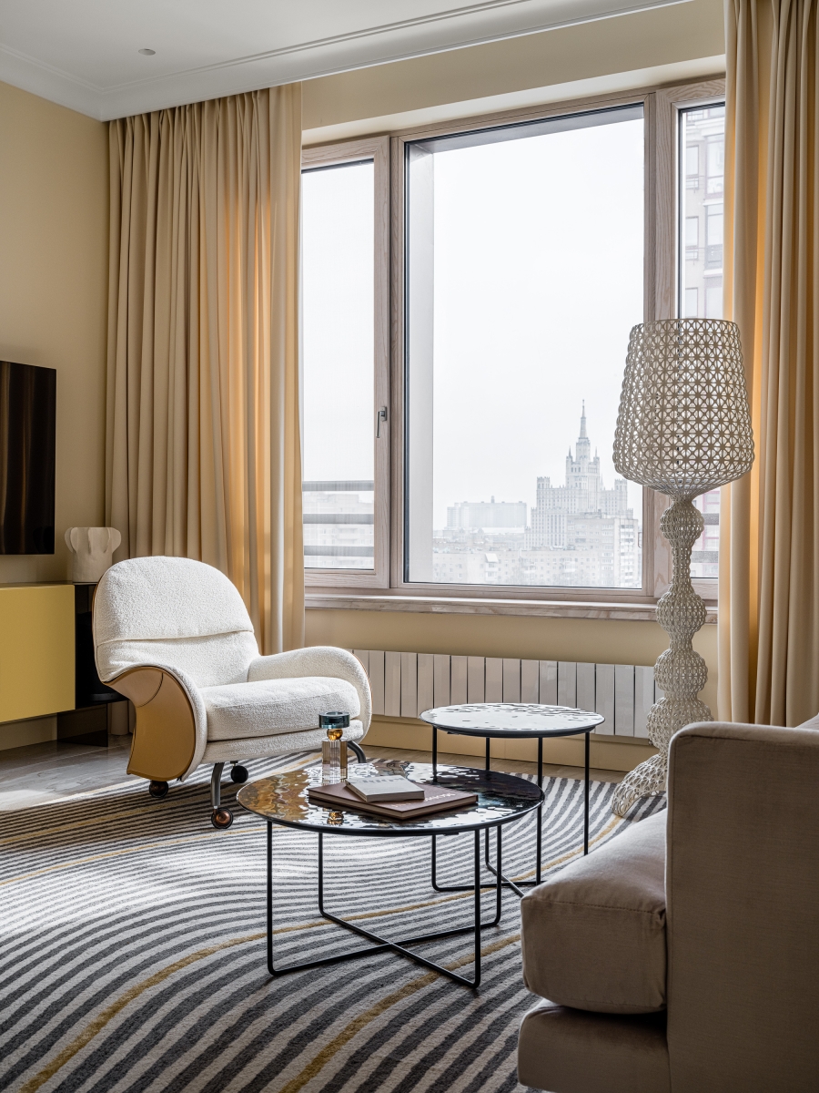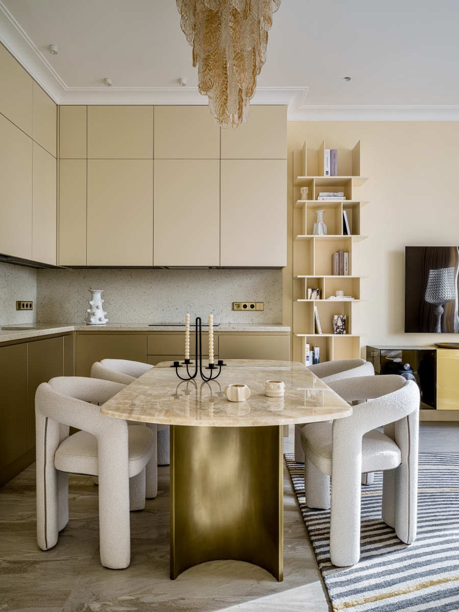 We are constantly in a rush living in big cities. But sometimes it is really worth to slow down this breakneck pace a bit, pause, look around and start to see and appreciate life around us. To enjoy the “here and now” moment, the small things and everyday moments. We called the project La Dolce Vita as the client is a busy financial advisor working non-stop in the office and this apartment is her shelter from the intense work. The apartment enjoys the rare Moscow sun and we wanted to "keep" the sun as long as possible - filling the apartment with the warmth by introducing the light creme brûlée colour of the walls in the whole apartment. The homogeneous colour integrates the whole apartment and makes your journey smooth and relaxed. The colour palette of the furniture is light and the shapes are rounded and smooth thus inviting to relax and indulge. The accents are done by a few bright pictures on the walls and pieces of furniture. There are a lot of mirrors and polished surfaces in the apartment which beautifully reflect the light. The wall-size coloured mirrors visually enlarge the entry area and hide the walk-in wardrobe. Thus the monochrome colour palette is vivid and playful.