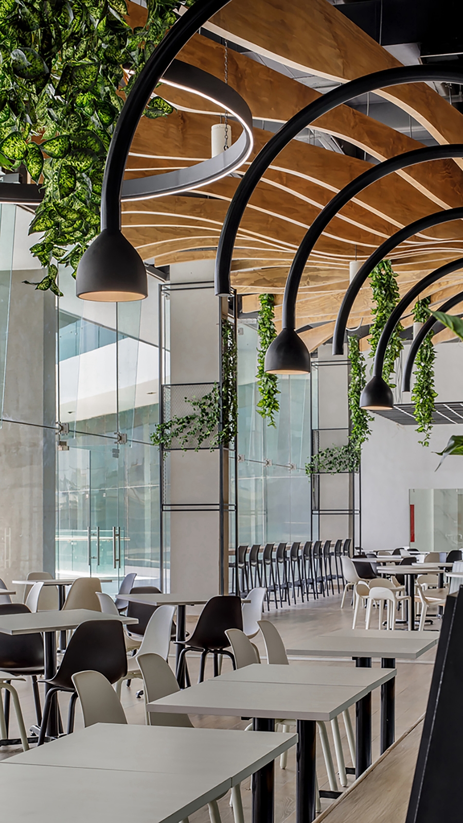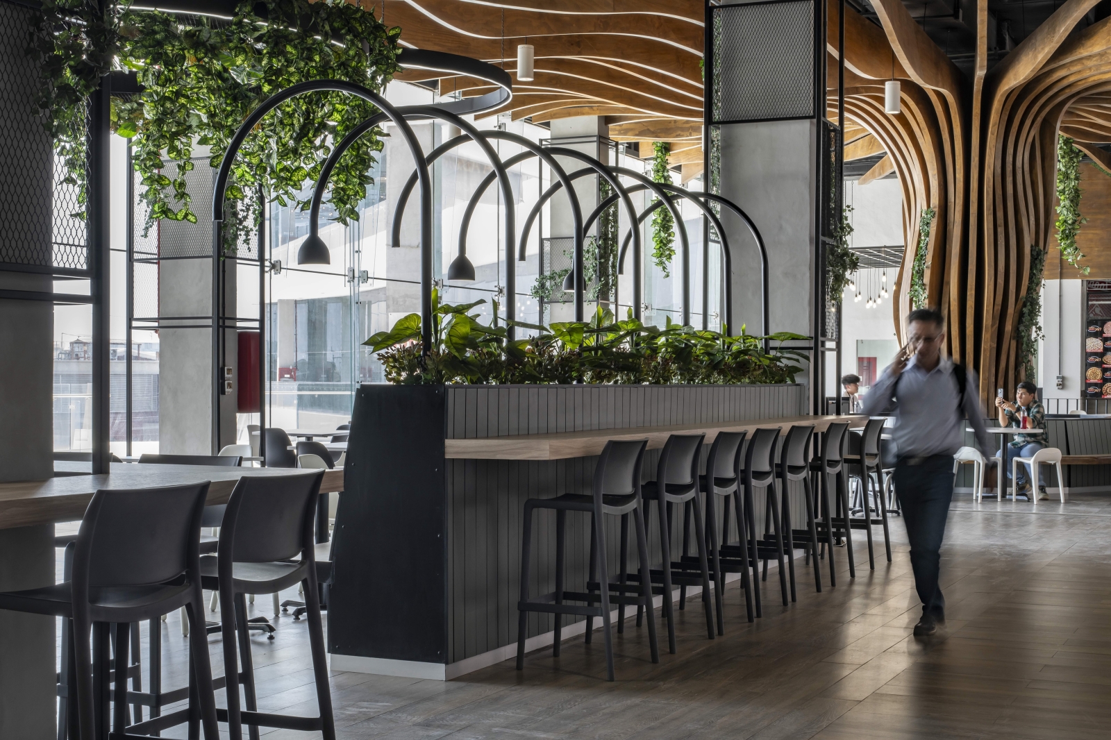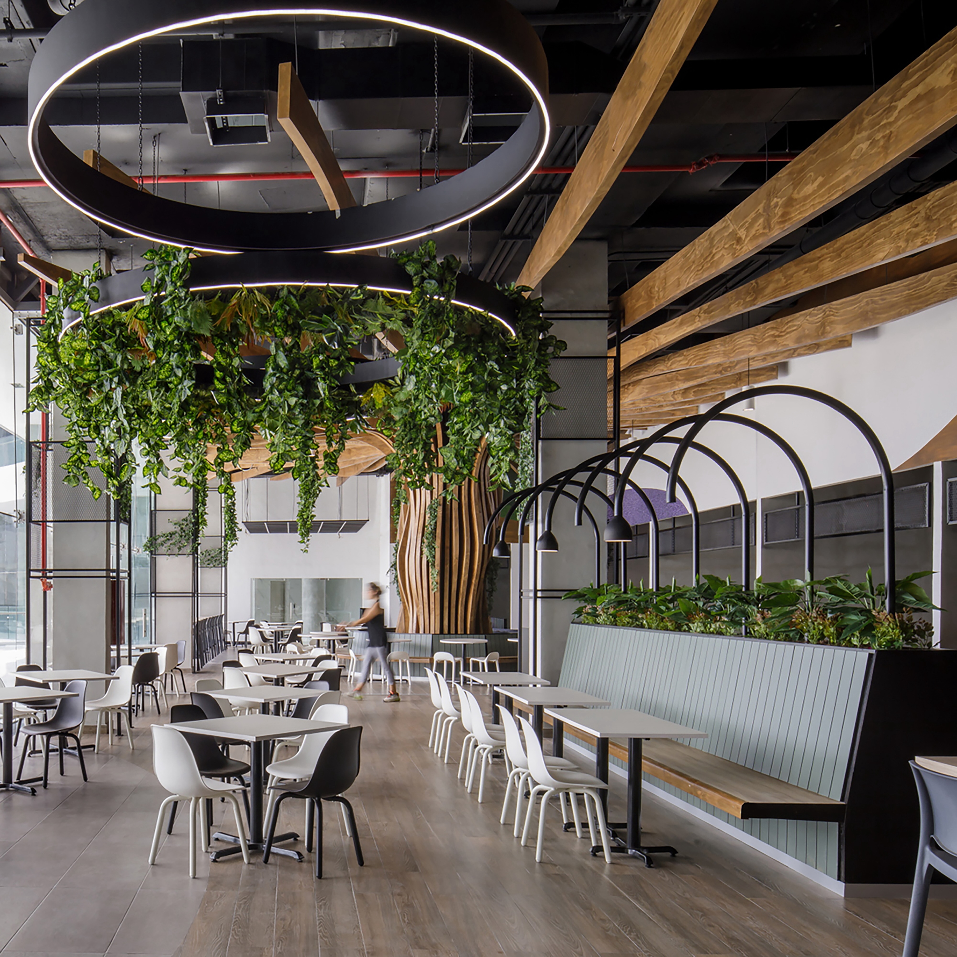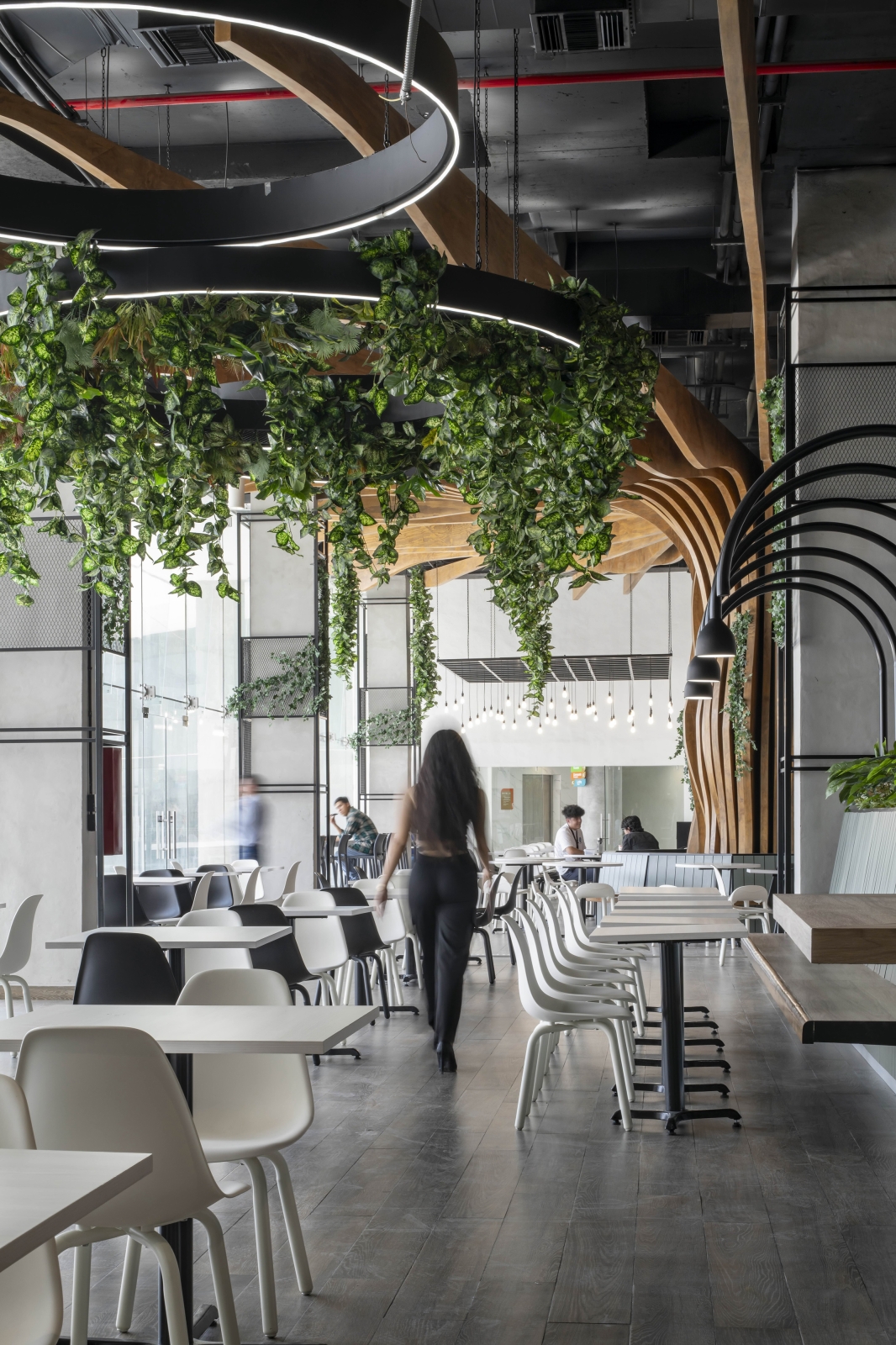The lighting design complements and softens the design of the tree, both on the ceilings, with circles that also support natural vegetation, as well as those that are born from planters and fall with a half circle on the tables, generating a 100% biophilic space.