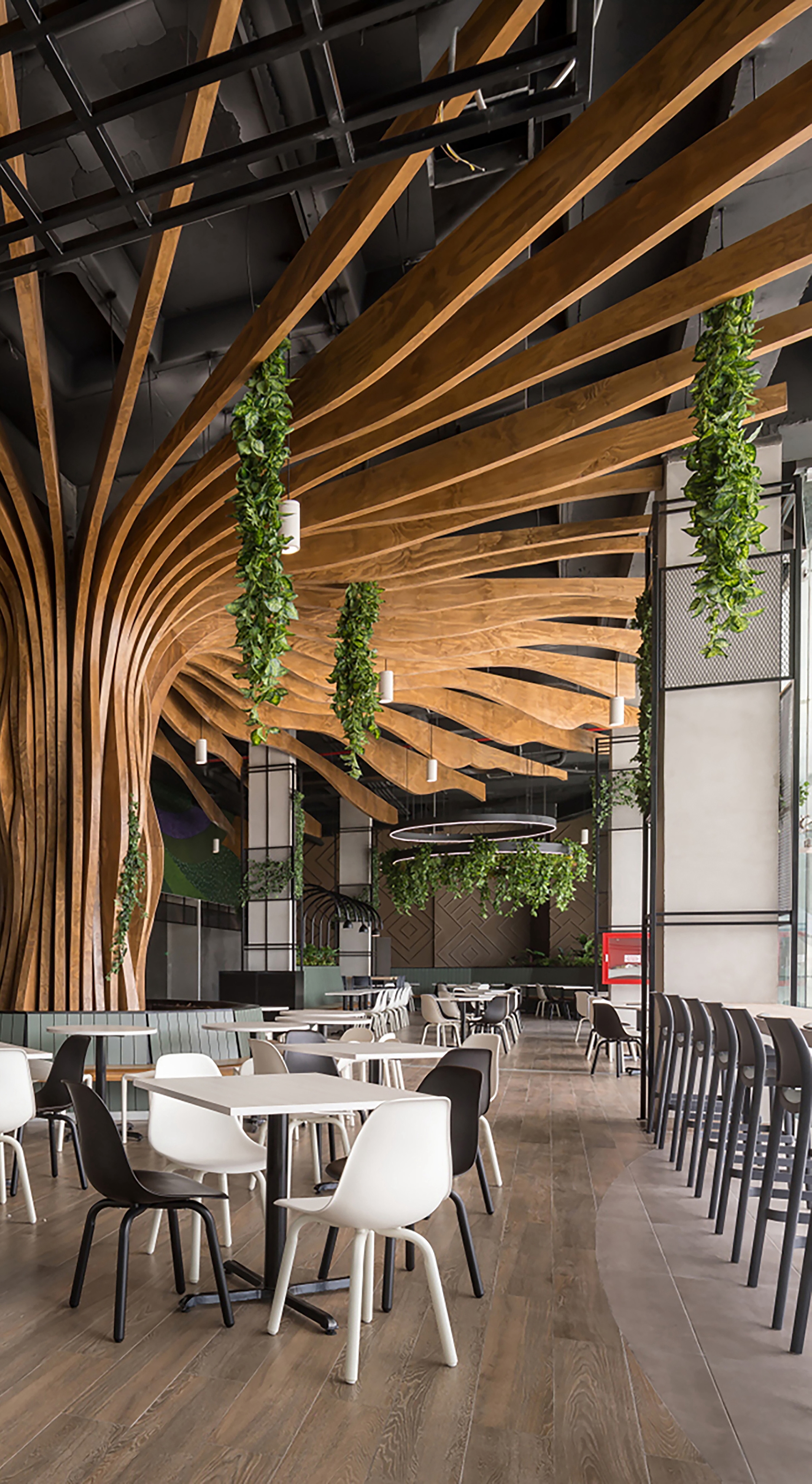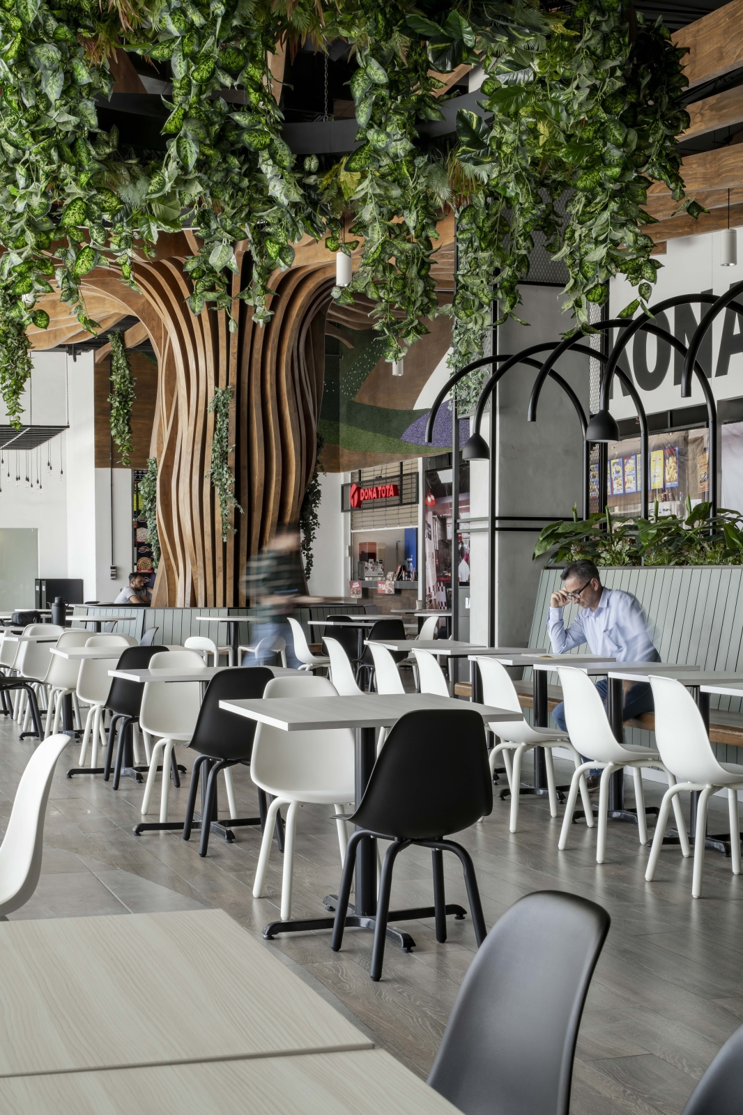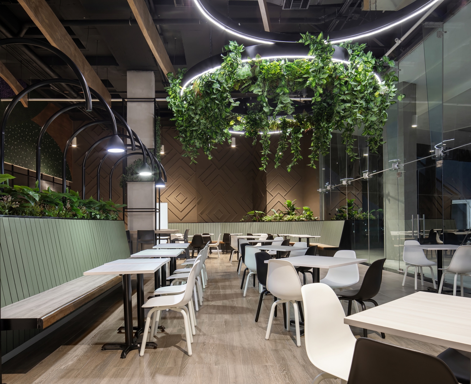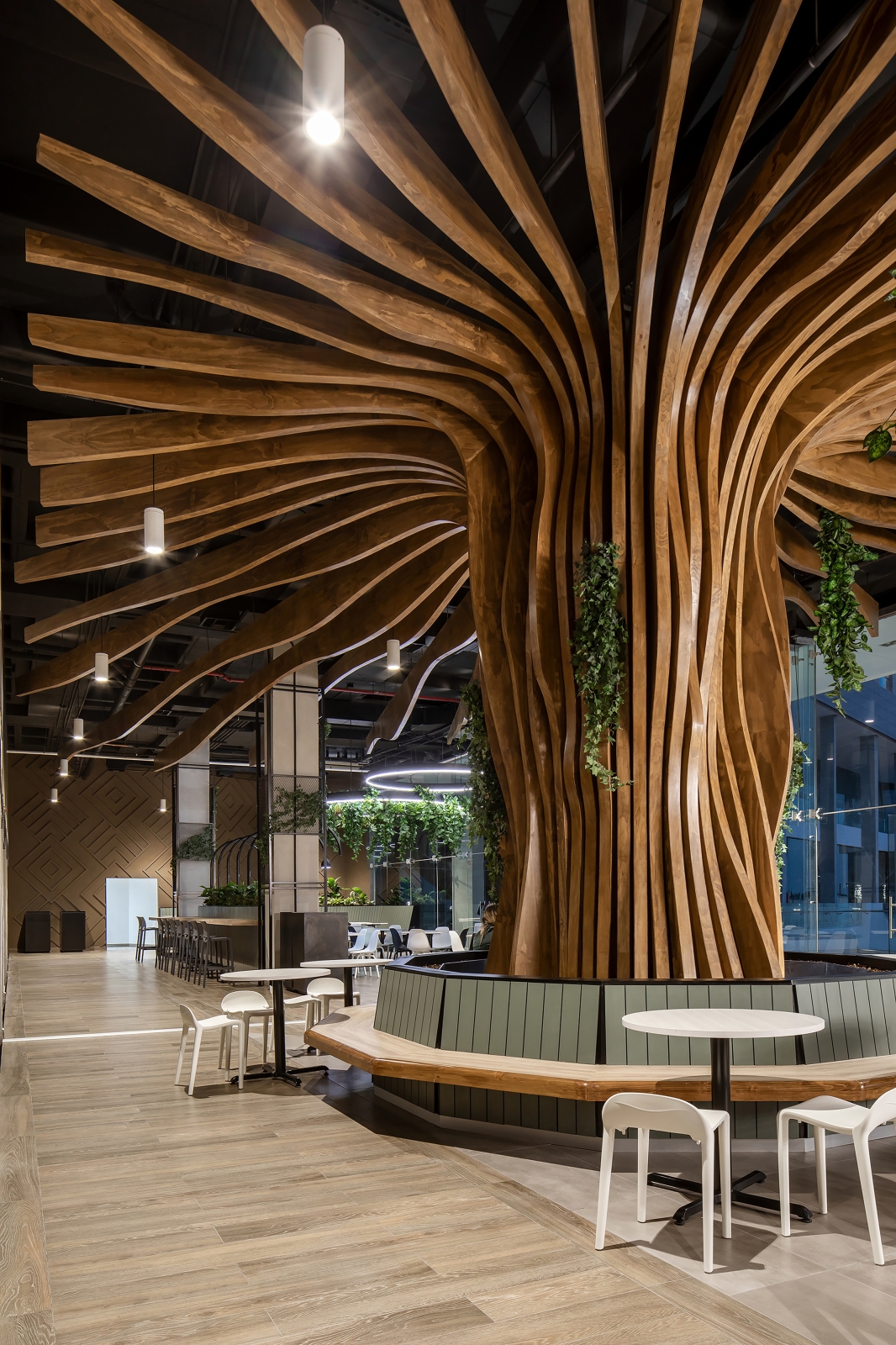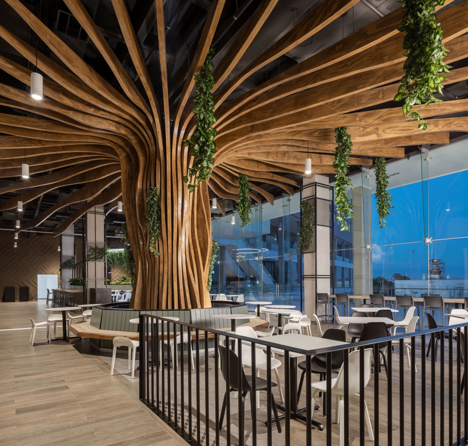The lighting design complements and softens the design of the tree, both on the ceilings, with circles that also support natural vegetation, as well as those that are born from planters and fall with a half circle on the tables, generating a 100% biophilic space.