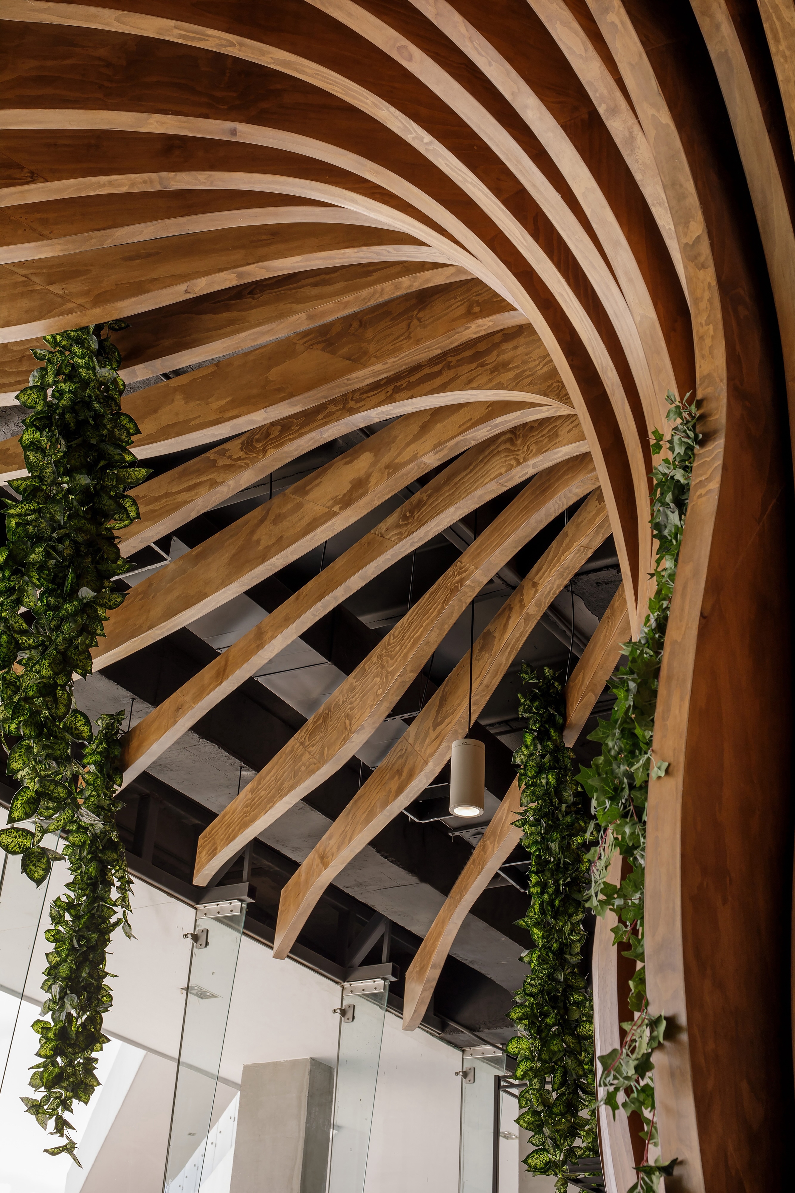 The concept is based on the idea of a tree, an oasis within the hectic neighborhood. The stereotomic weave of Chilean pine wood, starting from the center or trunk of this tree, is distributed throughout the space like branches, welcoming the users and forgetting that they are inside a corporate building.