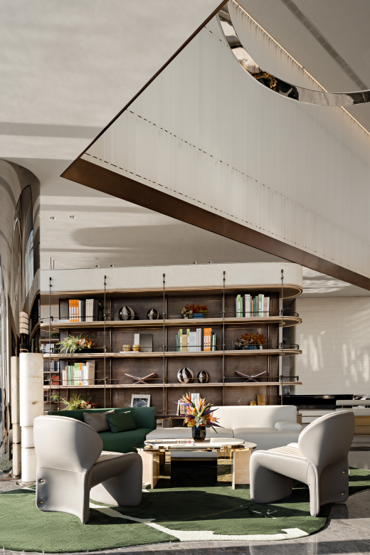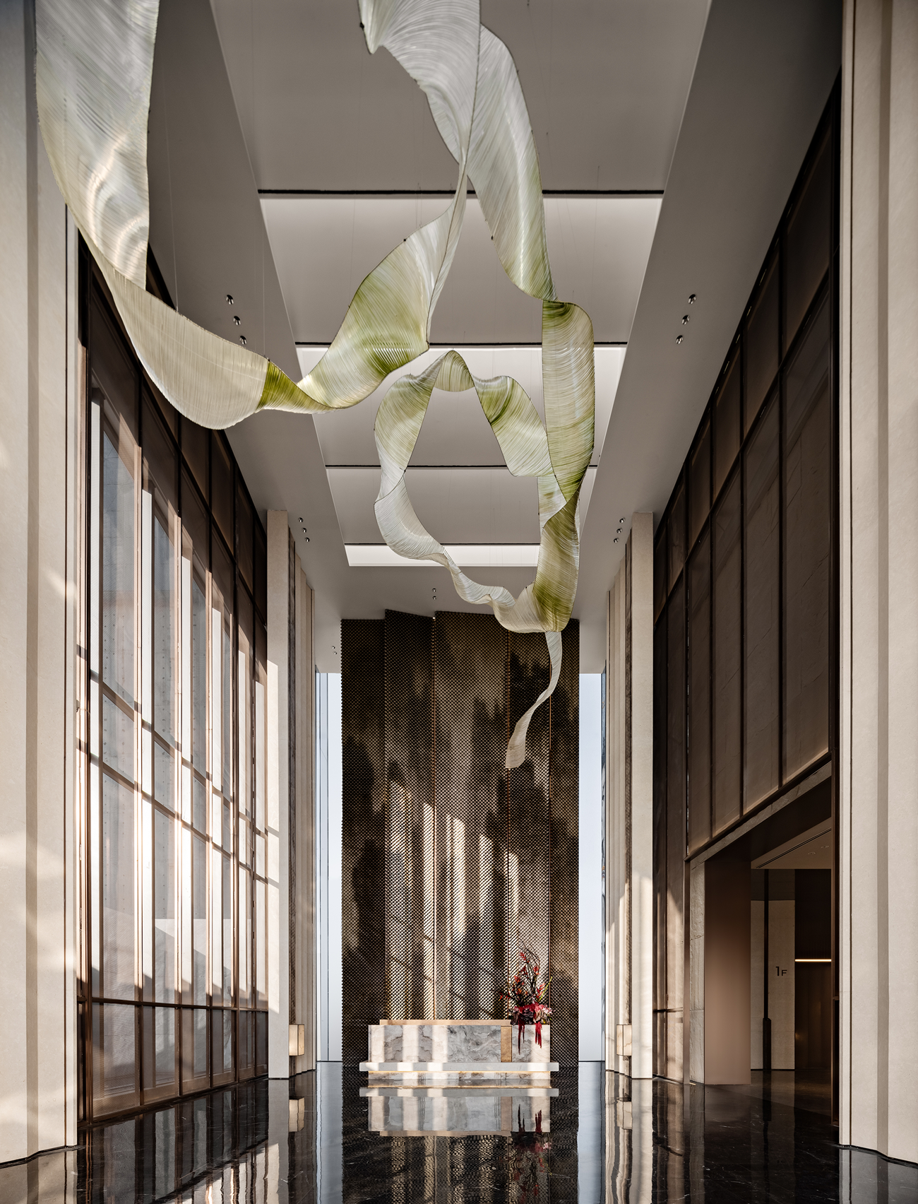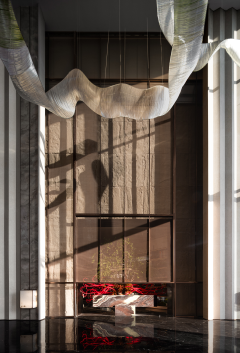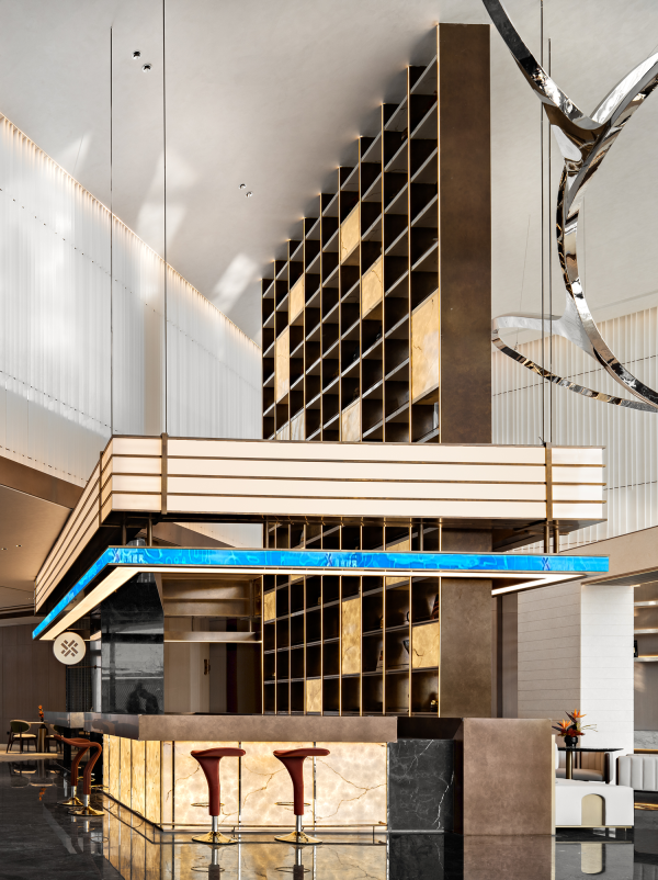 Blue Moon Design intends to integrate the historical and cultural characteristics and temperament of Taizhou into the space. Inspired by the characteristic industries in the Bay New Area and centered on intangible cultural heritage skills, Designers adopts avant-garde creative design to extract and transform cultural, technical, and artistic elements such as Tai embroidery and glass carving. The designers translate future-oriented inspiration into artistic geometric forms, constructing a channel between virtuality and reality, and a bridge between the past and the future.