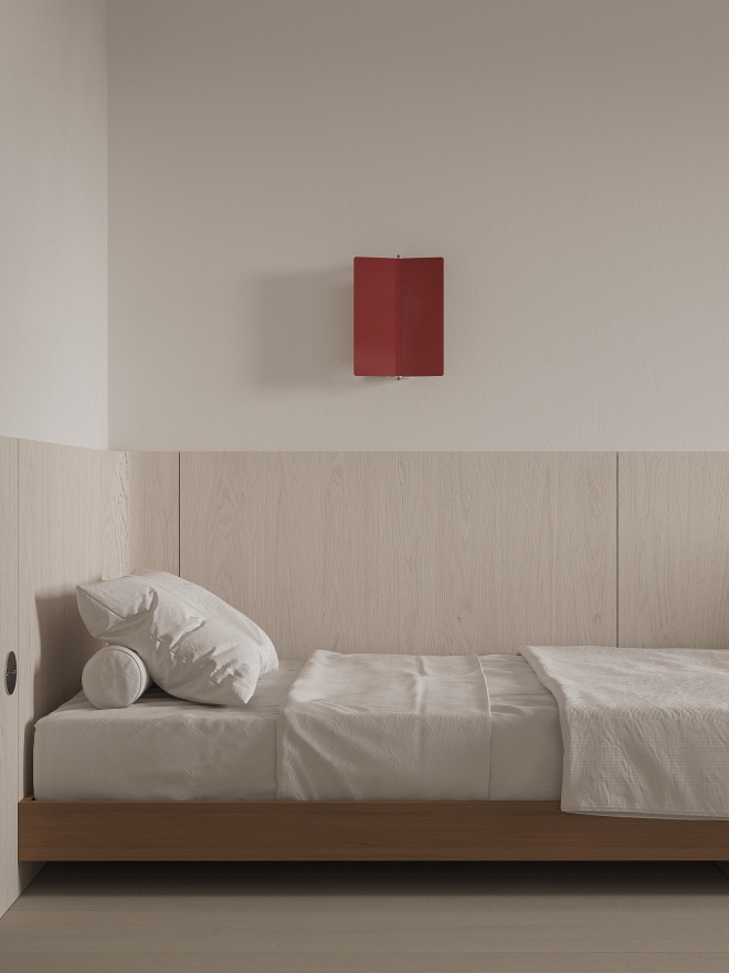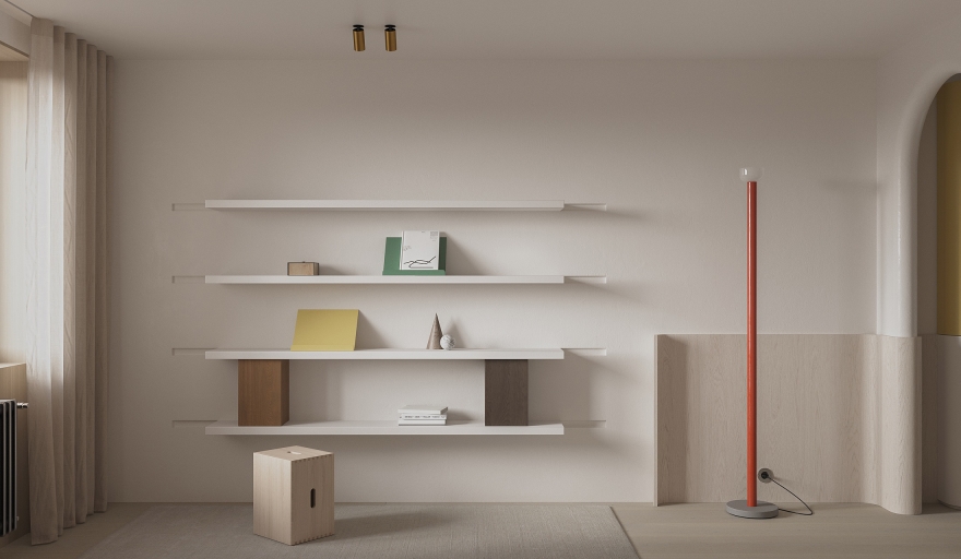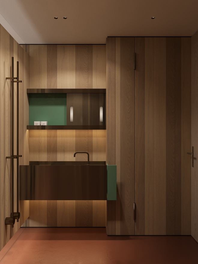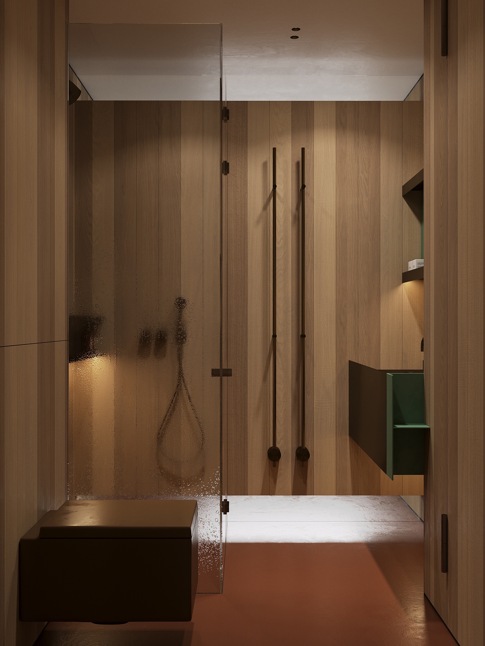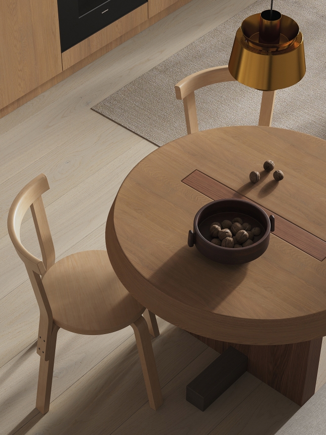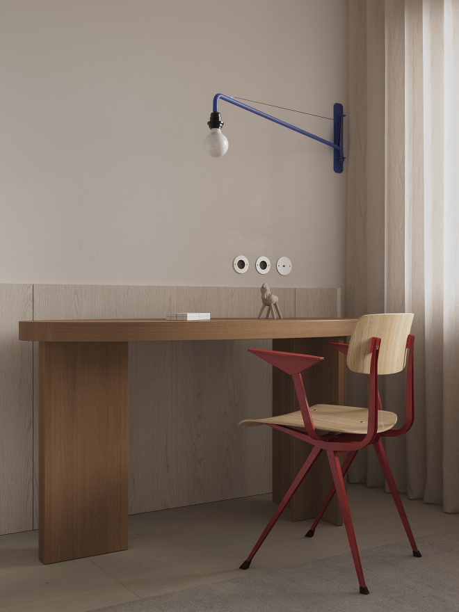 The standard planning solution of the 60th years of the 20th century has turned into a clear, verified structure. A characteristic feature of the interior is application of warm wood in various tones in every room, including the bathroom, and concise colour details. As a result daylight becomes warmer and fullfills all spaces. The loundry has a window and a light opening in a wall provides natural light to the bathroom.