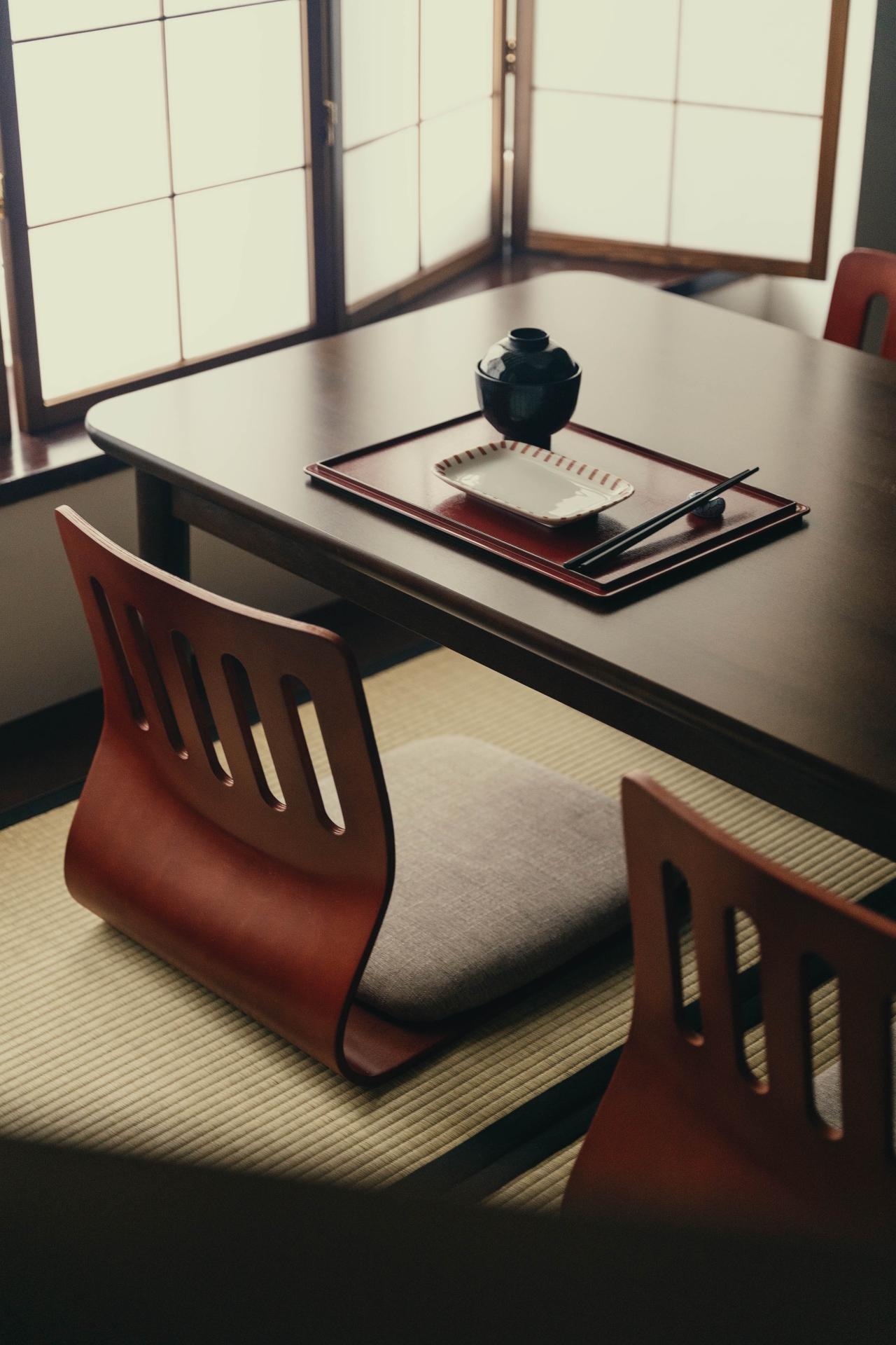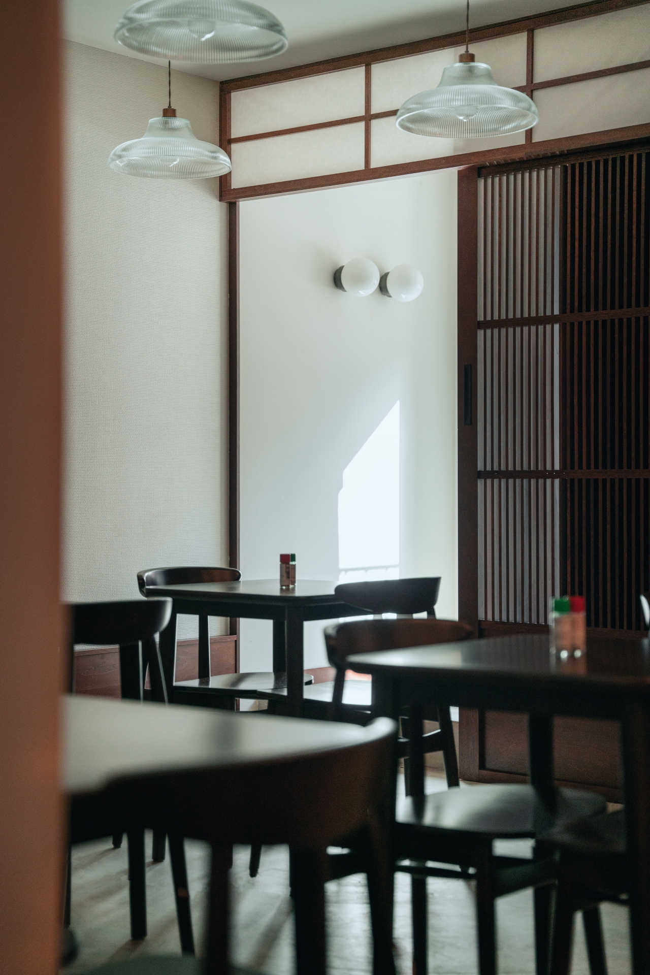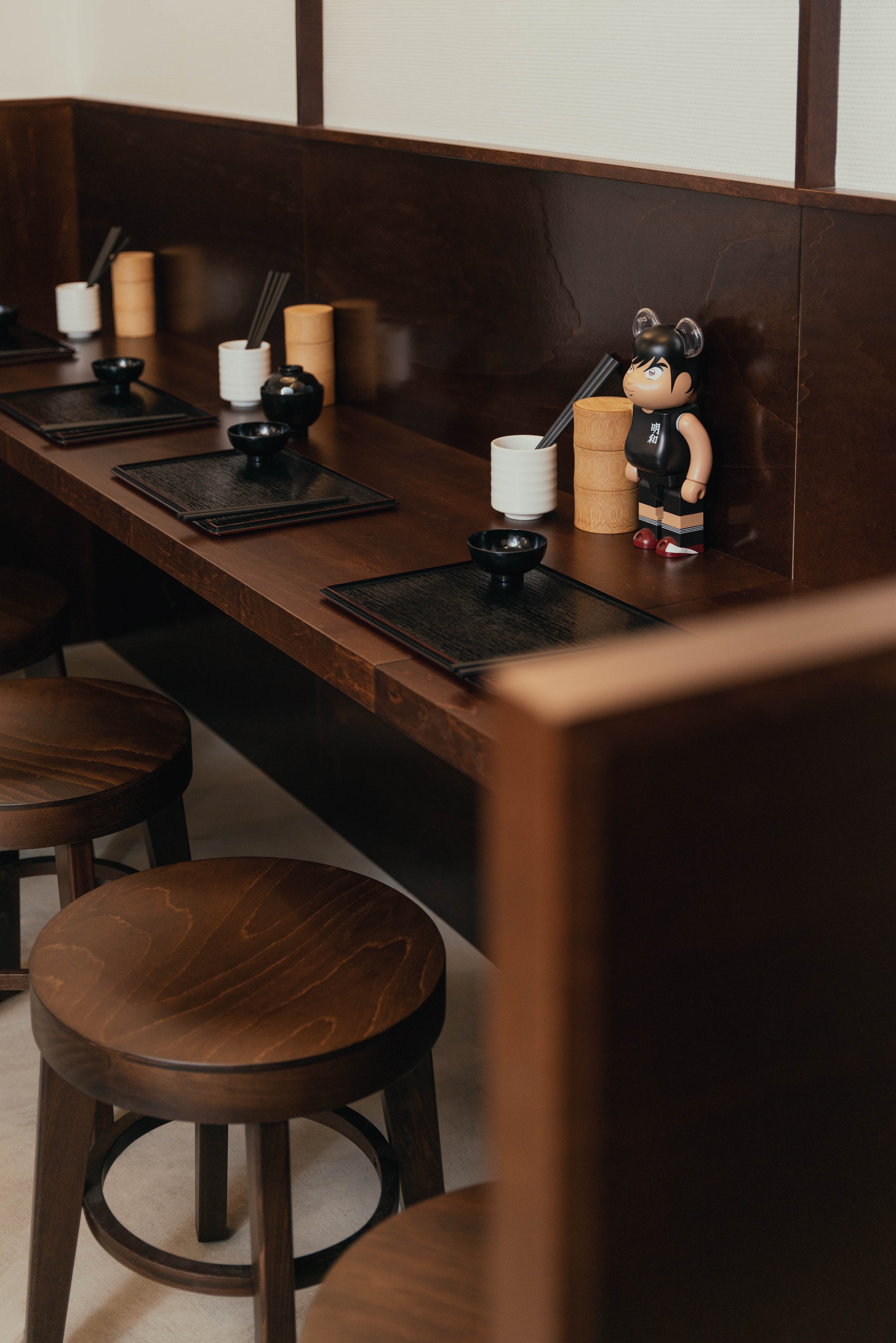 The interiors of Tonari embody the neonostalgic trend, evoking a sense of longing through specific details and a unique atmosphere as well as dim lightning. The space is divided into different zones tailored to various dining experiences, including classic dining areas, a bar for solo diners, and an intimate tatami mat seating section.