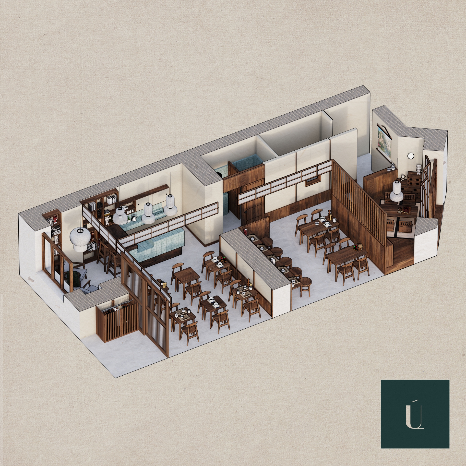 A focal point of the design is the bar, resembling a traditional Japanese kitchen with mint-colored mosaic tiles and shelves stacked with Japanese dishes. The main characteristic features are: dark lacquered wood, tatami mats, typical wallpapers, mint green colour and dim lighting.