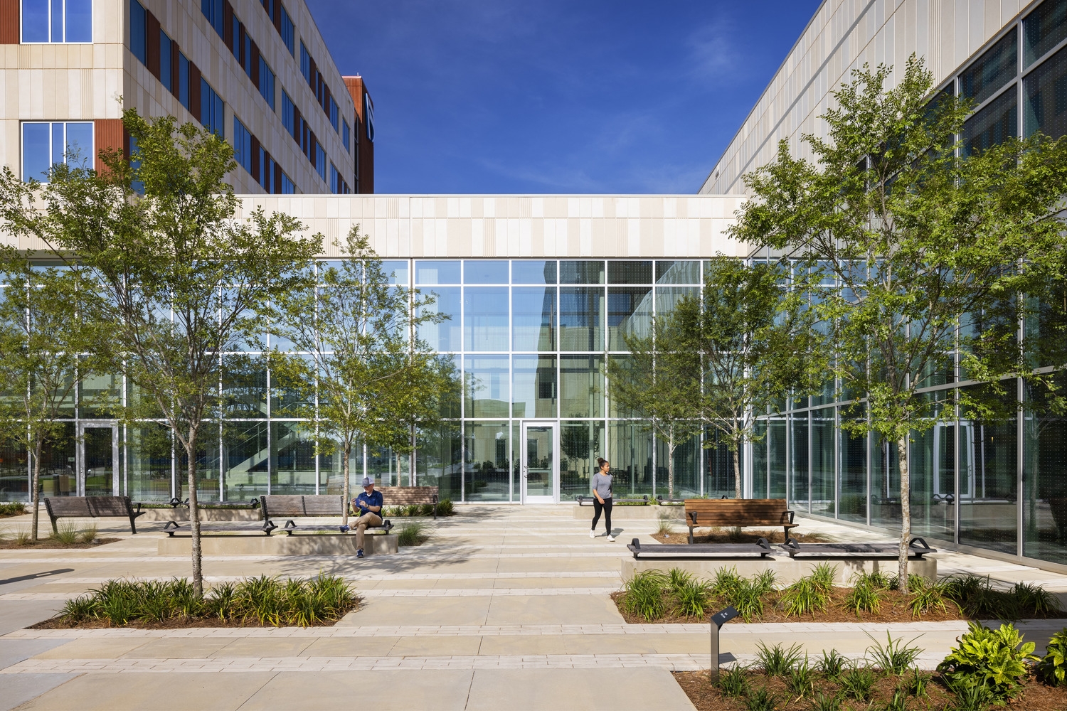 The campus design celebrates the area’s natural environment, with a park-like square that includes walking paths, gardens, and areas for patients to work toward recovery in the fresh air. Great care was taken to preserve the historic, centuries-old oak trees that are native to the area as well.