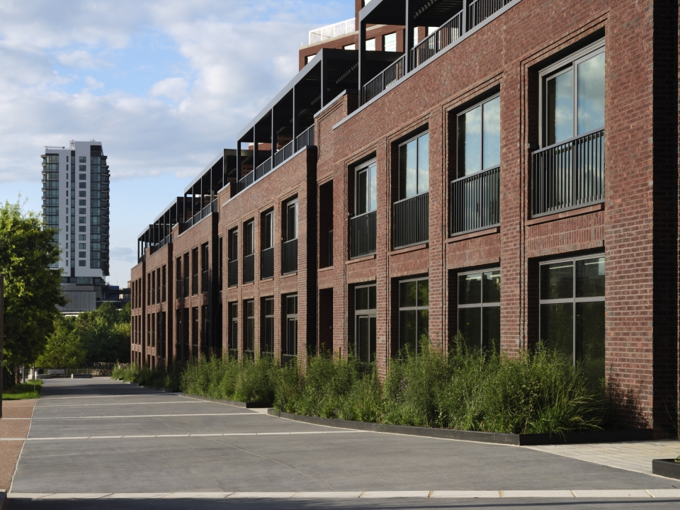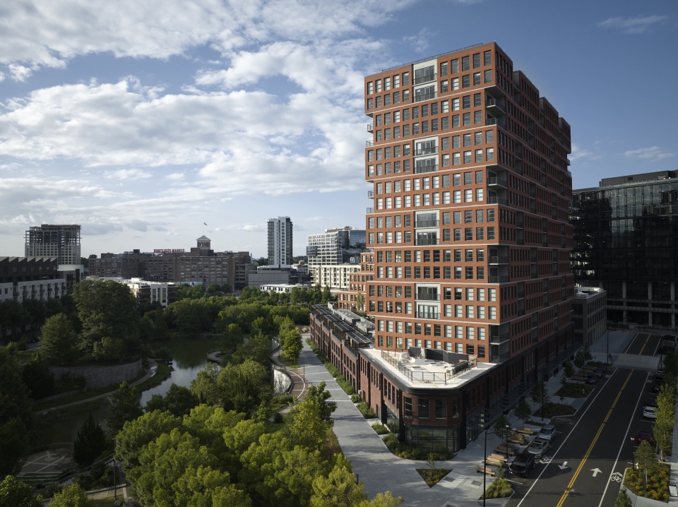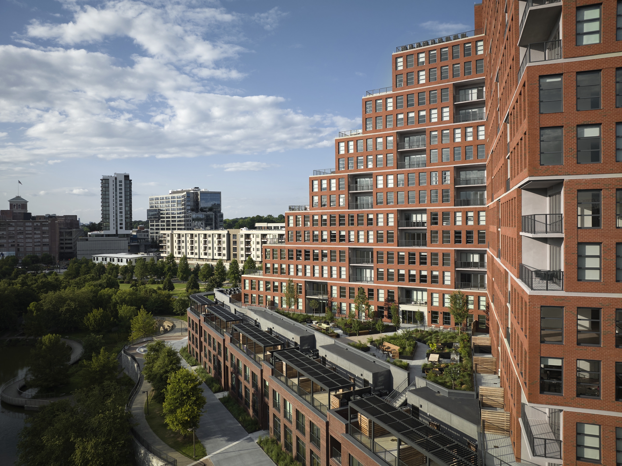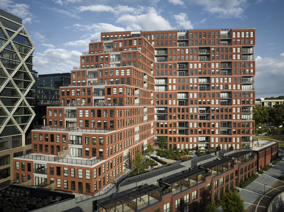 The Overline is a multifamily rental building in Atlanta, Georgia, spanning 18 stories. The design firm greatly considered the project’s historic contexts which informed the building's massing and materials. They ensure the building would not overpower the nearby Historic Fourth Ward Park and lower-scale surroundings. One side of the 450,000-square-foot development was constructed with a stair-step design, creating a silhouette with depth. This provided light and air between the historic park and the new building and allowed for gracious private terraces for many residential units. While the project’s podium level features textured brick to enhance the public realm, much of the building’s facade is clad in a rust-colored brick that pays homage to the nearby Ponce City Market.