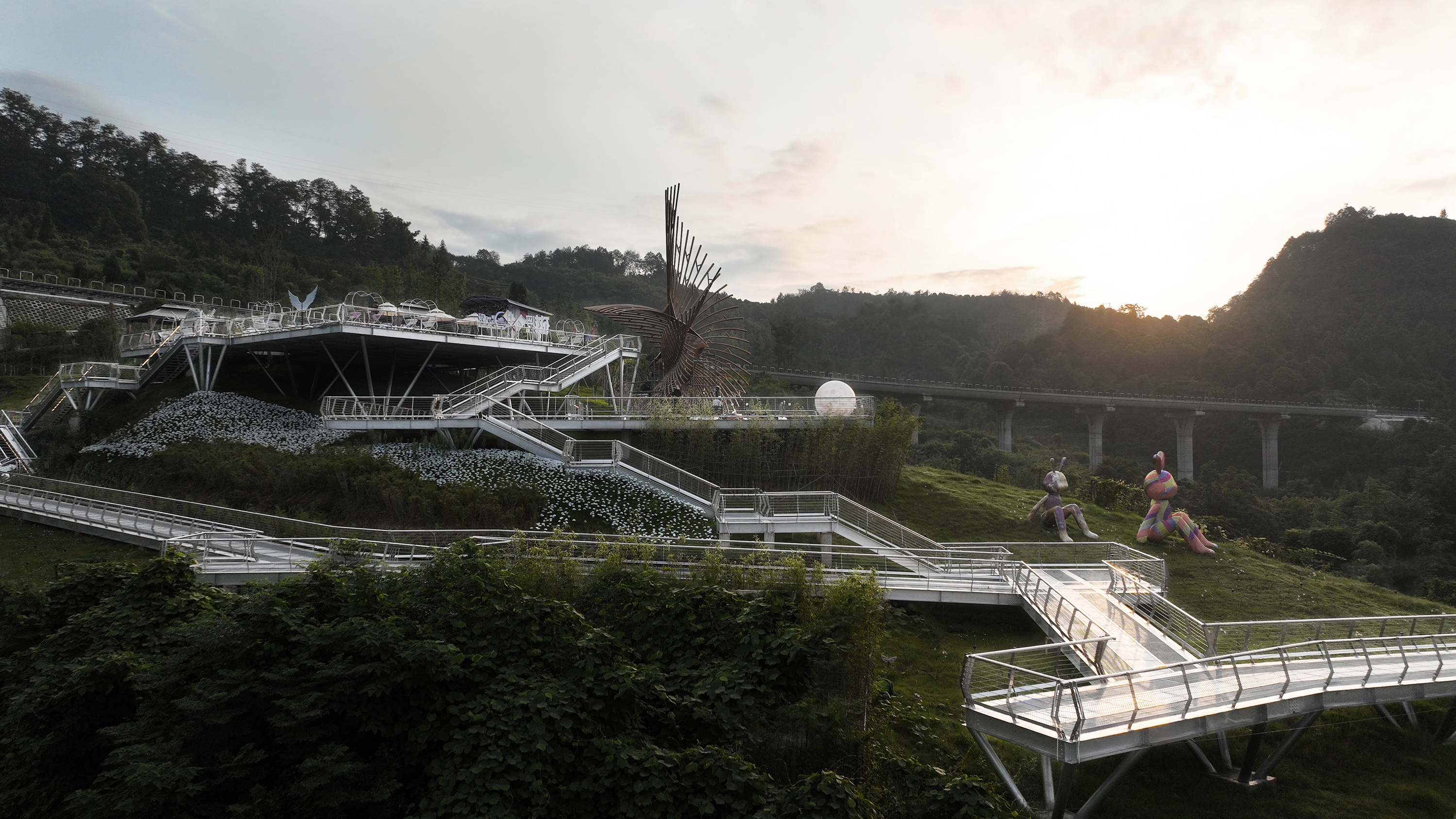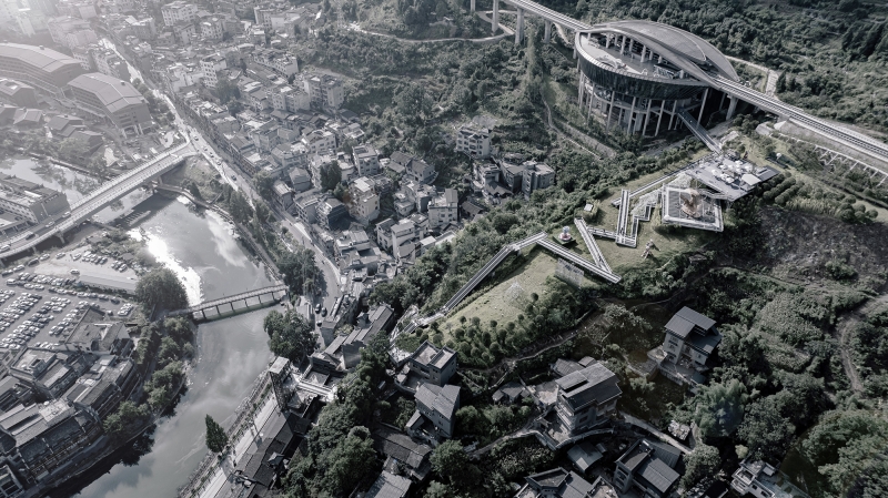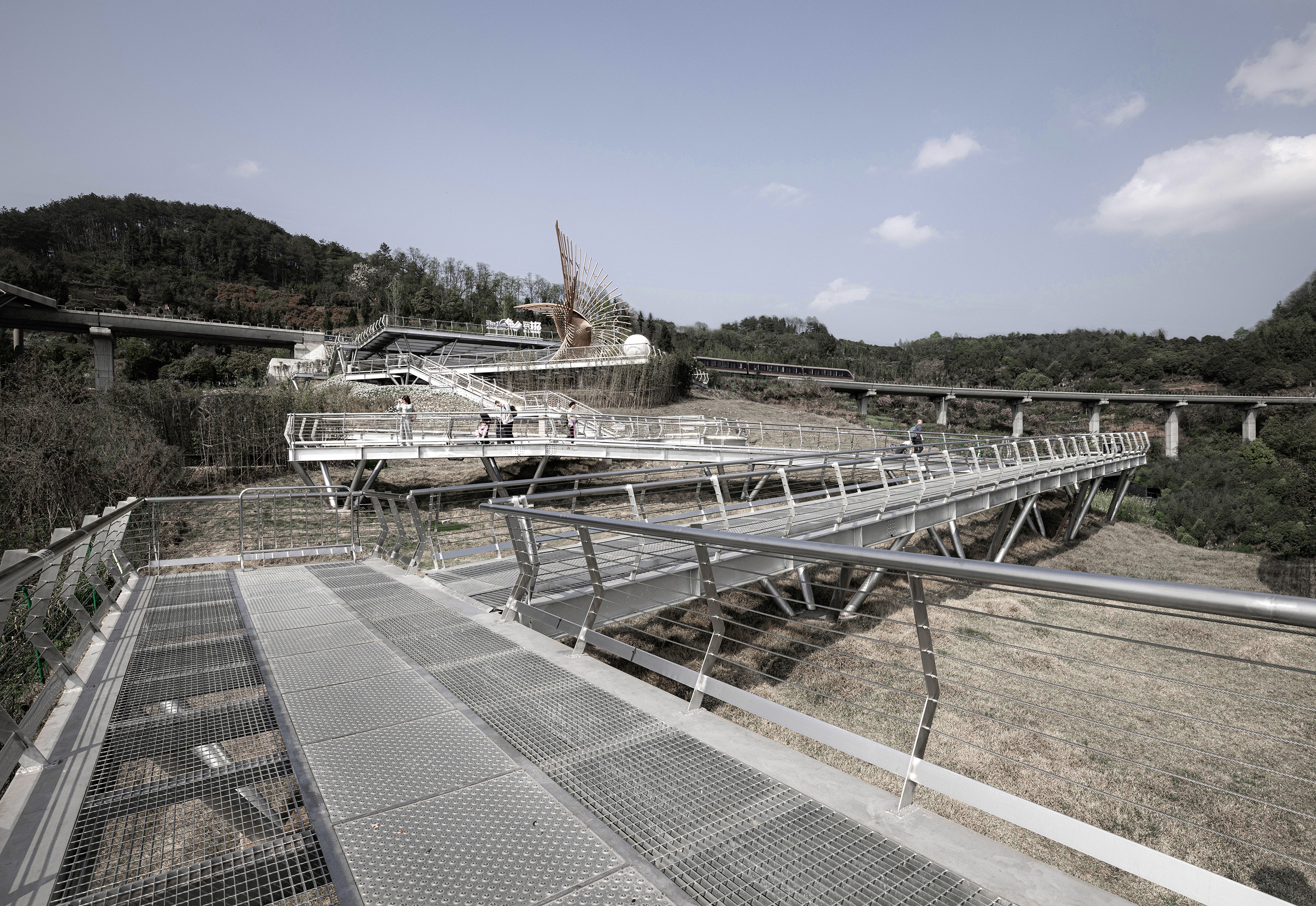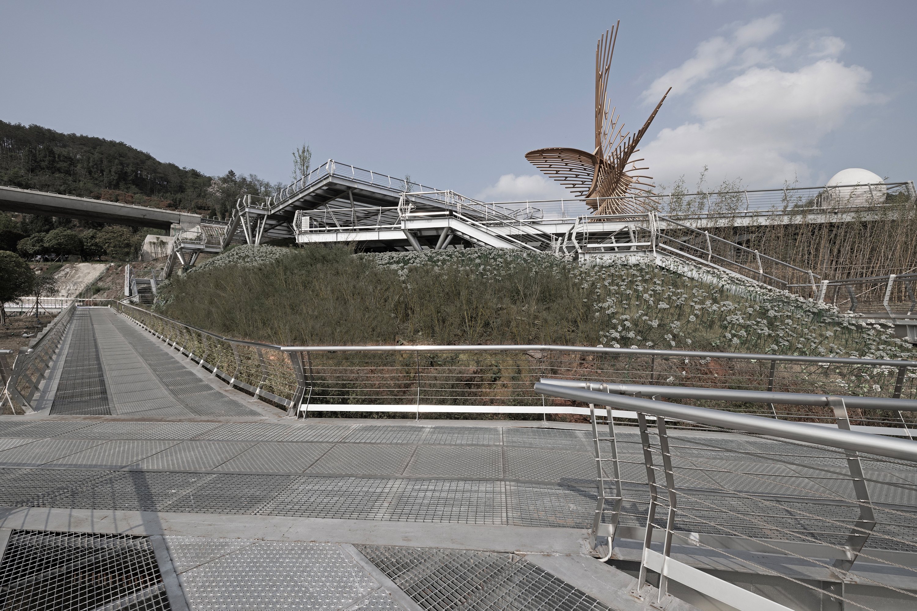 The project is mainly made of steel. It echoes the modern station with low maintenance cost and floats over the hills with high transparency. It connects to the ground with a point-like manner to minimize the damage to the existing vegetation.