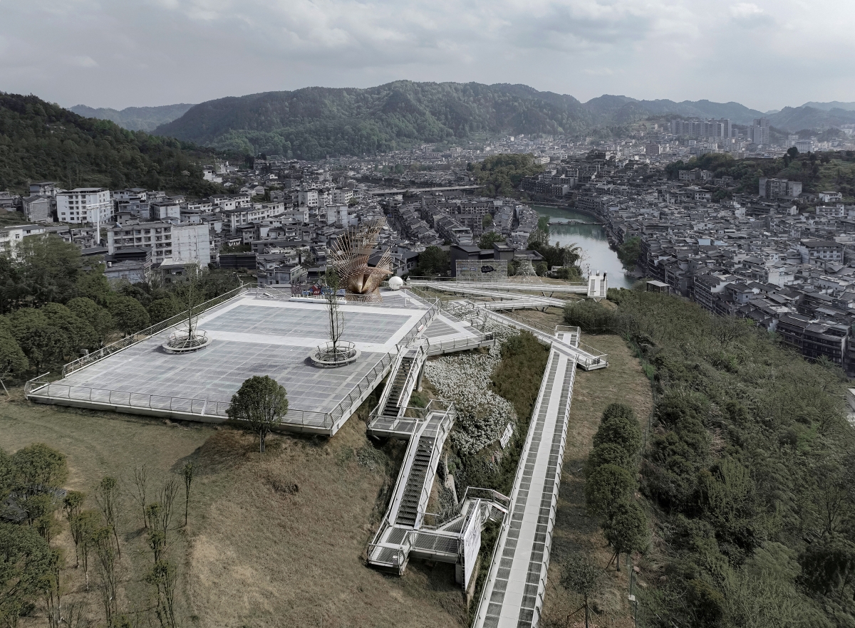 The trail follows the mountain and integrates the vertical height difference of 80 meters in sections, which minimizes the impact on the urban interface.