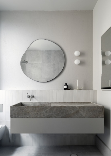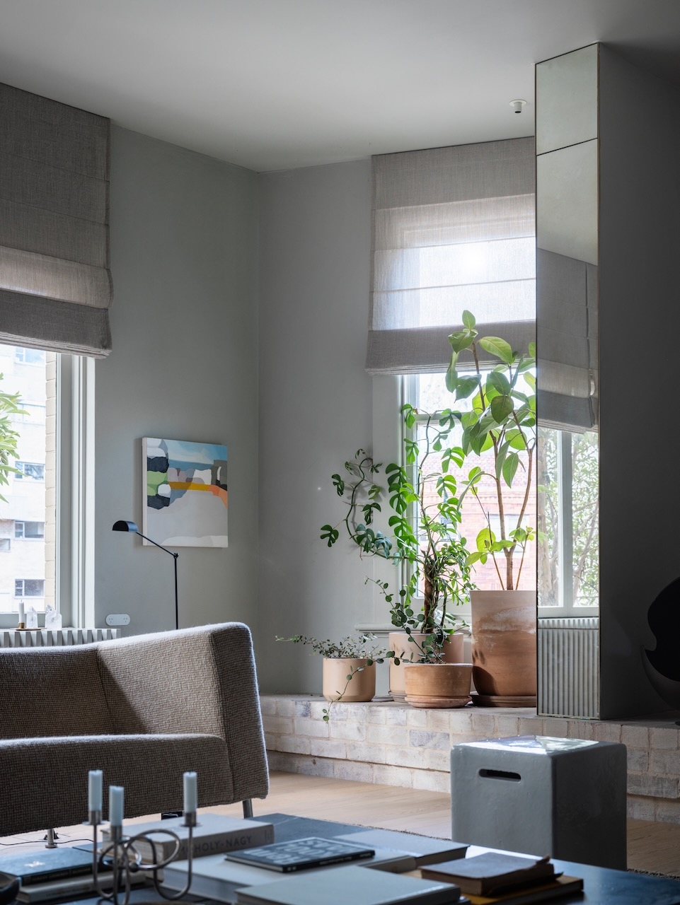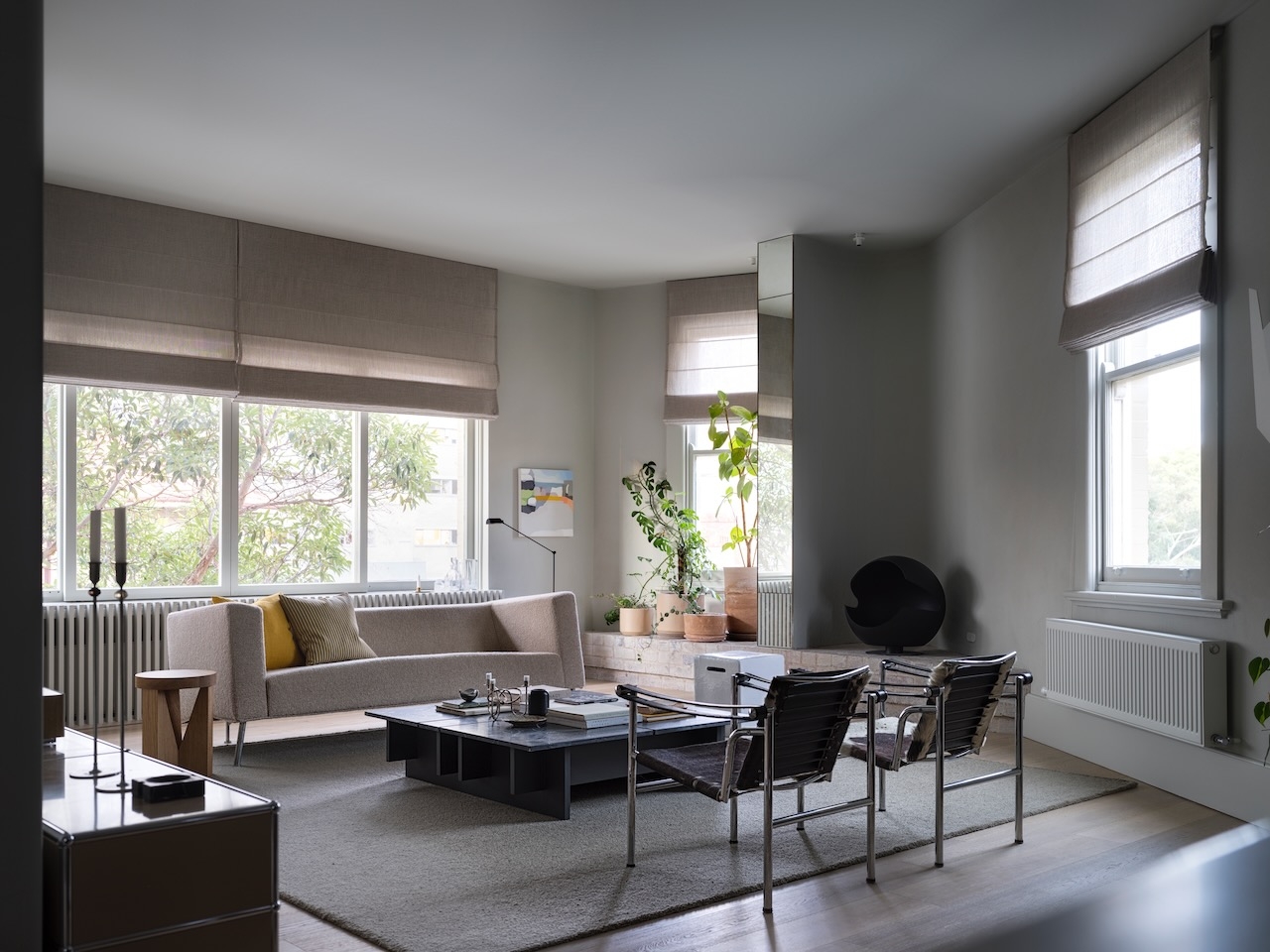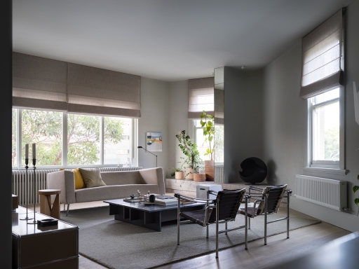 Meticulously detailed and curated, Solid Air delivers on the brief to be serene, cosmopolitan and evocative. Situated amongst the trees on a busy corner in Elizabeth Bay this apartment cultivates contemplation and discovery inside and out in every room. A timeless home nobody wants to leave.This is the designer's own home and was created to retreat to in the third act of life. A place to surrender in, watch the trees and listen to music. The art-deco apartments' magnificent arched windows and window seats were highlighted by removing all window treatments and seamlessly integrating them into the rooms with tone on tone seats and cushions. To heal, restore and reveal was more important than to add and hide. The rooms were crying out to be seen - where they previously had been hiding behind heavy curtains, carpets and misplaced joinery they were opened up to breathe and see the light. The neutral material palette grew from a handful of natural objects collected on a special memorable trip to the coast.