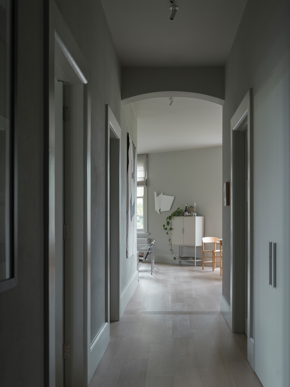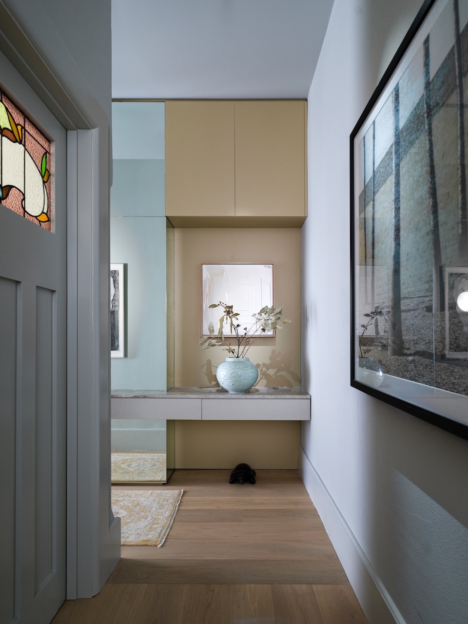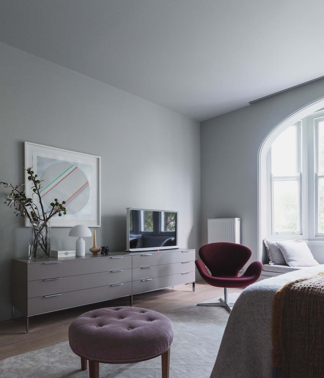 Meticulously detailed and curated, Solid Air delivers on the brief to be serene, cosmopolitan and evocative. Situated amongst the trees on a busy corner in Elizabeth Bay this apartment cultivates contemplation and discovery inside and out in every room. A timeless home nobody wants to leave.This is the designer's own home and was created to retreat to in the third act of life. A place to surrender in, watch the trees and listen to music. The art-deco apartments' magnificent arched windows and window seats were highlighted by removing all window treatments and seamlessly integrating them into the rooms with tone on tone seats and cushions. To heal, restore and reveal was more important than to add and hide. The rooms were crying out to be seen - where they previously had been hiding behind heavy curtains, carpets and misplaced joinery they were opened up to breathe and see the light. The neutral material palette grew from a handful of natural objects collected on a special memorable trip to the coast.