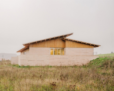 Three different materials make up the building: a mass-tinted concrete base to anchor the built volume to the ground; five-ply wood panels as a transitional element between interior and exterior; metal sheeting as an aerial element that dialogues with the sky and the great landscape.