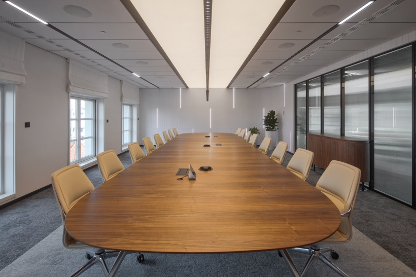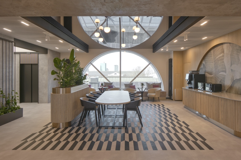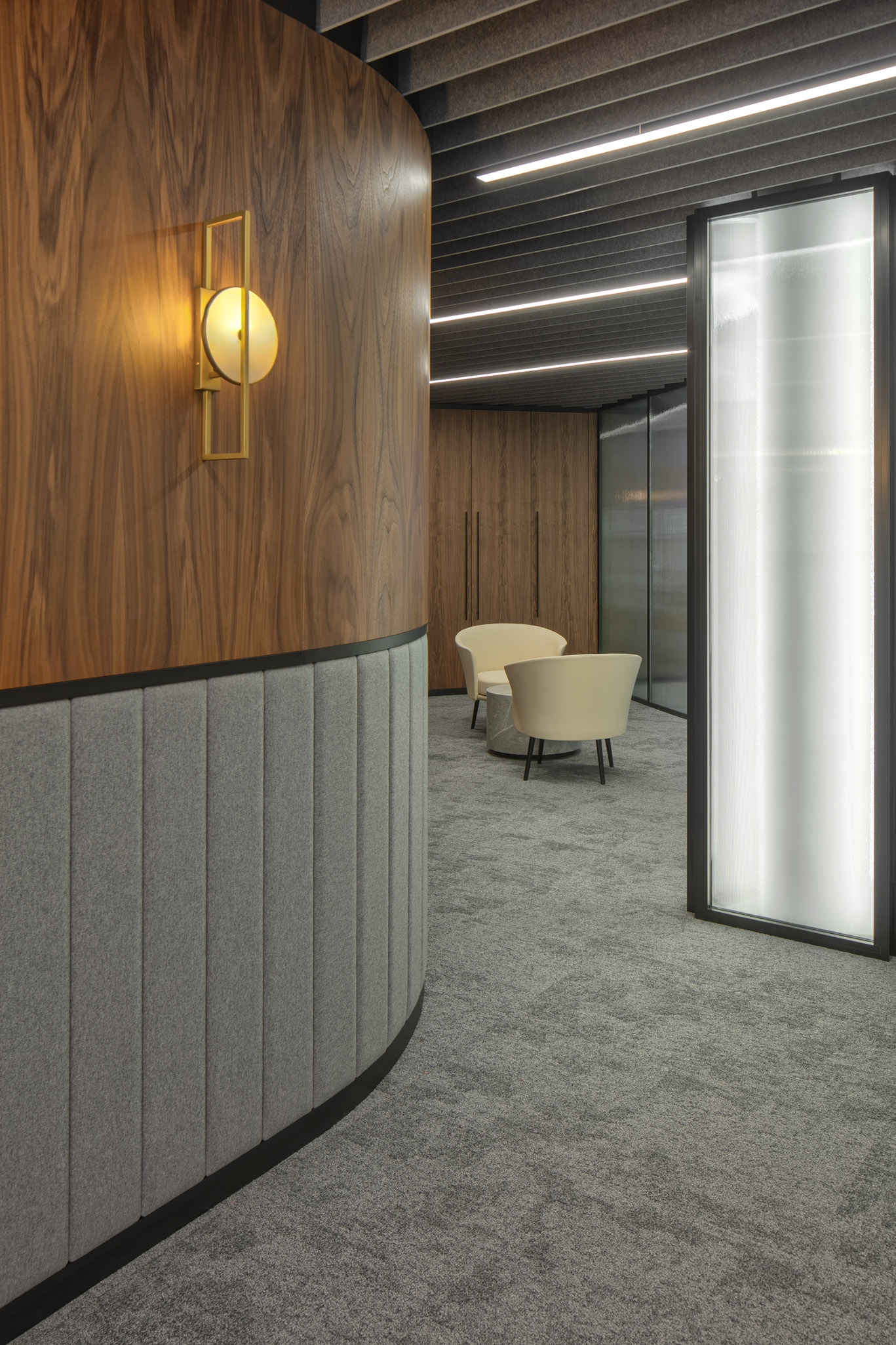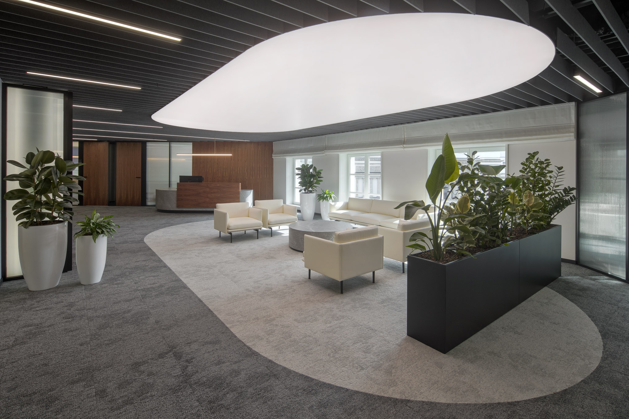 The investor aimed to enhance the employee space by improving lighting, installations, air quality, acoustics, and social areas. Emphasizing the building's prestige, the design aimed for a modern yet timeless look, preserving the historic facade and entrance. The stone used highlights the organization's high status. A glass roof over the office patio created a central, informal meeting space. Felt on ceilings and walls improved acoustics and coziness. Key interior elements include bleached oak and luxurious American walnut, with glass walls designed for optimal acoustic and visual comfort.