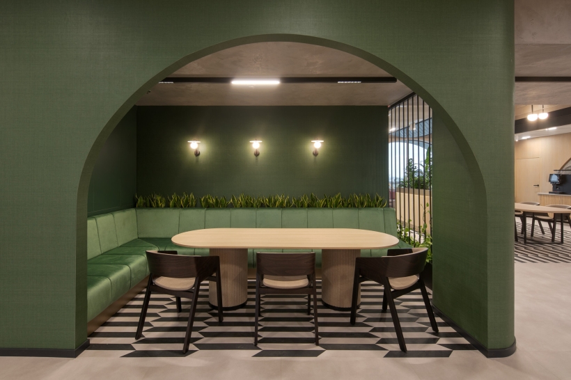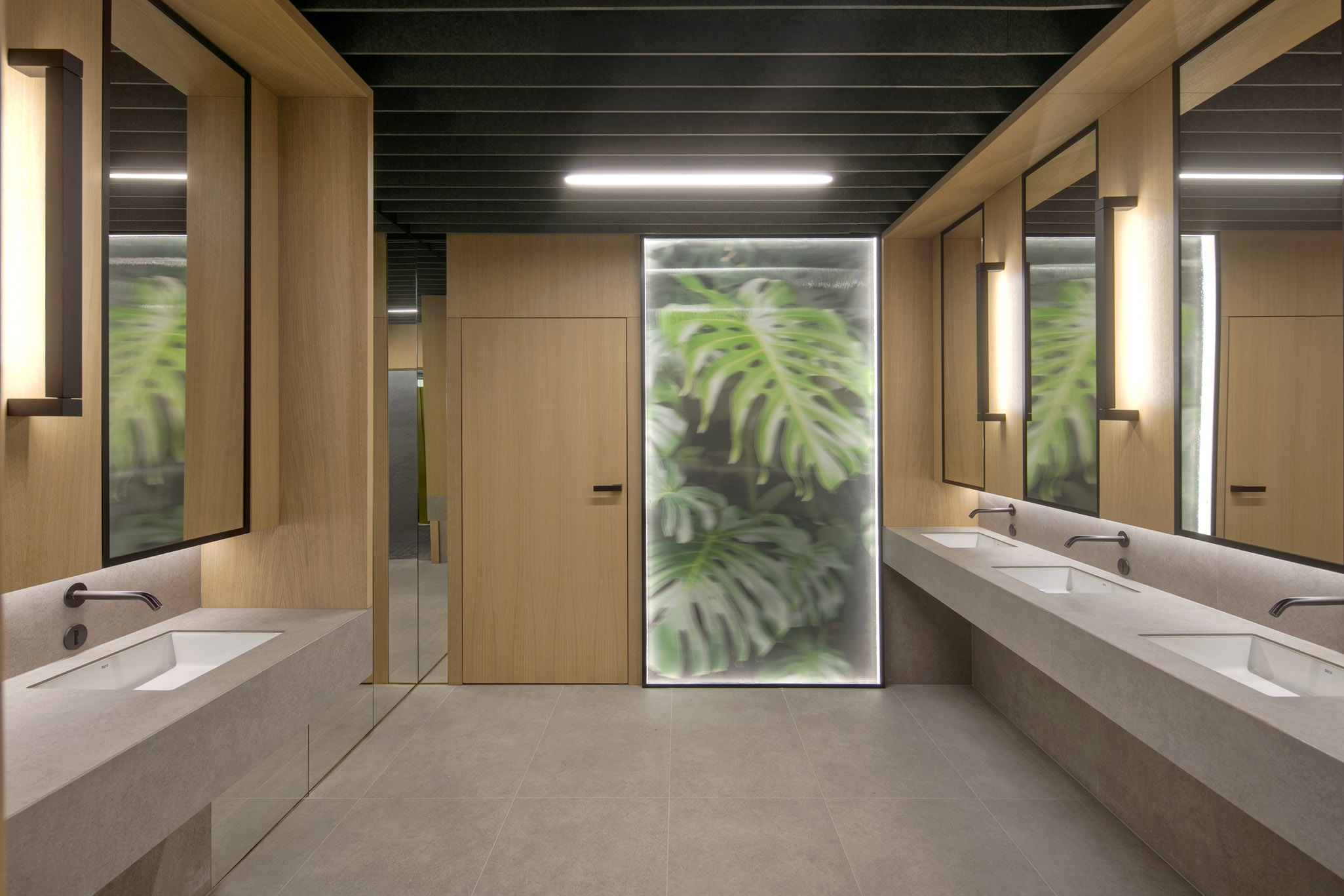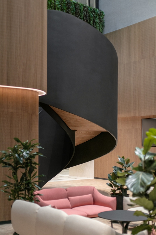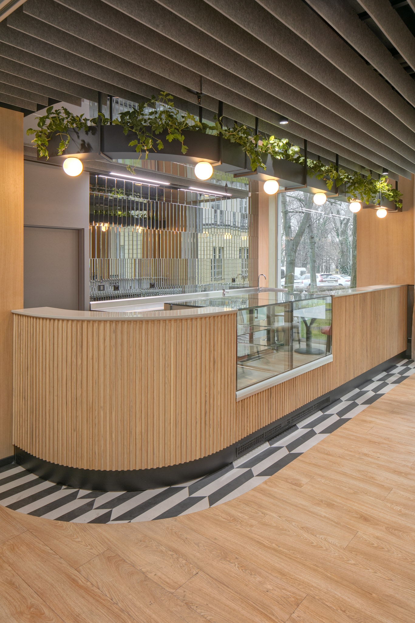 The investor aimed to enhance the employee space by improving lighting, installations, air quality, acoustics, and social areas. Emphasizing the building's prestige, the design aimed for a modern yet timeless look, preserving the historic facade and entrance. The stone used highlights the organization's high status. A glass roof over the office patio created a central, informal meeting space. Felt on ceilings and walls improved acoustics and coziness. Key interior elements include bleached oak and luxurious American walnut, with glass walls designed for optimal acoustic and visual comfort.