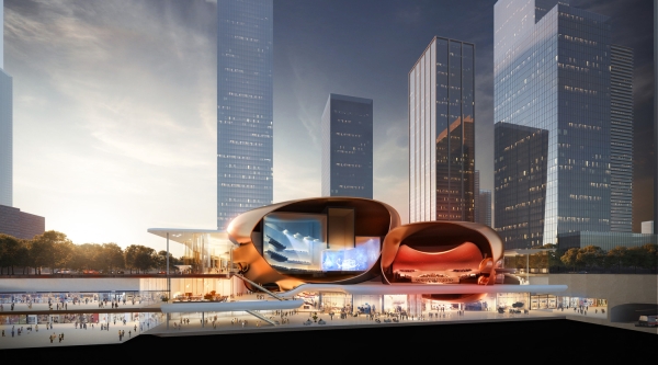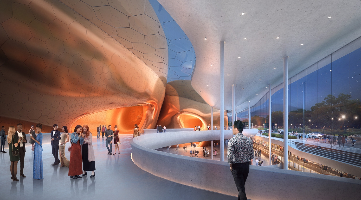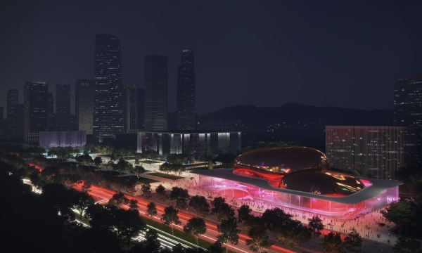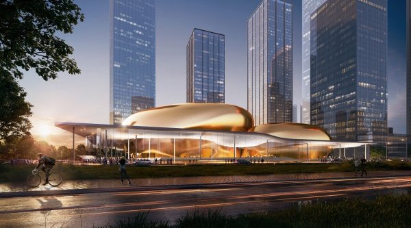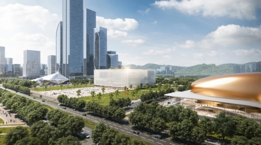 Named ‘The People’s Performing Arts Center’, the project will serve as a beacon of culture in the ascendancy of Shenzhen as a world class metropolitan center and will establish a new paradigm at the intersection of art and technology. The design features two richly textured, golden egg-like shells that reflect the duality of Shenzhen’s past and future and creates a dynamic building whose appearance changes with the time of day and season. The building will be located in downtown Shenzhen near the Civic Center linked to a new subway station hub and underground retail complex. It is one of three new cultural buildings being developed concurrently on adjacent sites that together will form a new ‘cultural triangle’ for the city of Shenzhen. The Performance Center includes an elegant transparent lobby that welcomes an unobstructed visual connection to the city and surrounding parks. Seated within the multilevel atrium, the two golden shells encase the Dream Theater (2000 seat), Star Concert Hall (1100 seat), and a rehearsal hall.