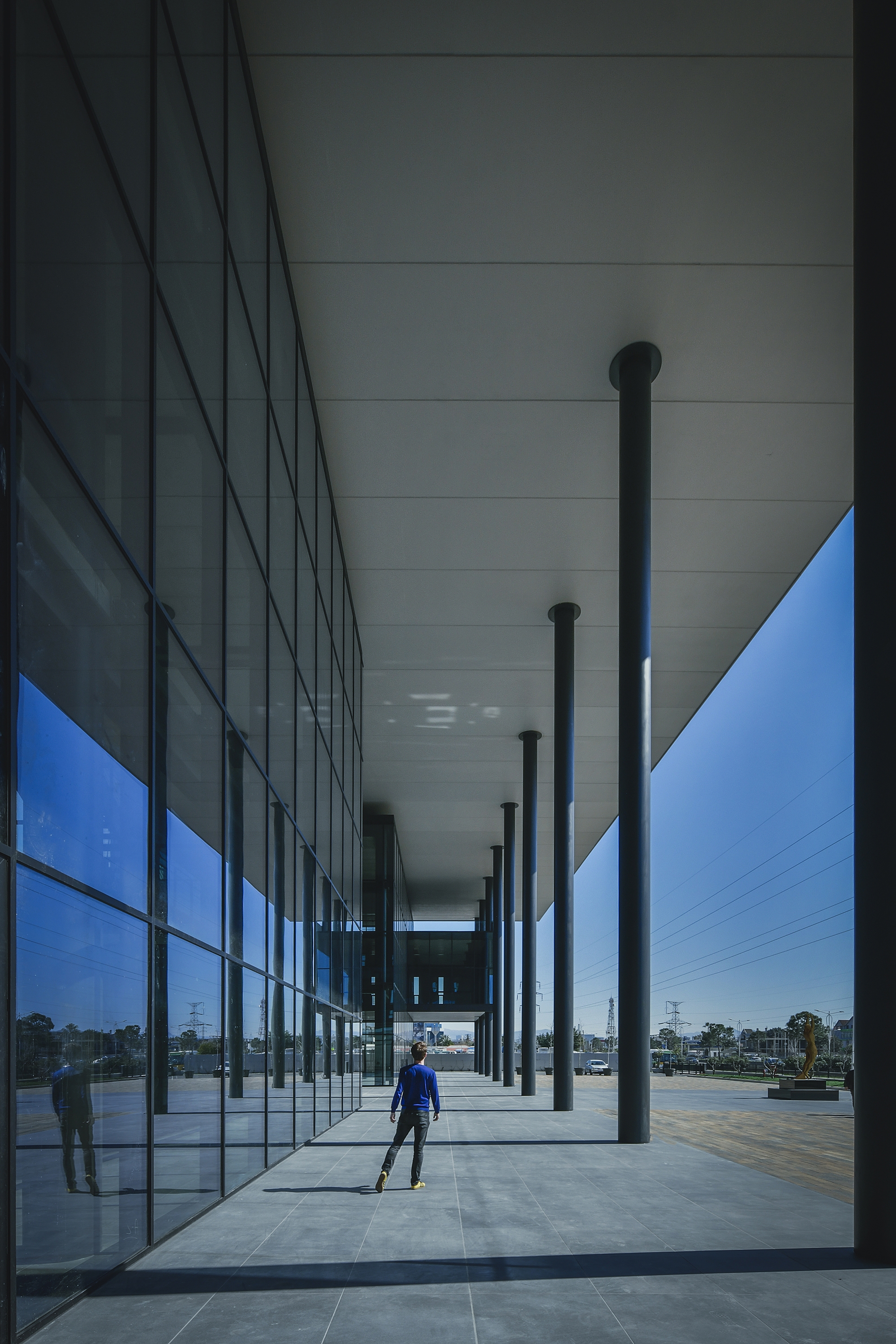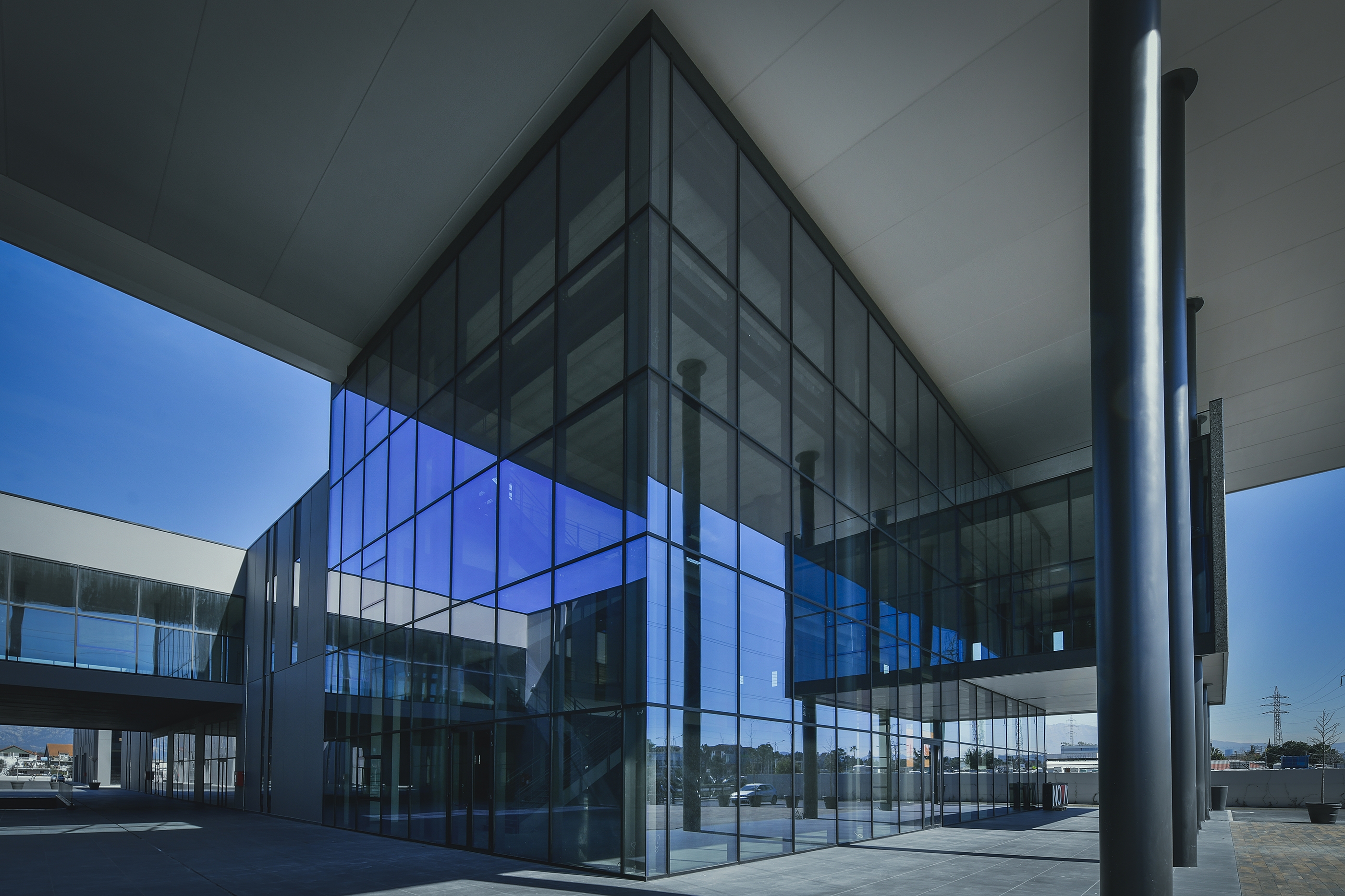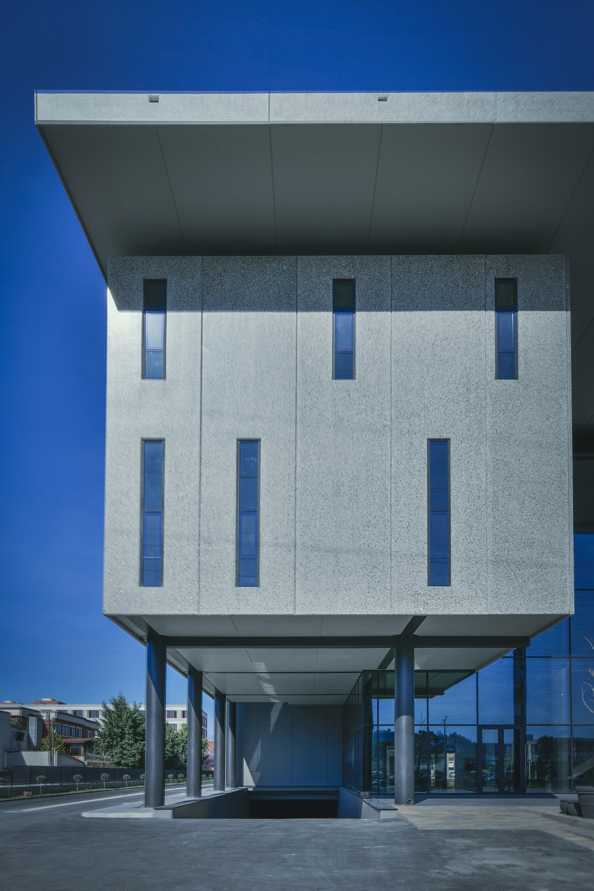 The volume on the main façade has a more monumental dimension than the rest of the building, due to the direct impact it has from the road axis. The use of transparent glass and elegant structures with metal elements prevail. A big concrete slab is placed on top of the glass structures providing a visual finish.