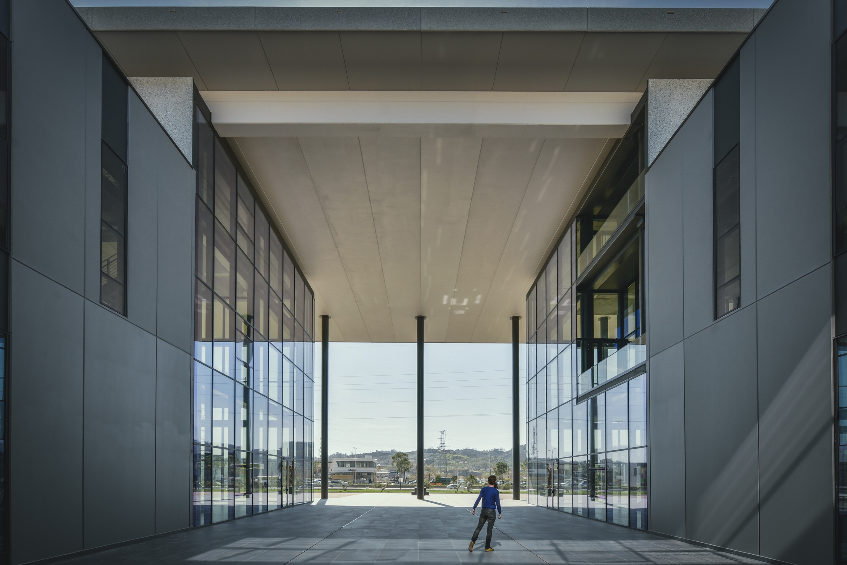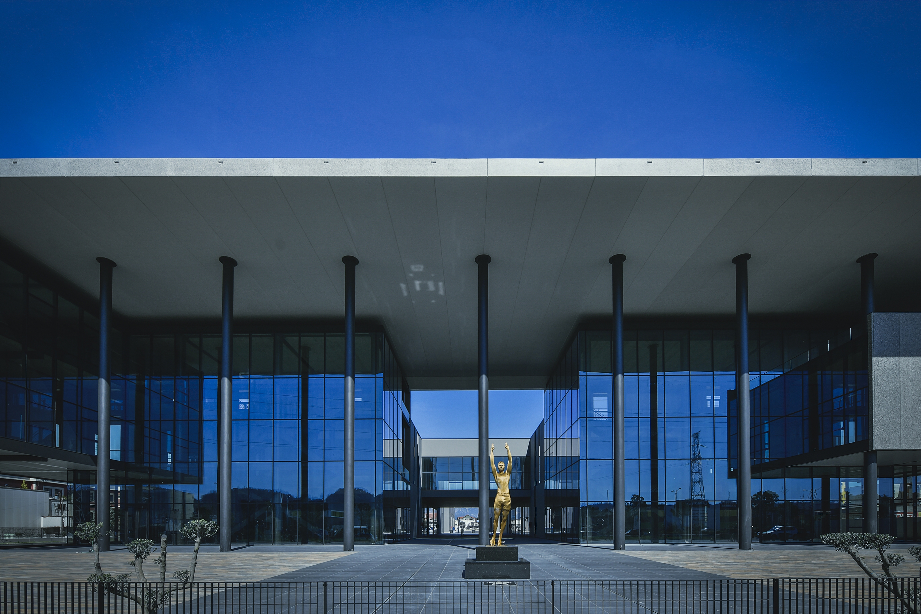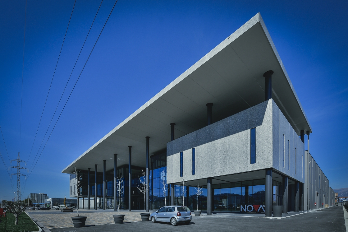 The volume on the main façade has a more monumental dimension than the rest of the building, due to the direct impact it has from the road axis. The use of transparent glass and elegant structures with metal elements prevail. A big concrete slab is placed on top of the glass structures providing a visual finish.