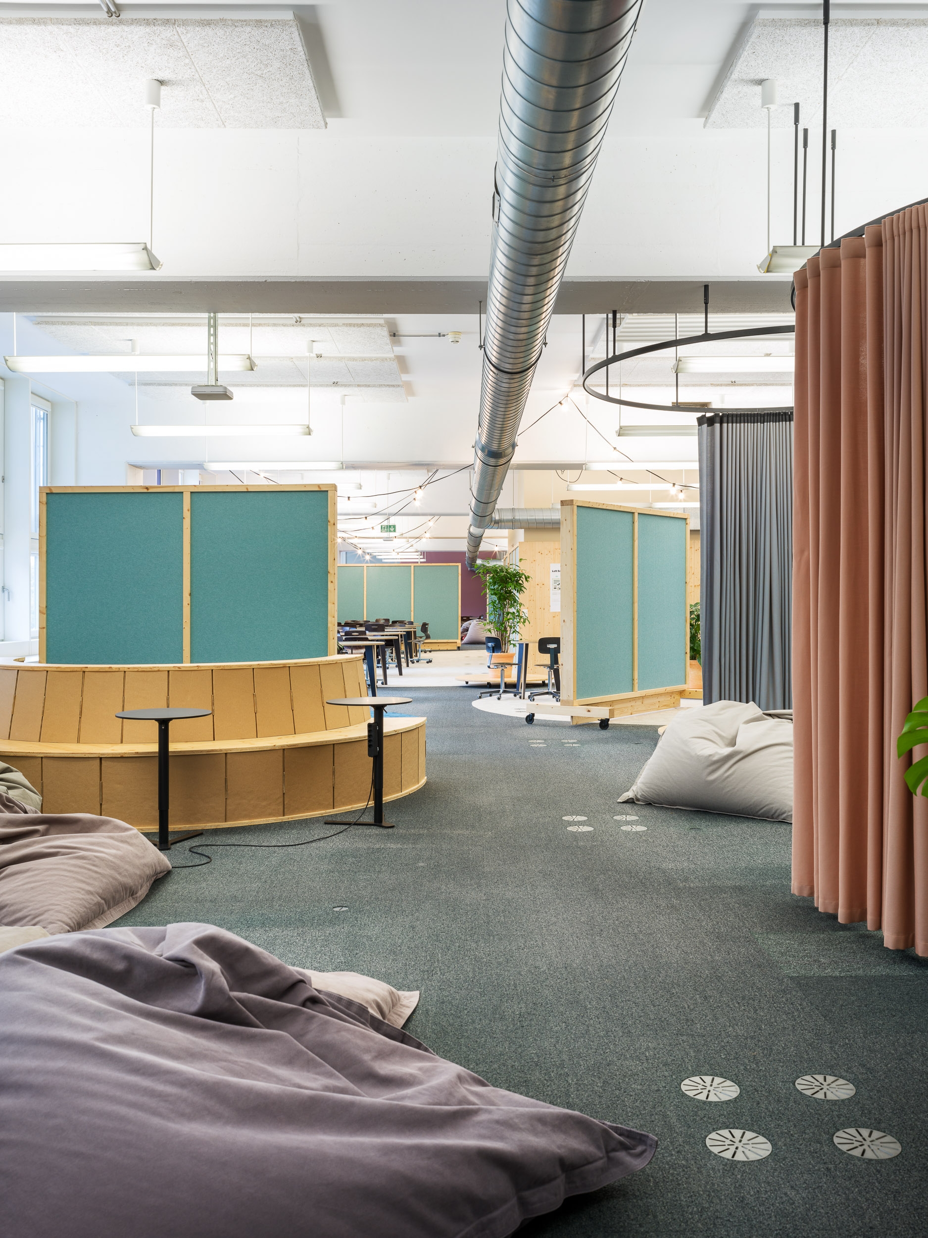 The "Loft School" concept envisions 120 students learning in an open space of 1000 m² without fixed walls. This offers several advantages. The large, open space allows flexible and efficient use, with adaptable learning zones for different activities and teaching methods. The open structure facilitates communication and interaction between students and teachers, enabling easier collaboration and fostering idea exchange and problem-solving.