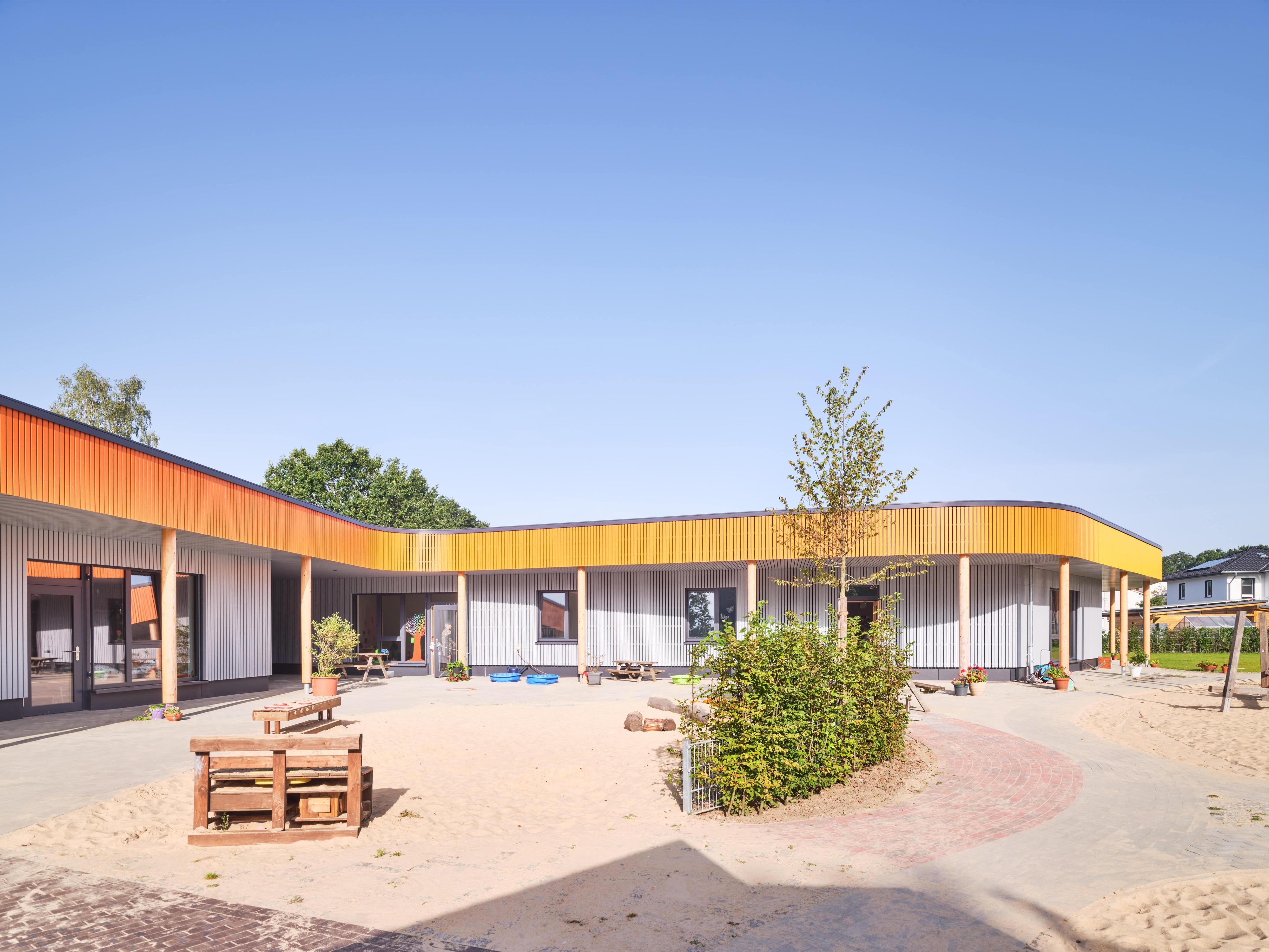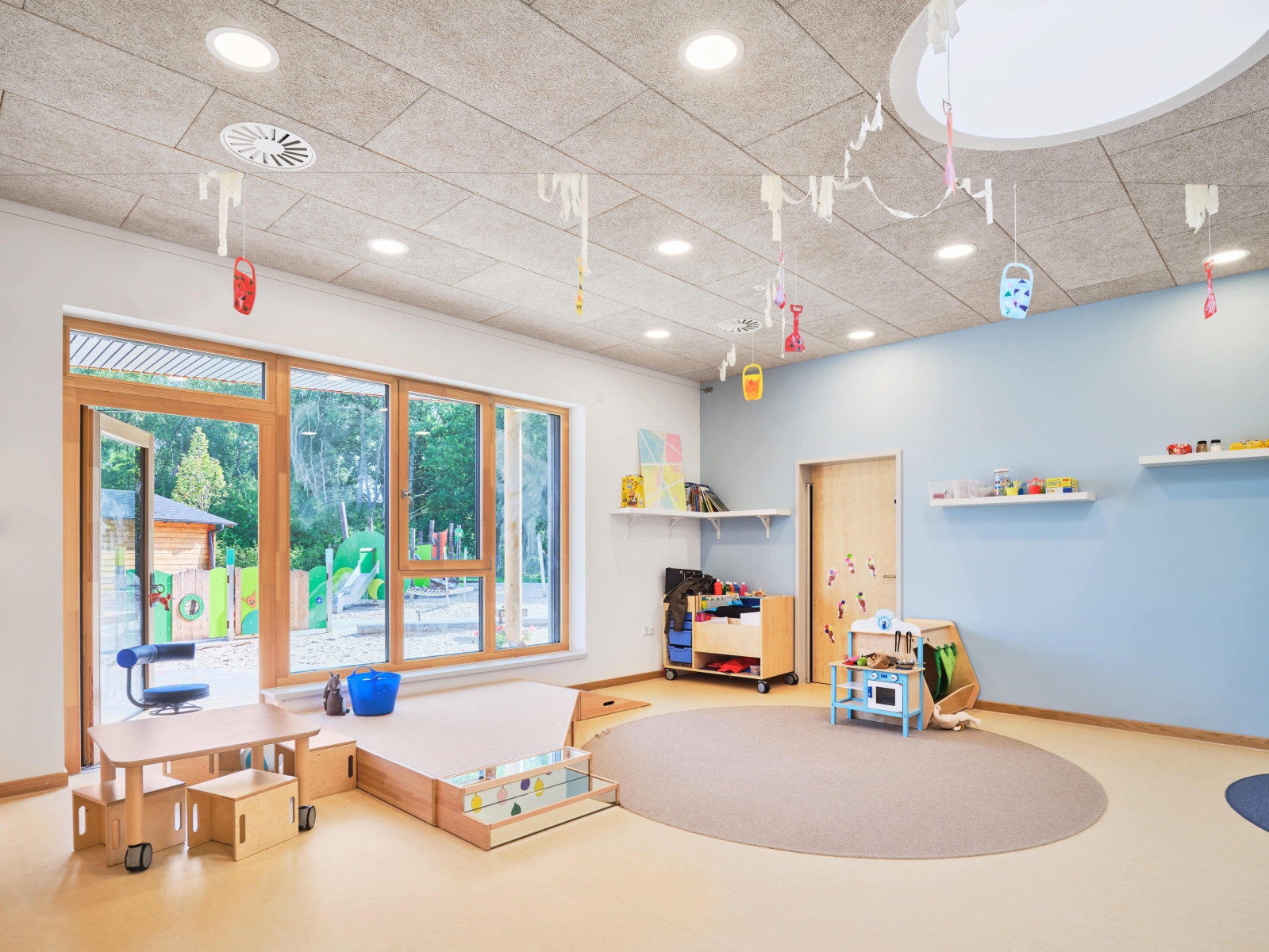 The concept envisages a smooth transition from the exterior to the interior. The organic design of the structure and the floor plan is based on the shape of a cosy fox house. The holistic realisation of this idea is reflected, for example, in the extensive green roof with round skylight domes, which bring additional daylight into the interior. Expansions and niches in the interior contribute to the structure and create sheltered play areas.