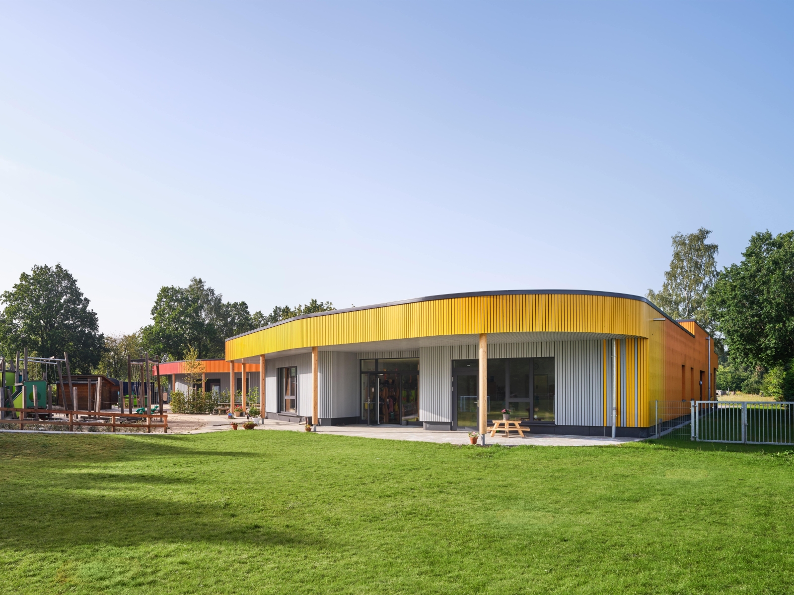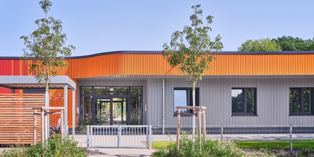 Located near the forest, the "Fuchsbau" daycare center offers space for three elementary groups and three crèche groups. A kitchen and a multi-purpose room as well as a caretaker's area are also integrated into the single-storey, completely barrier-free building.
