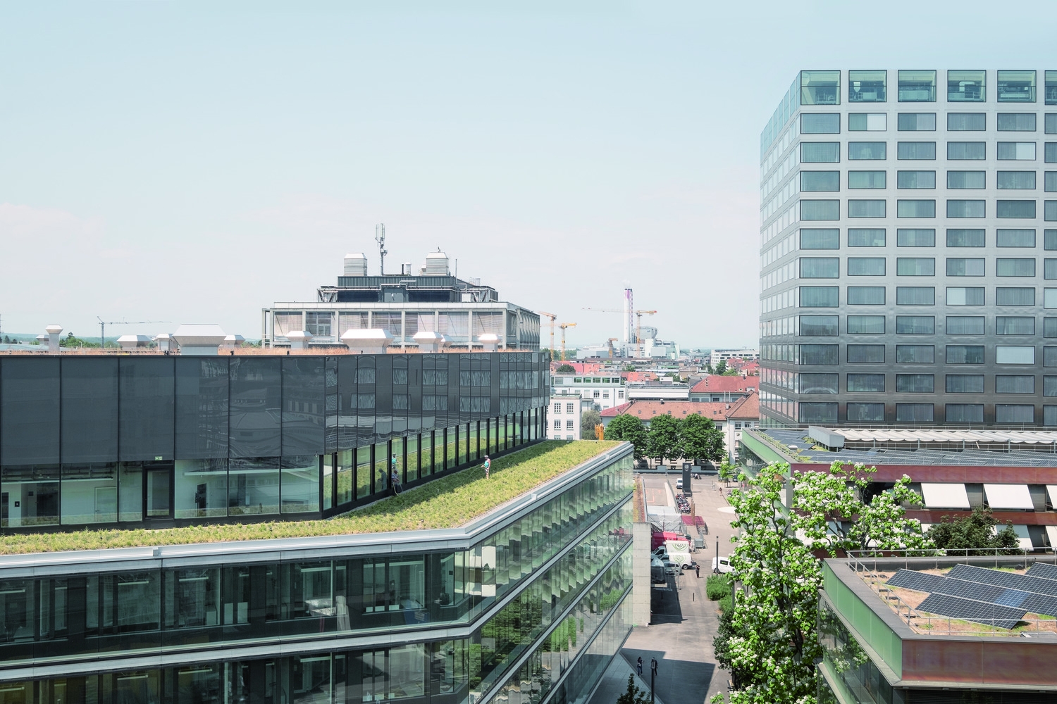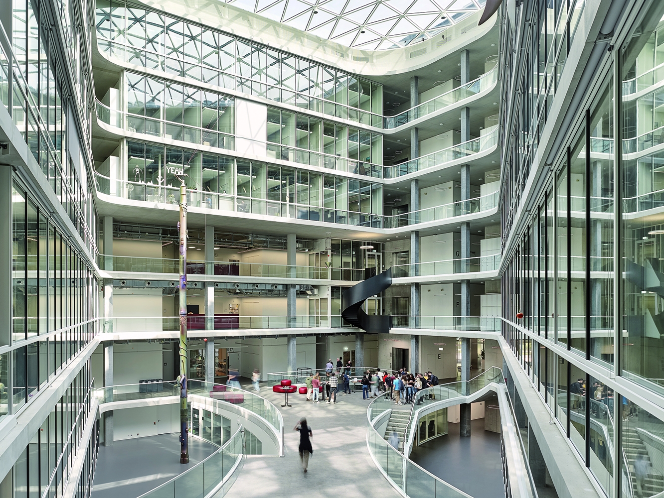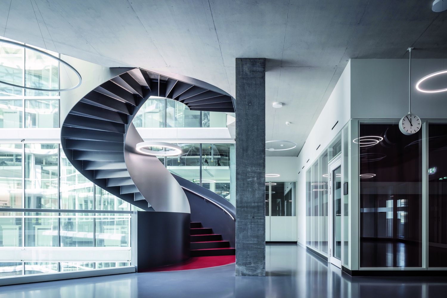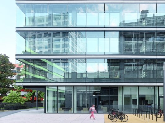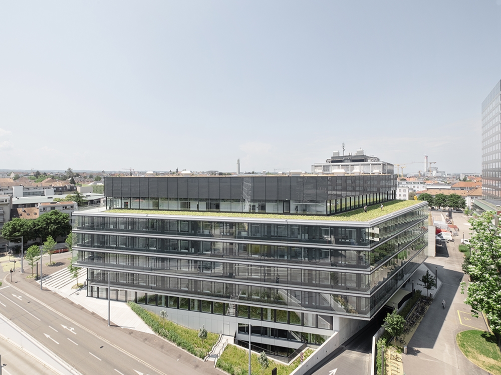 The new building for the Department of Biosystems Science and Engineering (D-BSSE) at ETH Zurich serves as a visual landmark on the Schällemätteli Life Sciences Campus in Basel. Its polygonal design harmonizes with the diverse surroundings, functioning as a gateway to the campus and featuring a public diagonal path, which connects street levels through the building. Furthermore it incorporates a flexible room concept focused around a central laboratory core. The design provides defined work areas for individual units while allowing interconnectivity through spiral staircases. Numerous communication areas and visual connections enhance the user experience, making the building conducive to collaboration and innovation. Unlike conventional layouts, it arranges laboratories, evaluation zones, and seminar rooms along the atrium, making them visible and accessible. Student learning areas animate the ground floor, with research group laboratories on upper floors. The Science Lounge on the top floor offers seminar spaces and a roof terrace with a panoramic city view.The building is certified as Minergie ECO and SGNI/DGNB Gold and is designed according to the GI (Good Indoor Climate).