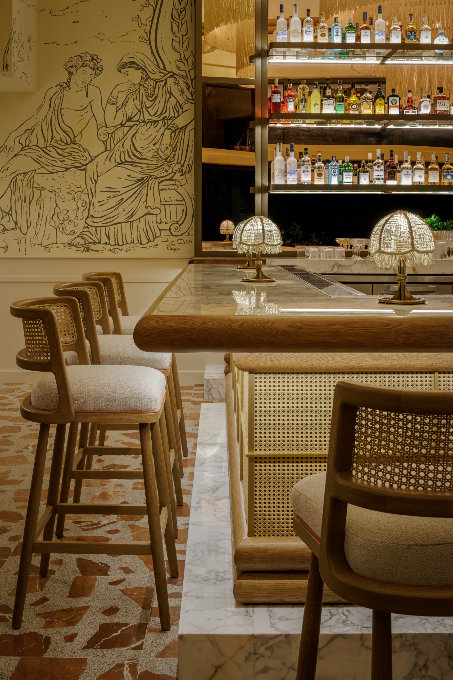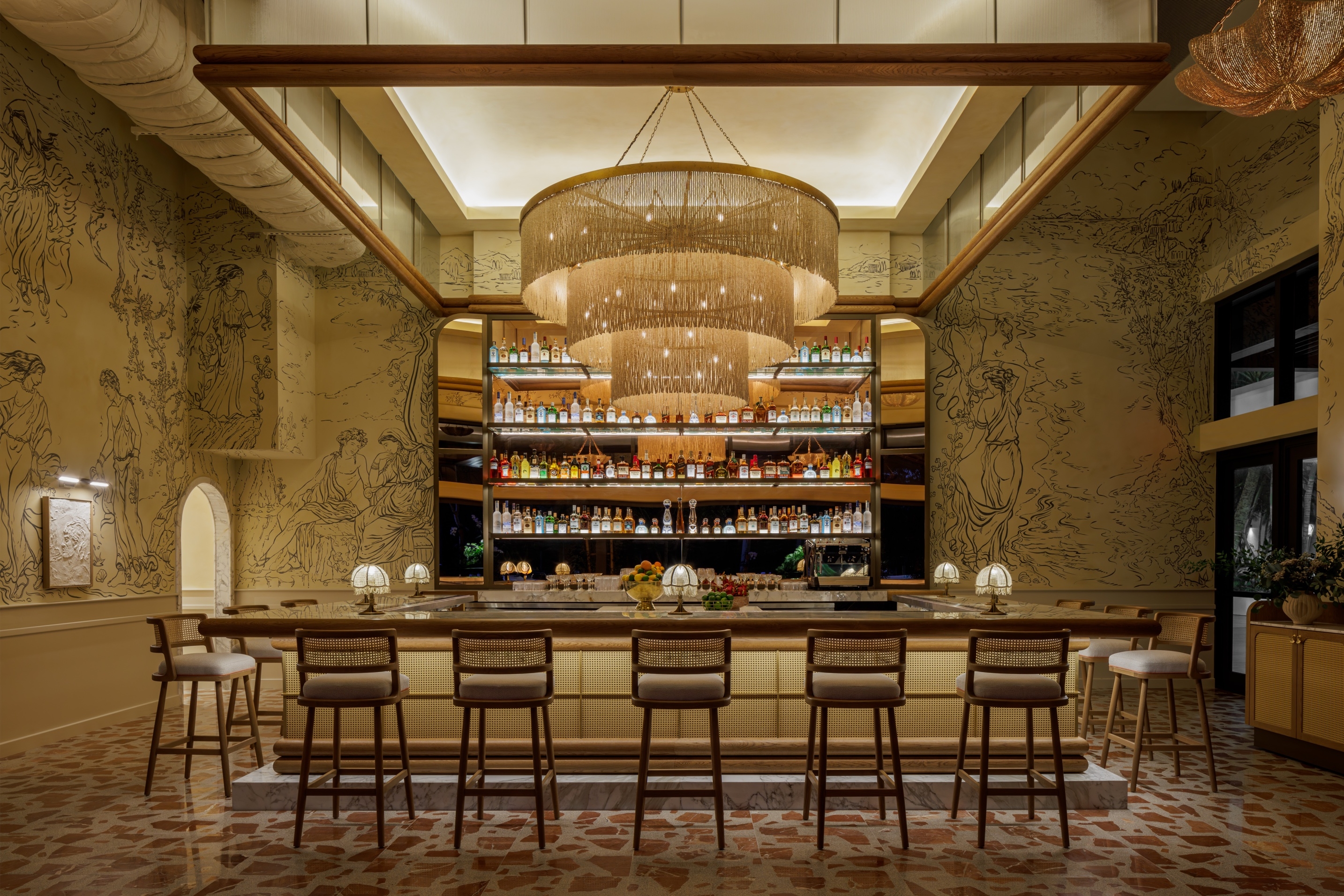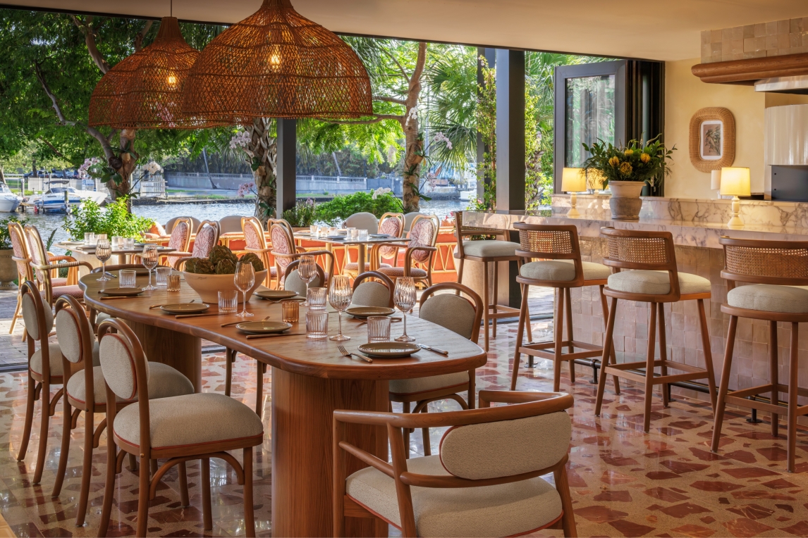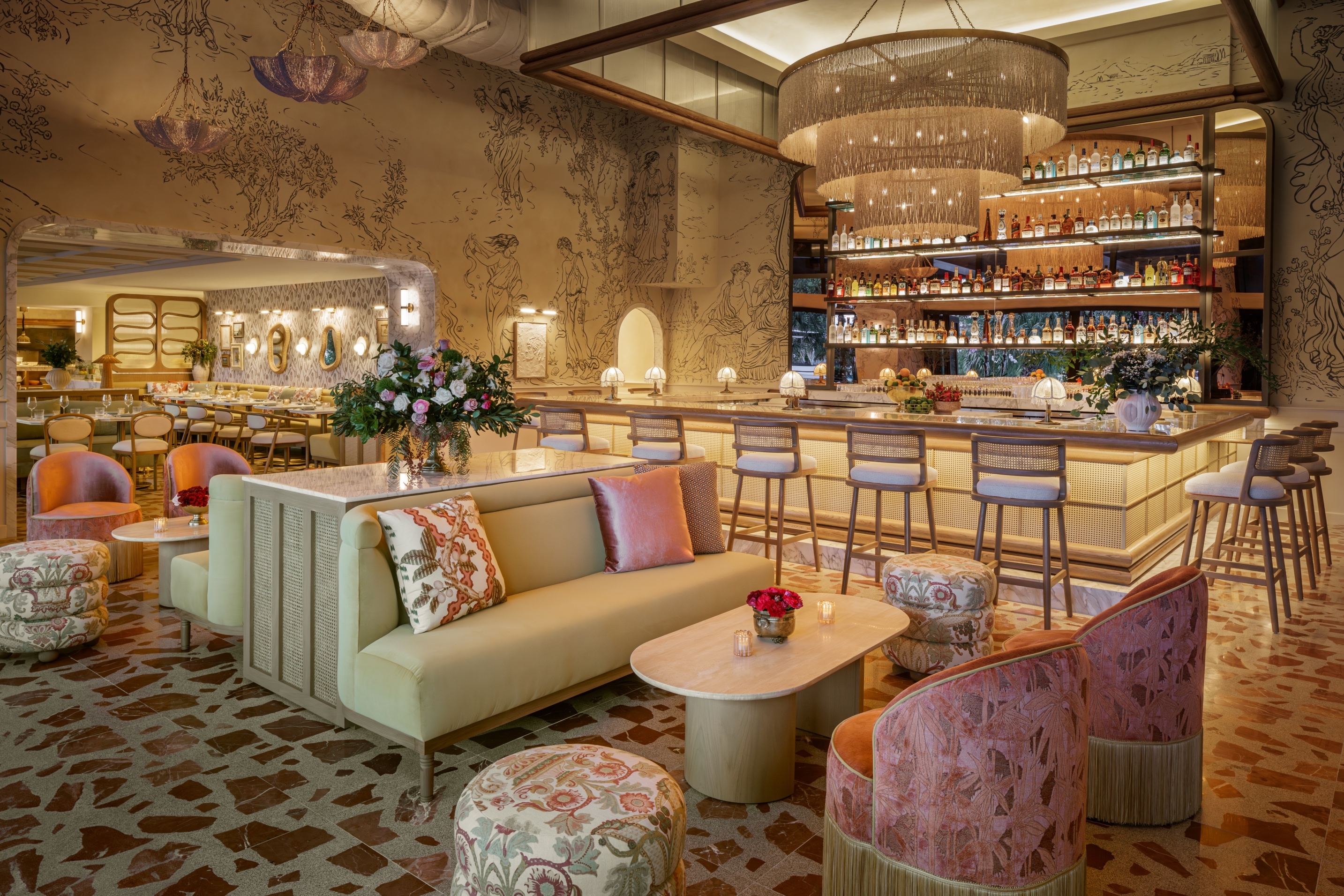 All I do is remember her... This is the tale of a man that fell in love with a woman, who loved freedom more than him, Elia. Along the Miami River "Elia" emerges as a vibrant culinary sanctuary where love and memory intertwine in a symphony of design, deeply rooted in the traditions of coastal Italy. The space is awash with bright and lively hues of pinks, greens, and reds, evoking the vibrant spirit of coastal living. The meticulously crafted main bar, echoing the allure of Elia's armoire where she applied her make up everyday, and the flooring adorned with terrazzo and marble tiles reminiscent of the vibrant stones of the coastline where they would take their frequent sunset walks. The walls are adorned with a mural depicting their tale. The mural is told in almost a greek style depicting the tragedy aspect of her leaving. Yet this is not a sad tale but one of hope because, although she left he waits for her return. The outdoor terrace adorned with cascading flowers, invite guests to bask in the warmth of the sun and the beauty of the bay where boats can come and dock. The custom furniture and lighting all talk to the natural materials of the Mediterranean and her free spirit.