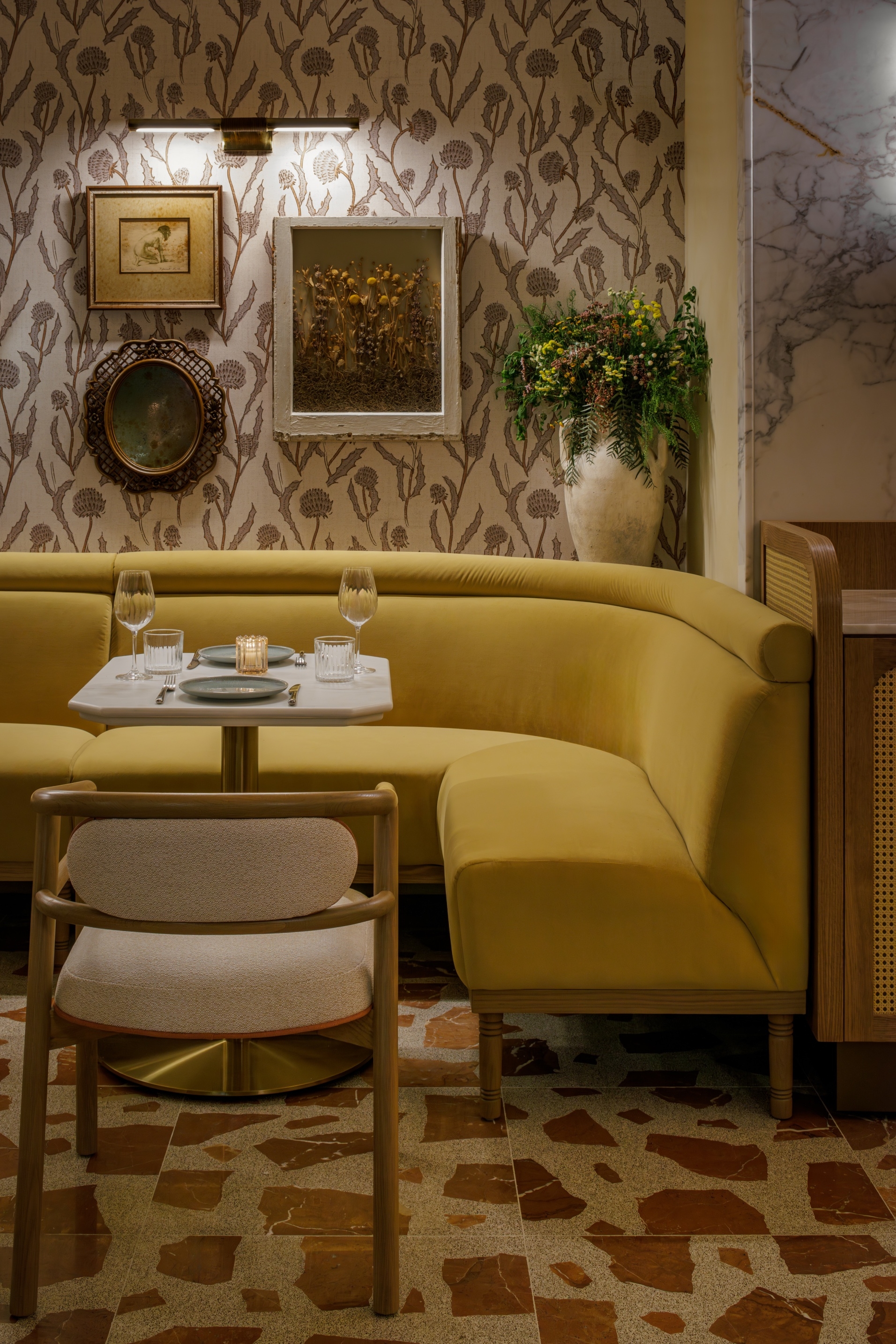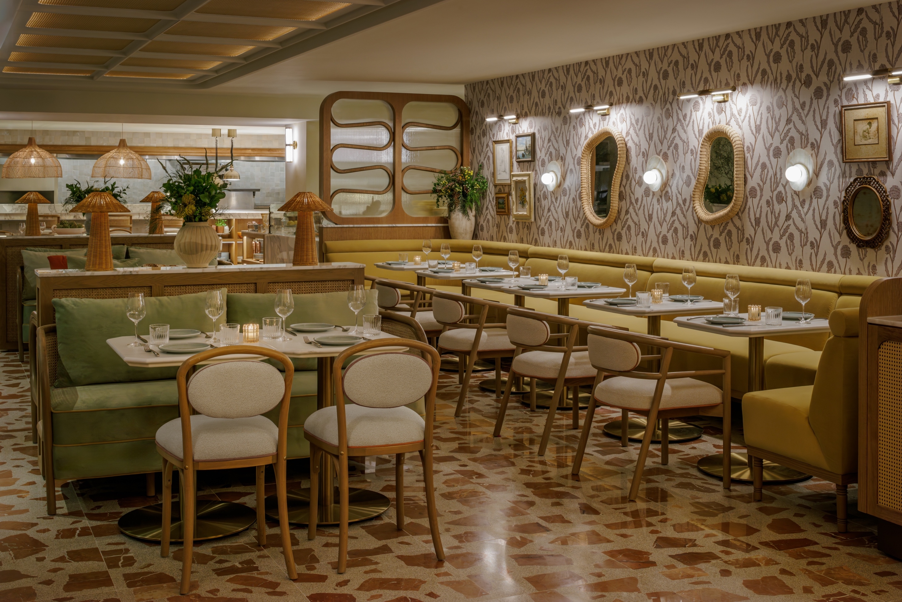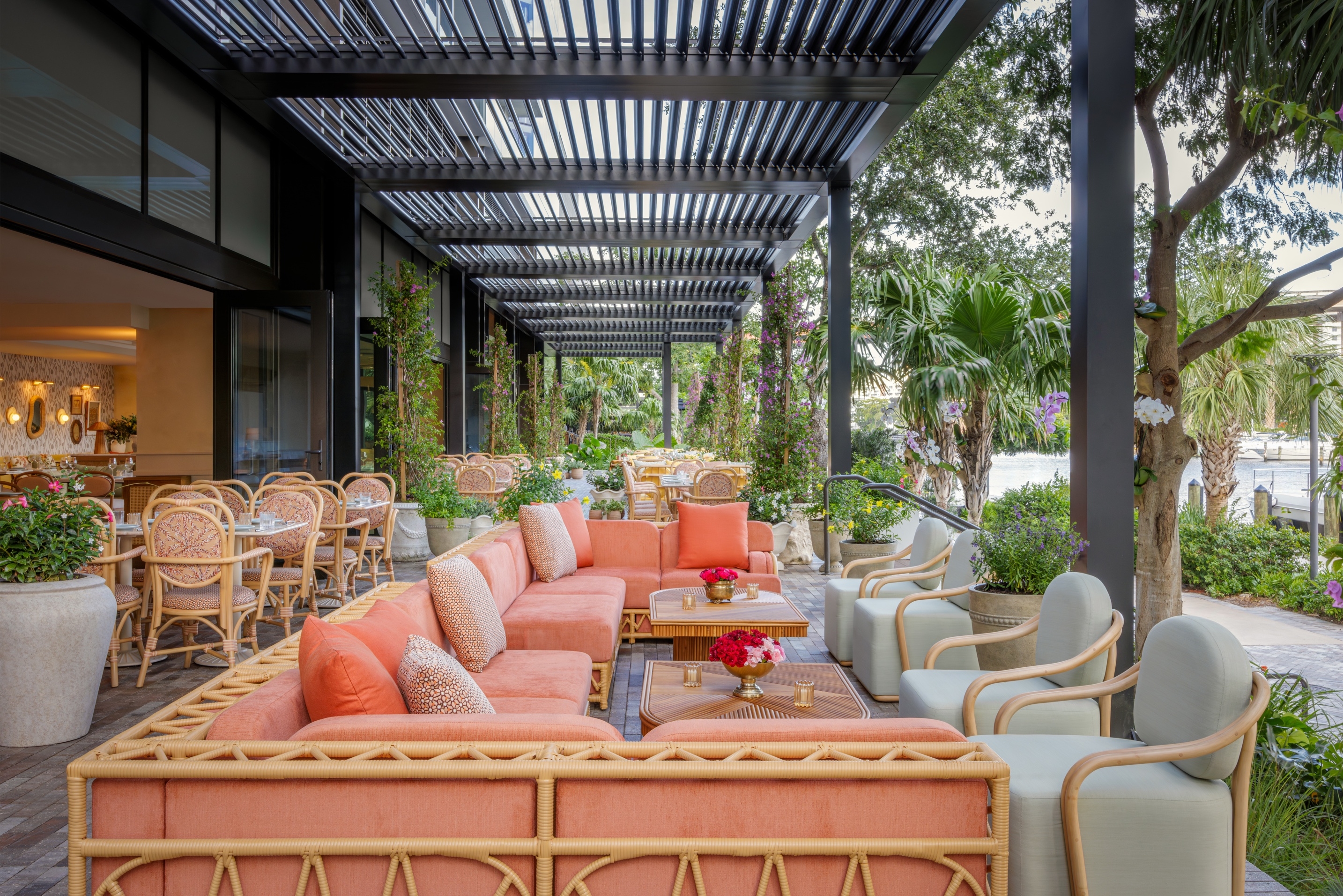All I do is remember her... This is the tale of a man that fell in love with a woman, who loved freedom more than him, Elia. Along the Miami River "Elia" emerges as a vibrant culinary sanctuary where love and memory intertwine in a symphony of design, deeply rooted in the traditions of coastal Italy. The space is awash with bright and lively hues of pinks, greens, and reds, evoking the vibrant spirit of coastal living. The meticulously crafted main bar, echoing the allure of Elia's armoire where she applied her make up everyday, and the flooring adorned with terrazzo and marble tiles reminiscent of the vibrant stones of the coastline where they would take their frequent sunset walks. The walls are adorned with a mural depicting their tale. The mural is told in almost a greek style depicting the tragedy aspect of her leaving. Yet this is not a sad tale but one of hope because, although she left he waits for her return. The outdoor terrace adorned with cascading flowers, invite guests to bask in the warmth of the sun and the beauty of the bay where boats can come and dock. The custom furniture and lighting all talk to the natural materials of the Mediterranean and her free spirit.