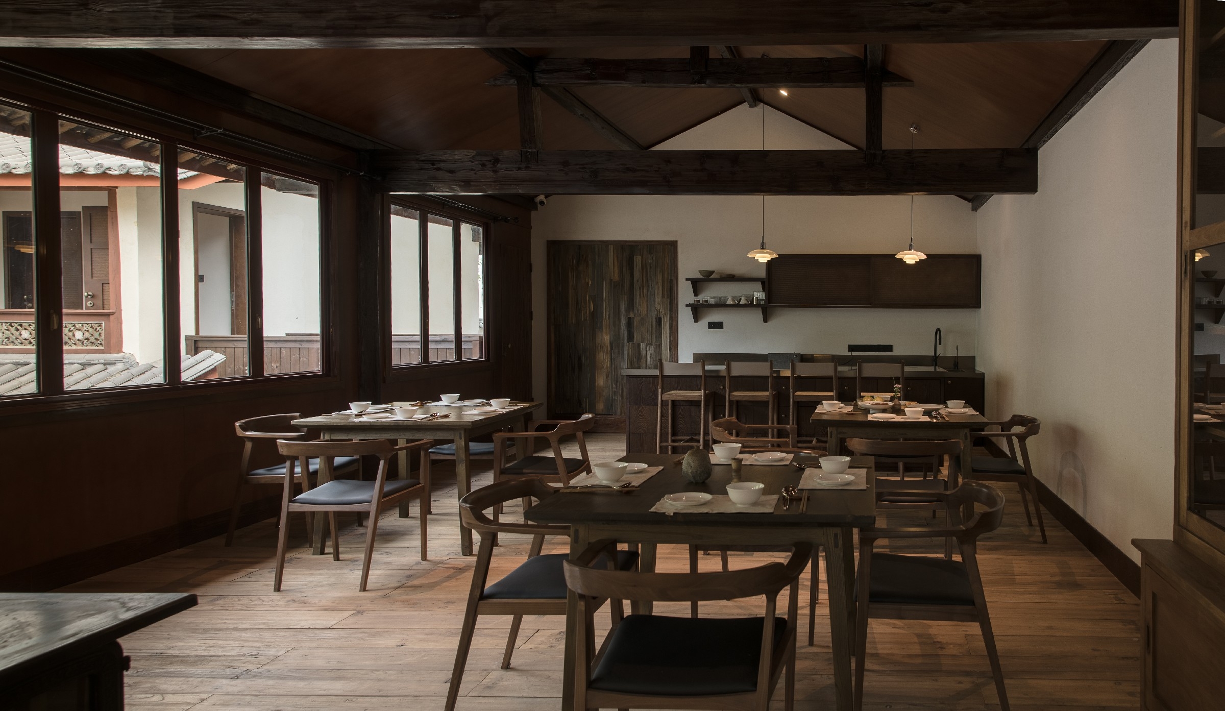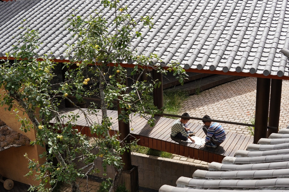 We retained most of the original layout and preserved key living elements in the courtyard, such as the living room with a fireplace and the old kitchen where various foods can be prepared. We also added some modern features, like transforming the sun terrace into a lookout point and adding an activity room to the living room. We kept the original shadowy ambiance of the guest rooms while making the courtyard more communal. This way, both villagers and guests can find their own corner to live in.