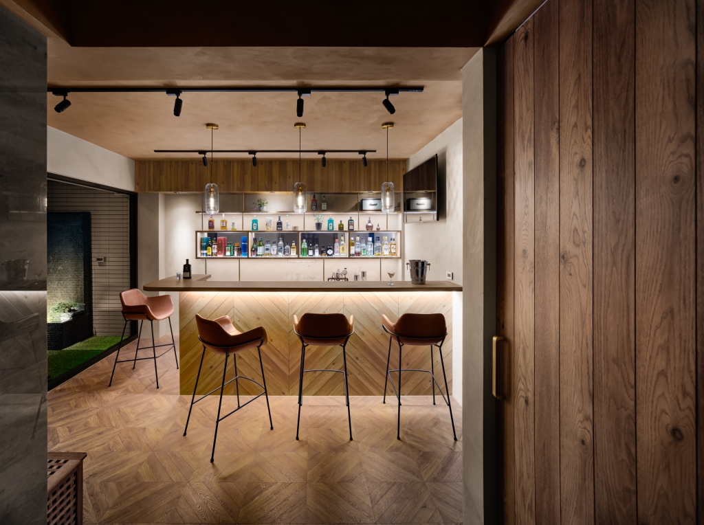 With minimal demolition of the old structure, the design conserves space by using color-coordinated materials to establish distinct thematic styles for each layer of space. Beyond private recreation, it serves as a hospitality venue for the homeowners to share enjoyment of life with friends.