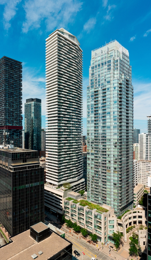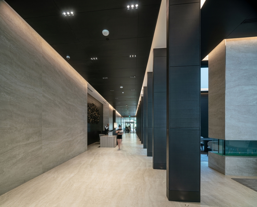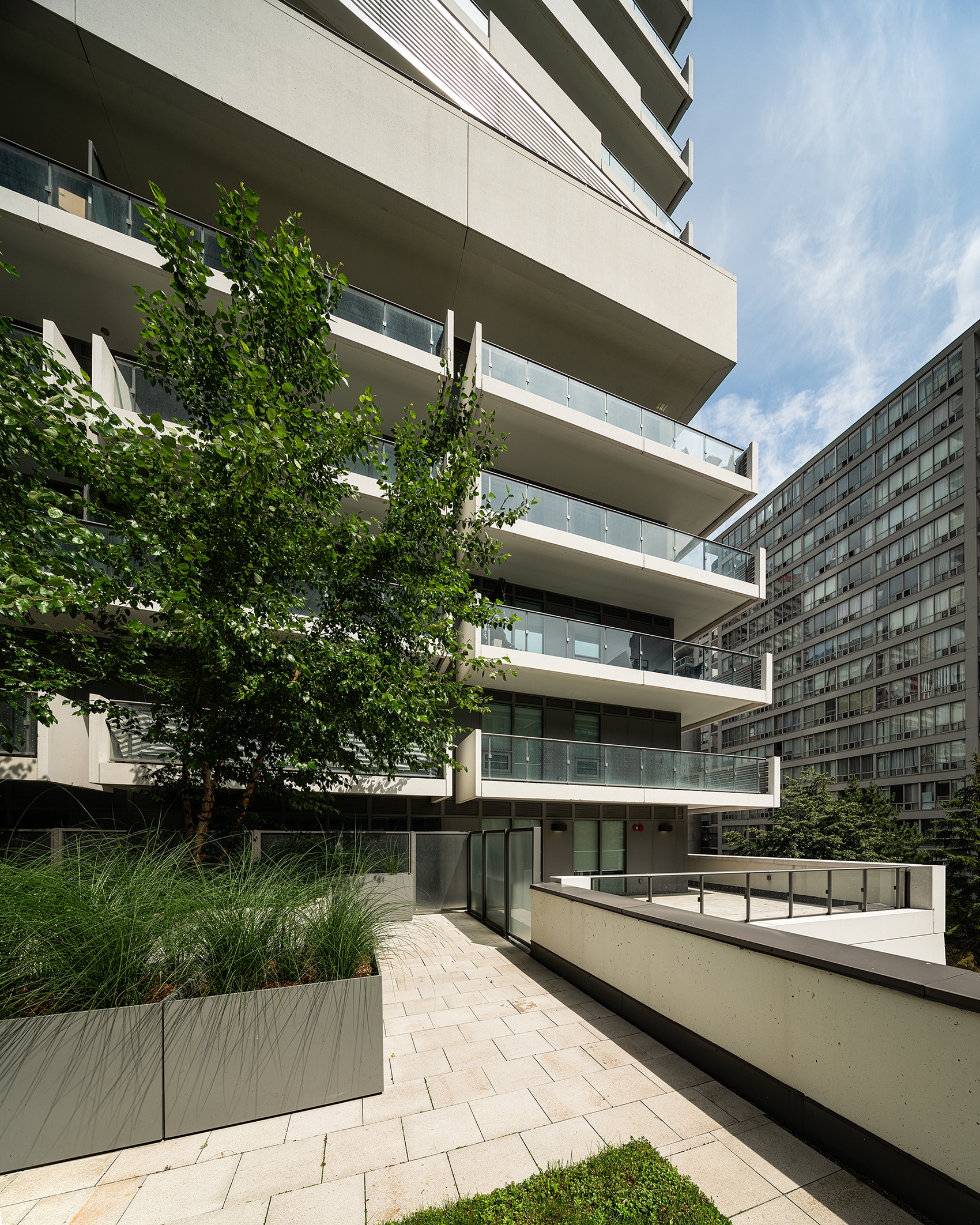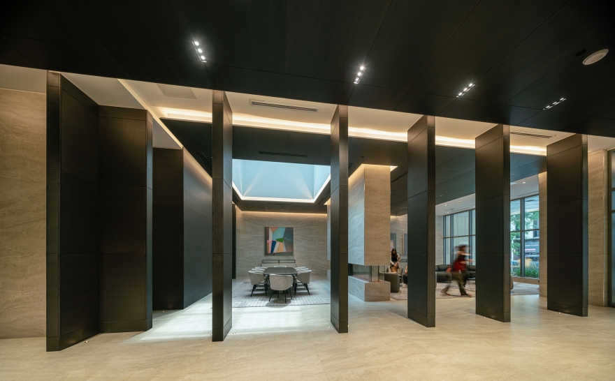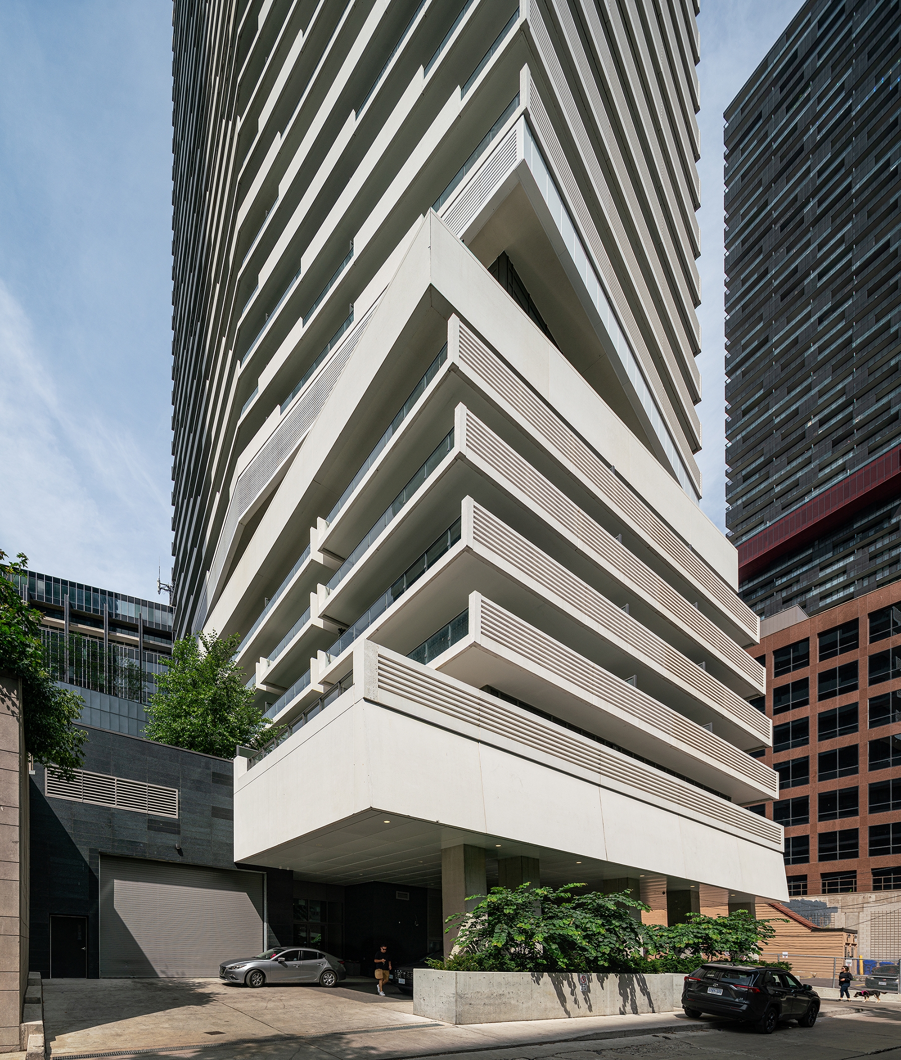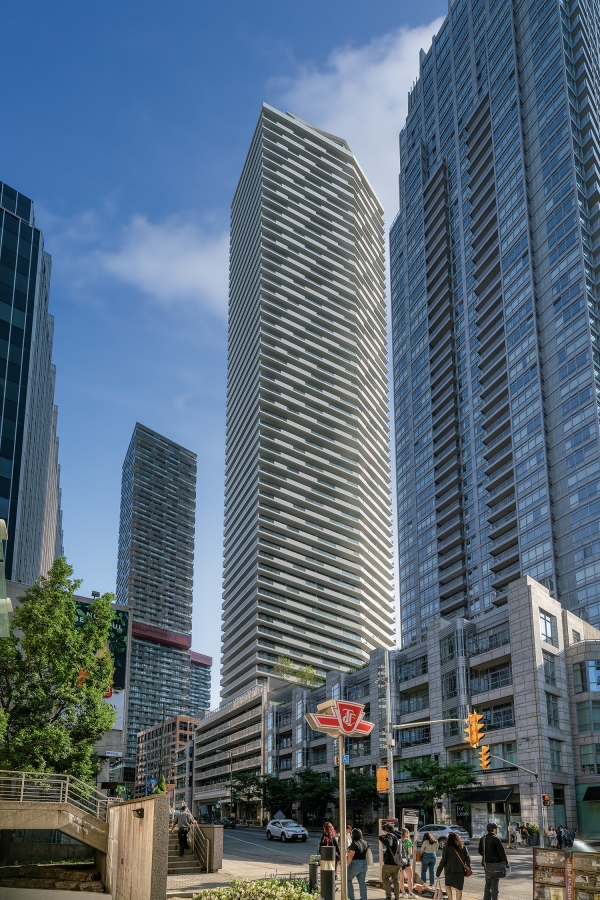 This project stands out from Toronto’s glass towers by integrating terraces as central design features. The main tower’s cantilevered wrap-around terraces evoke modernist luxury, offering outdoor space, shading, and privacy, with upturned edges creating a distinctive pattern on the north and south façades. Floor-to-ceiling windows provide abundant light and views. The tower’s unique silhouette, created by canting three sides, directs views around adjacent towers. Positioned askew from the six-story podium, the design generates outdoor spaces around the amenity floor, separated by double-height glass. The tower’s broad north and south façades optimize views, while the slender east and west sides create a slim street presence, capped with a sculptural metal roof. The podium features long balconies with perforated facades, a stone-clad border, and a clear glass storefront. A spacious lobby connects the front and rear, with a sloped garden visible from Yonge Street and a grand porte-cochere at the rear.