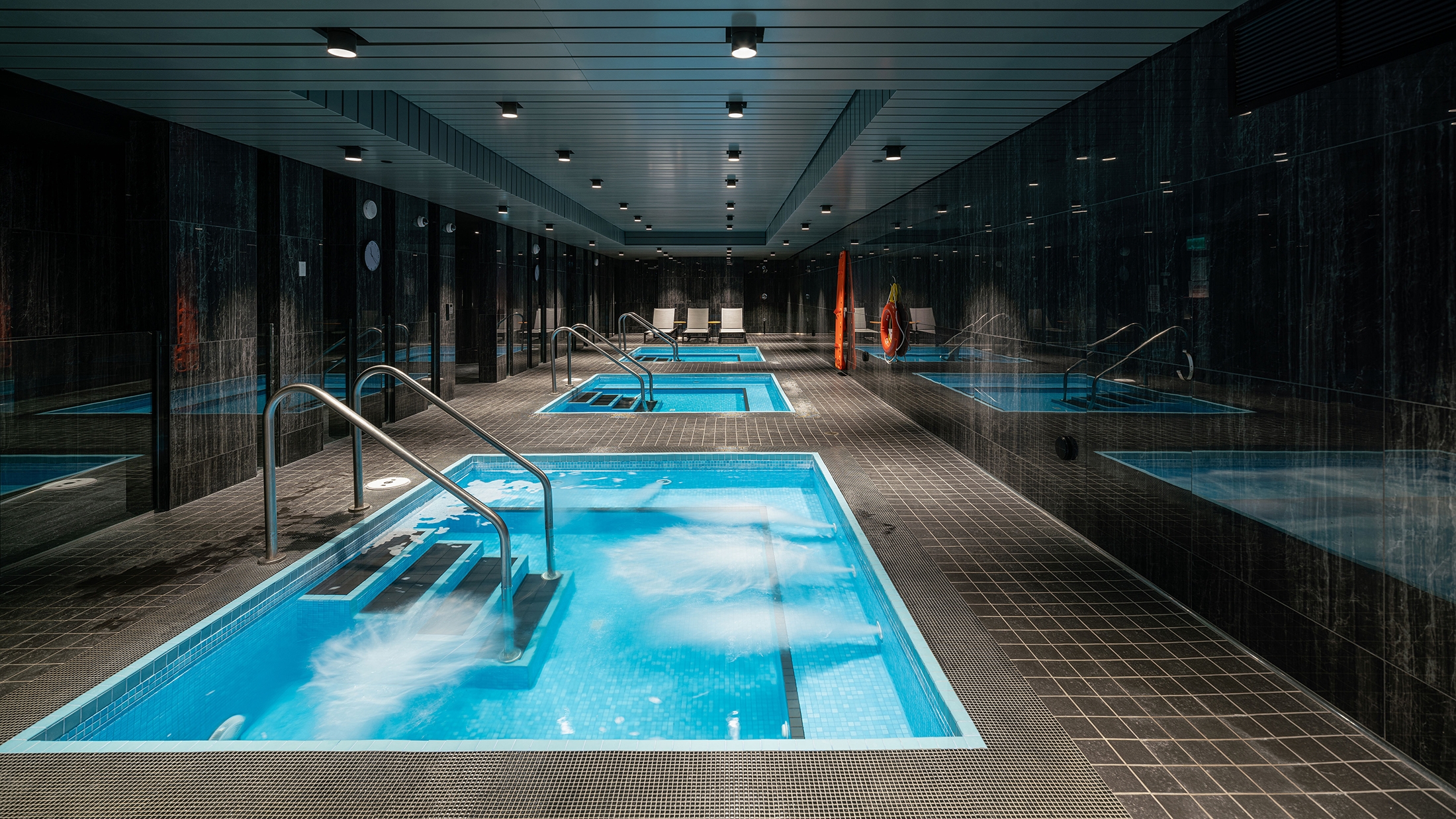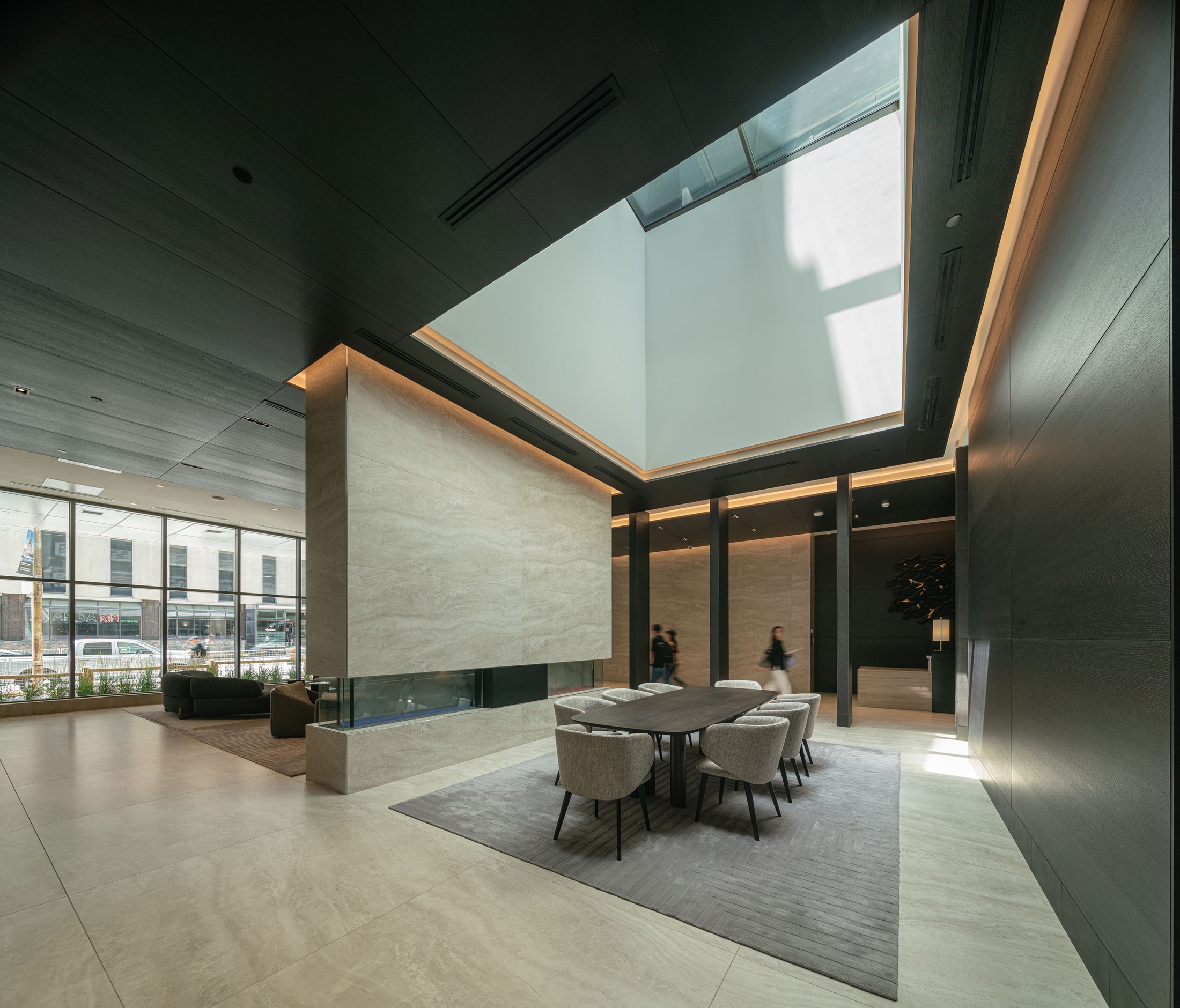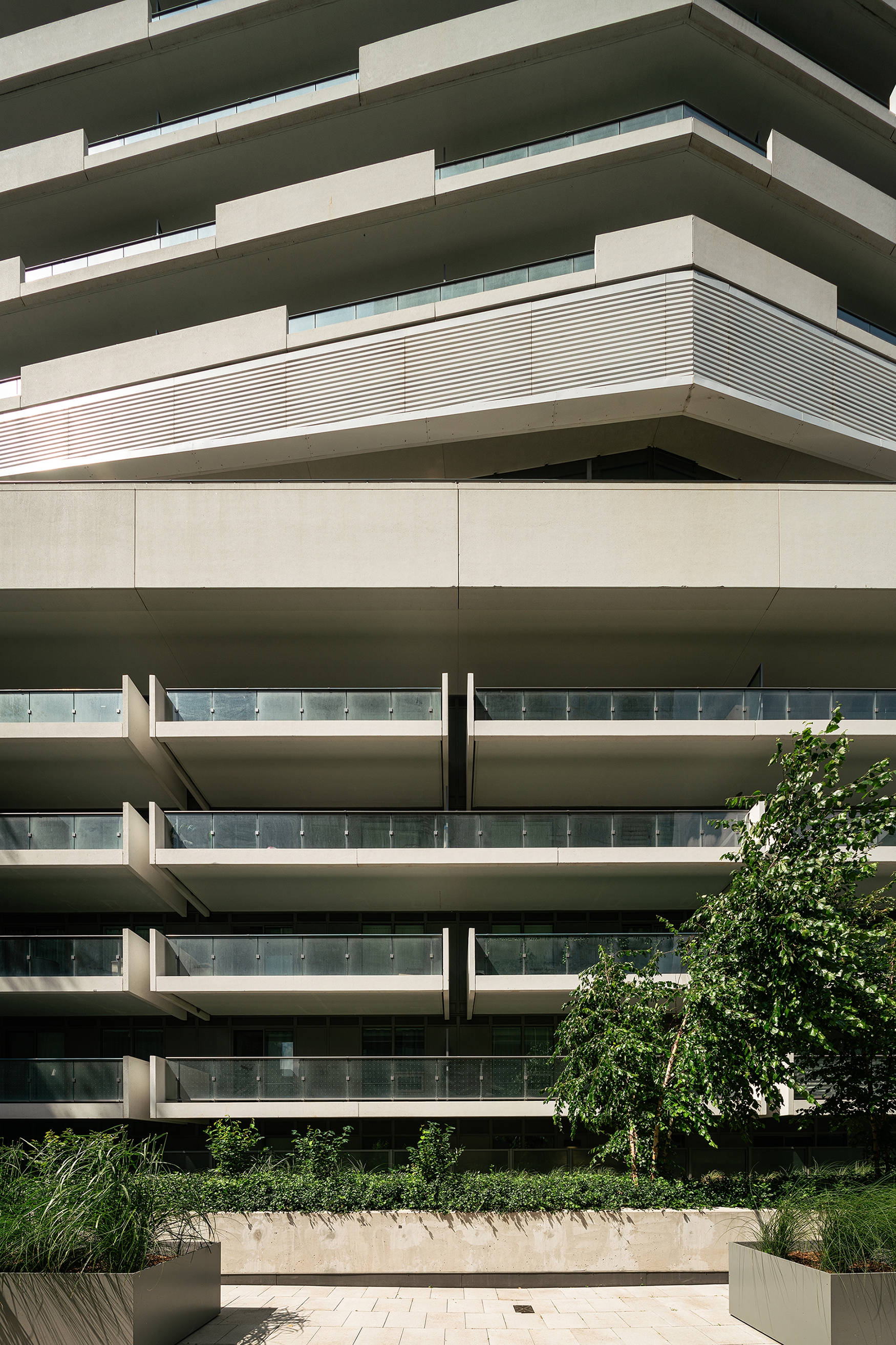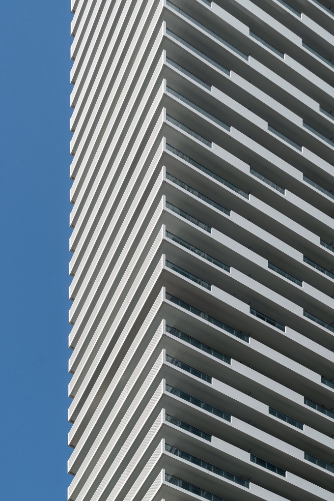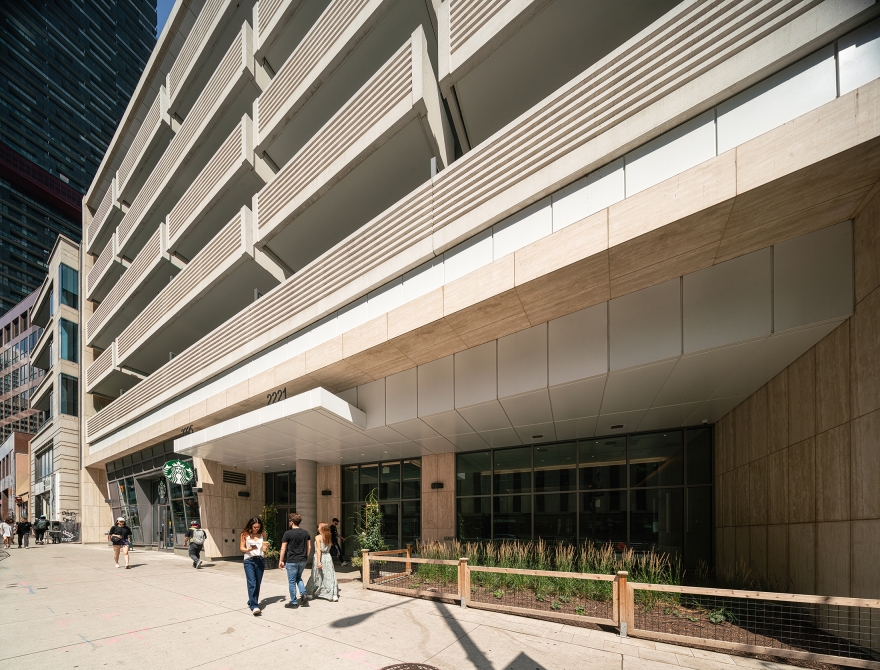 This project stands out from Toronto’s glass towers by integrating terraces as central design features. The main tower’s cantilevered wrap-around terraces evoke modernist luxury, offering outdoor space, shading, and privacy, with upturned edges creating a distinctive pattern on the north and south façades. Floor-to-ceiling windows provide abundant light and views. The tower’s unique silhouette, created by canting three sides, directs views around adjacent towers. Positioned askew from the six-story podium, the design generates outdoor spaces around the amenity floor, separated by double-height glass. The tower’s broad north and south façades optimize views, while the slender east and west sides create a slim street presence, capped with a sculptural metal roof. The podium features long balconies with perforated facades, a stone-clad border, and a clear glass storefront. A spacious lobby connects the front and rear, with a sloped garden visible from Yonge Street and a grand porte-cochere at the rear.