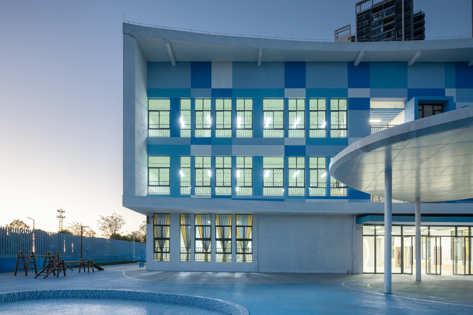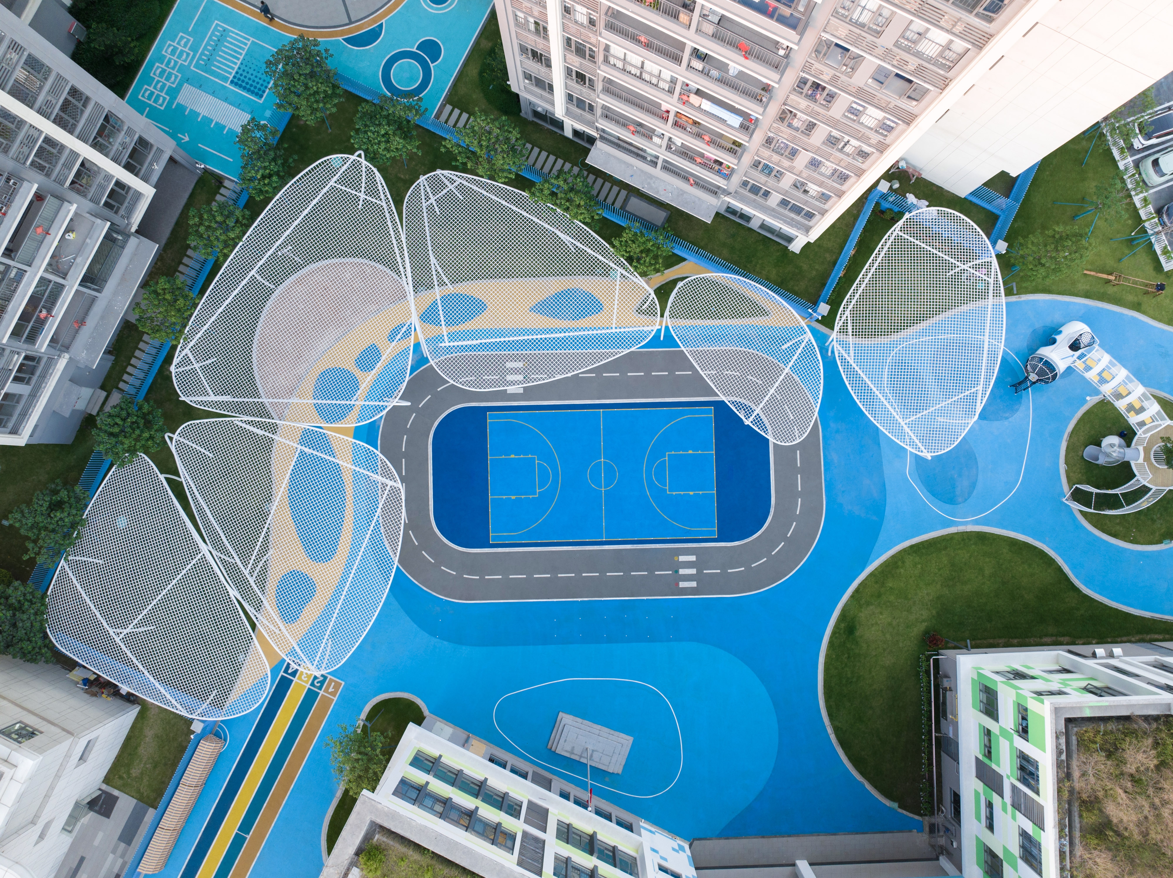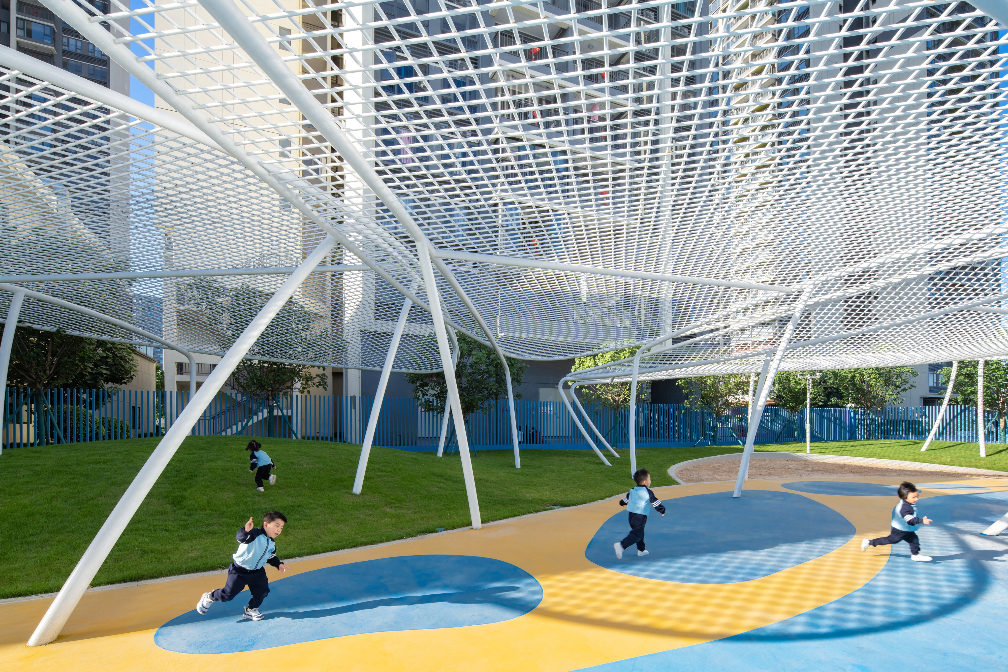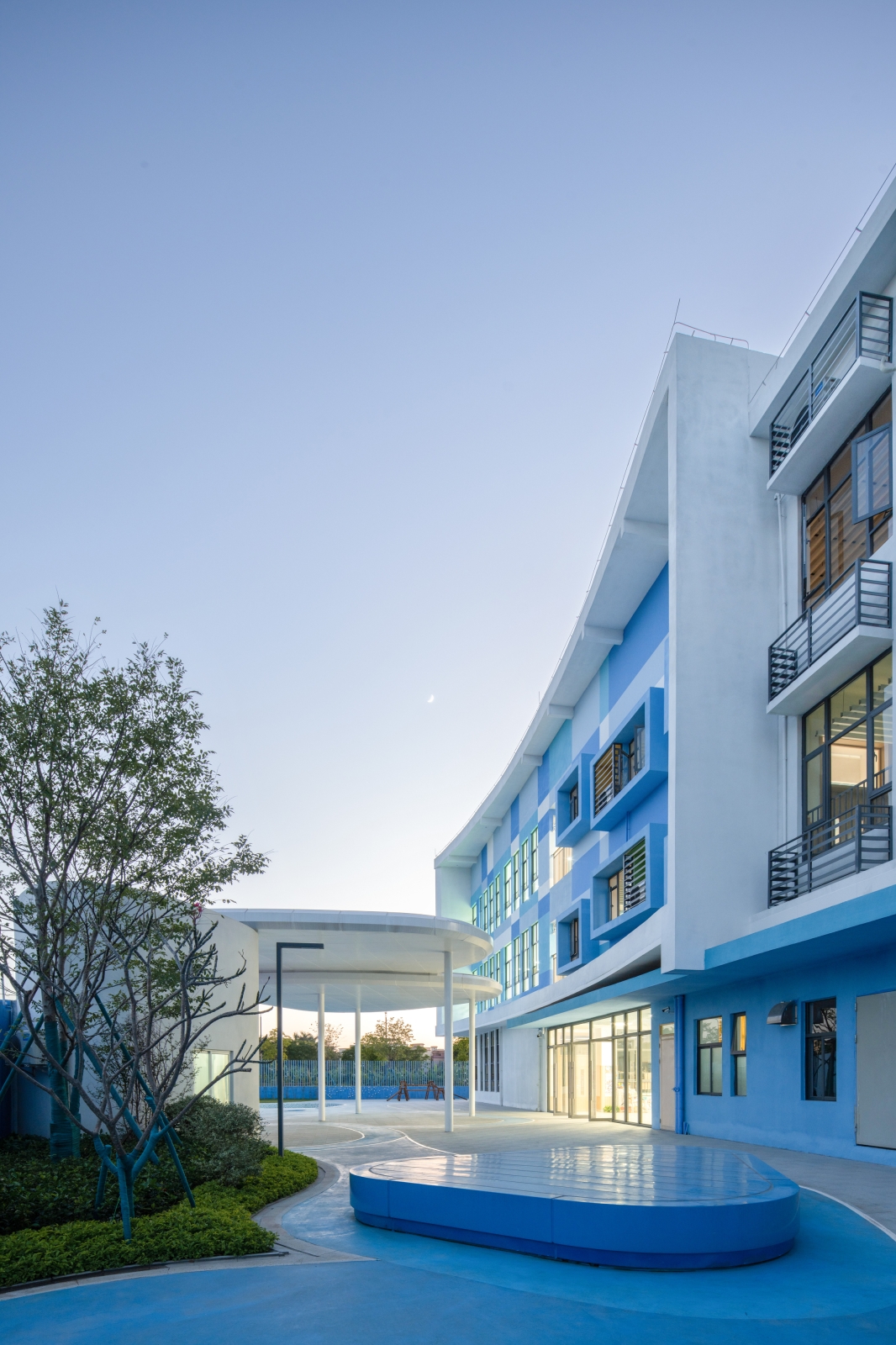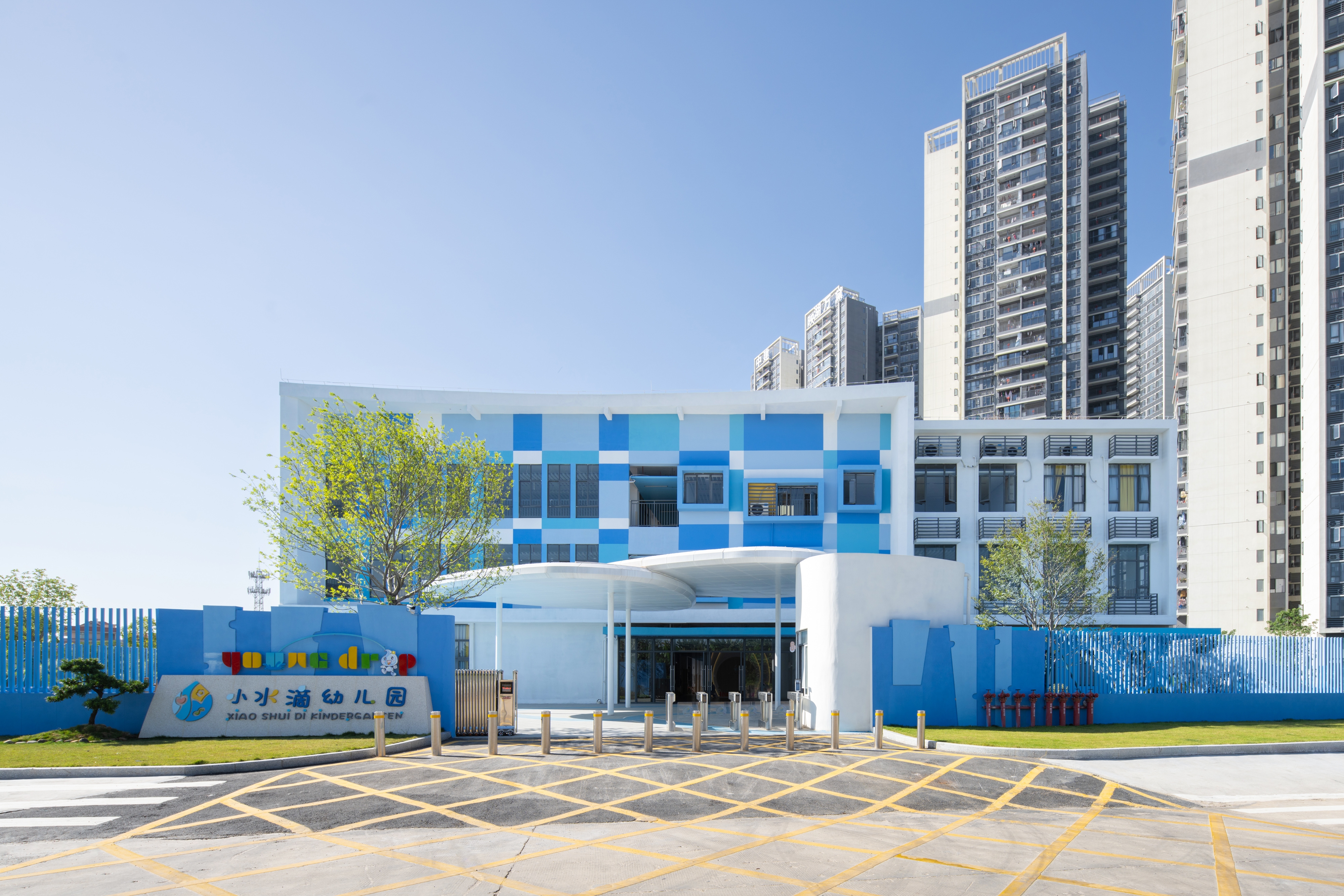 The existing building, serving as a kindergarten, is a part of the facilities of unoccupied properties. The main structure and facade of the building has been completed, with the design task focusing on its exterior landscape and optimizing certain parts of the facade.To integrate the fragmented spaces, a circular pathway was need, which was inspired by the cycle of water: the journey of a tiny water droplet through nature. This pathway can connect the narrow area on the southern side, the inner courtyard of the building, and the activity area on the northern side into a unified whole.The entire landscape system revolves around different states of water in the natural cycle: as clouds, rain or mist, ponds, and even the ocean; as well as formations in the ocean such as islands, sand dunes, sandbars, and even marine life.Through the adventures of water droplets, we've given the site unique significance, created a series of corresponding activity spaces, and provided an immersive environment for children to explore freely. We hope to increase children's interest and extend the duration of their outdoor activities through this.