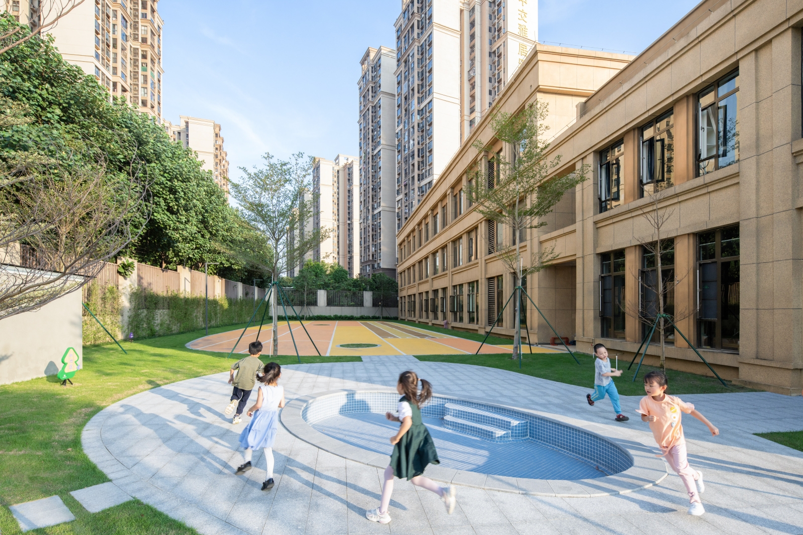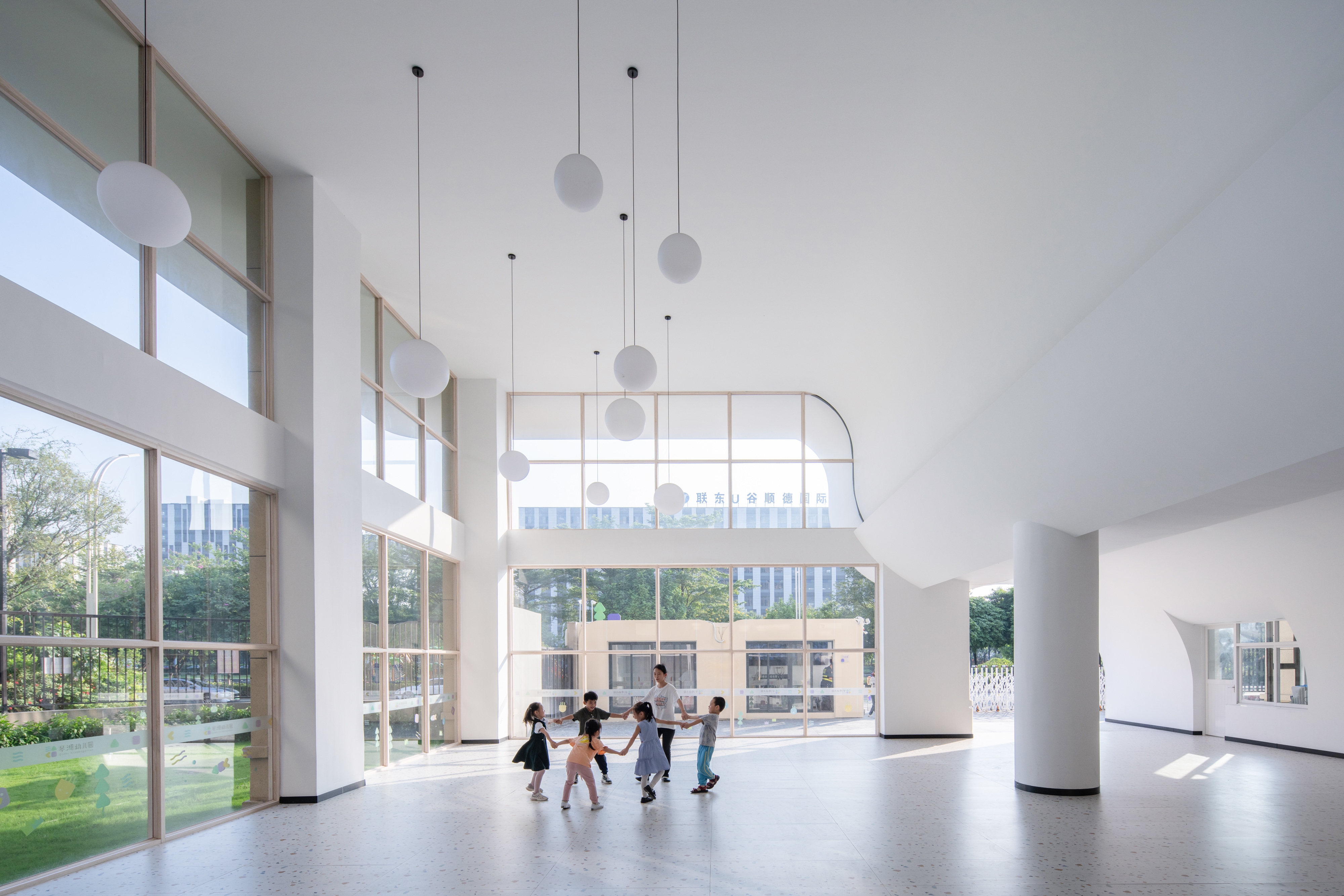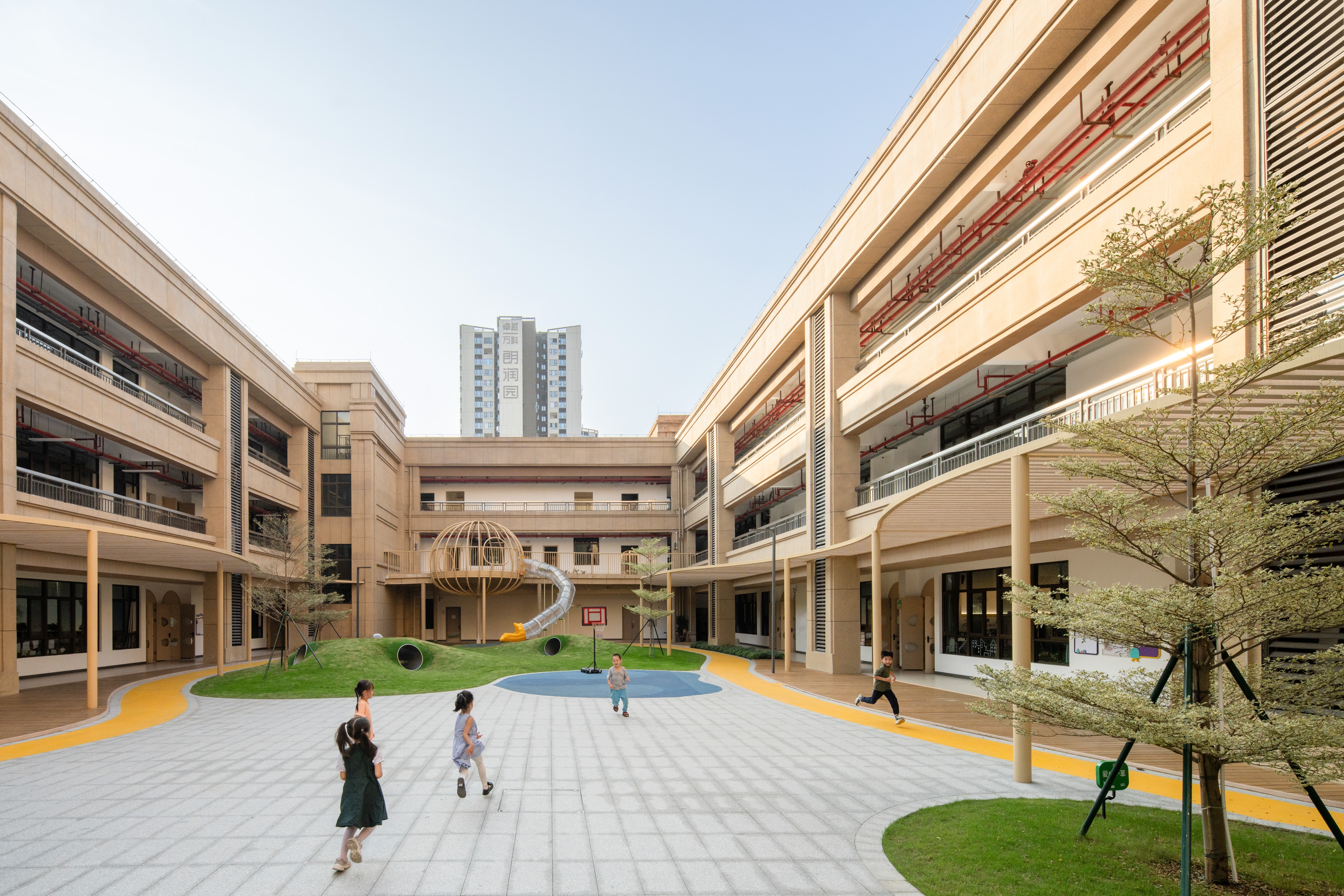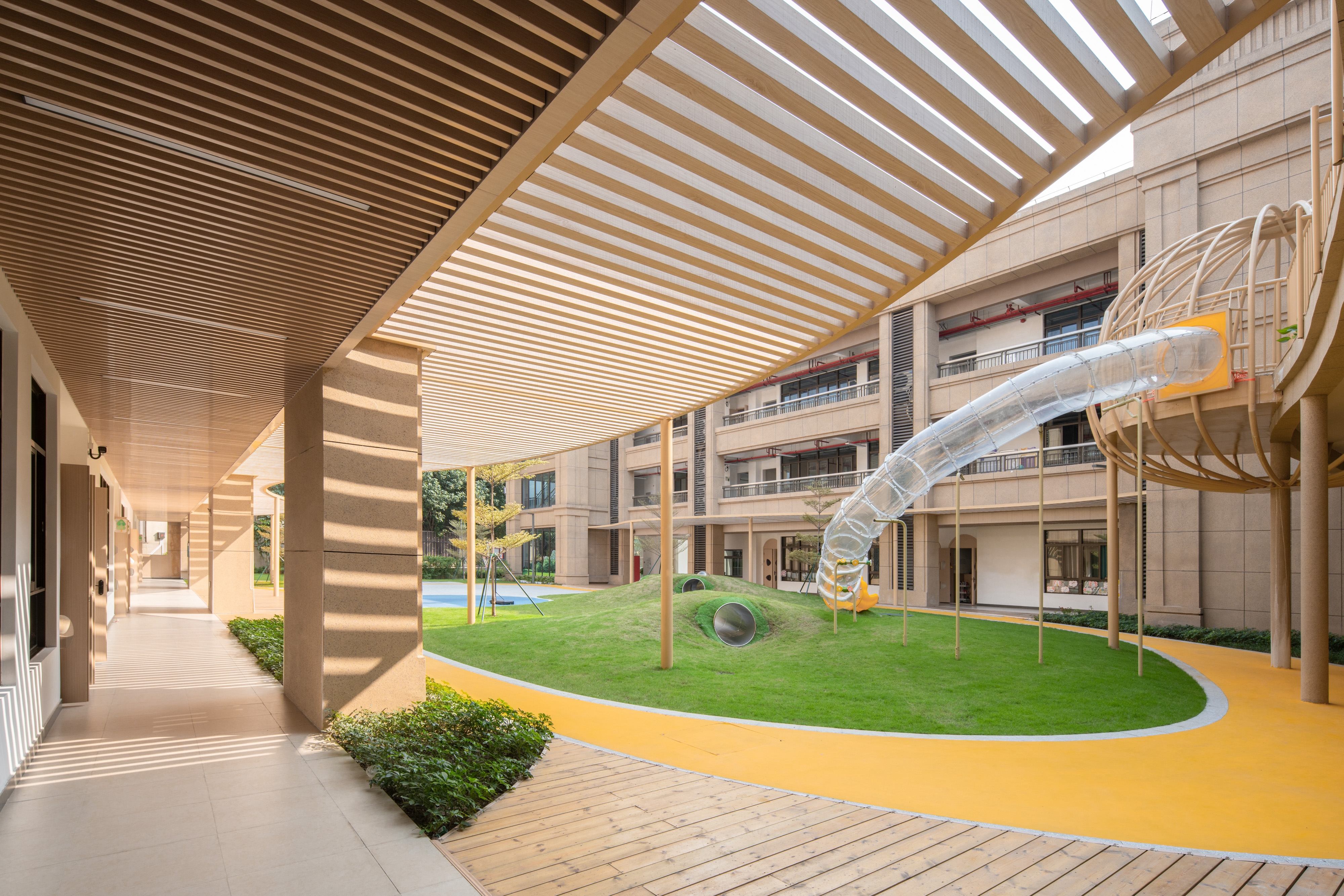 The architectural layout presents a U-shaped configuration, creating a semi-enclosed inner courtyard within the site, along with open space surrounding the perimeter of the building.Located to the south of Qinhu Wetland Park, we aimed to infuse the natural landscape of the park into the kindergarten, making it full of wilderness and fun. This became the primary goal of our renovation. At the same time, we intended to allow children to explore, play, and experience nature, creating an immersive natural teaching environment.We divided the outdoor space into three natural themed areas: “Learning in the Wilds”, “Exploring in the Wilds” and “Playing in the Wilds”.Through renovation, the formerly rigid architectural image has become a place where green plants thrive, making it vibrant and lively. The “Wild Fun Park” has also become a beloved activity area for the children.We believe that nature is the best teacher. In the rapidly changing “concrete jungle”, we aim to create more natural environments for children to interact with and plant the seeds of nature in their hearts.