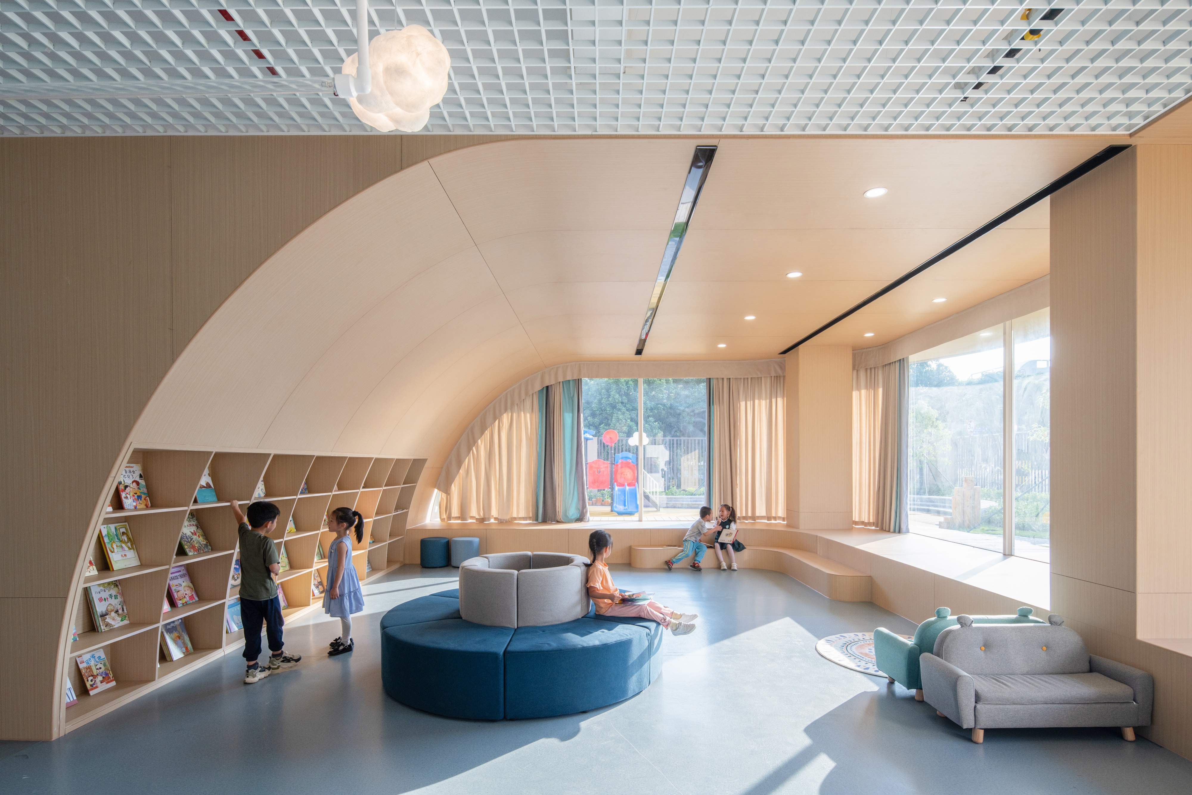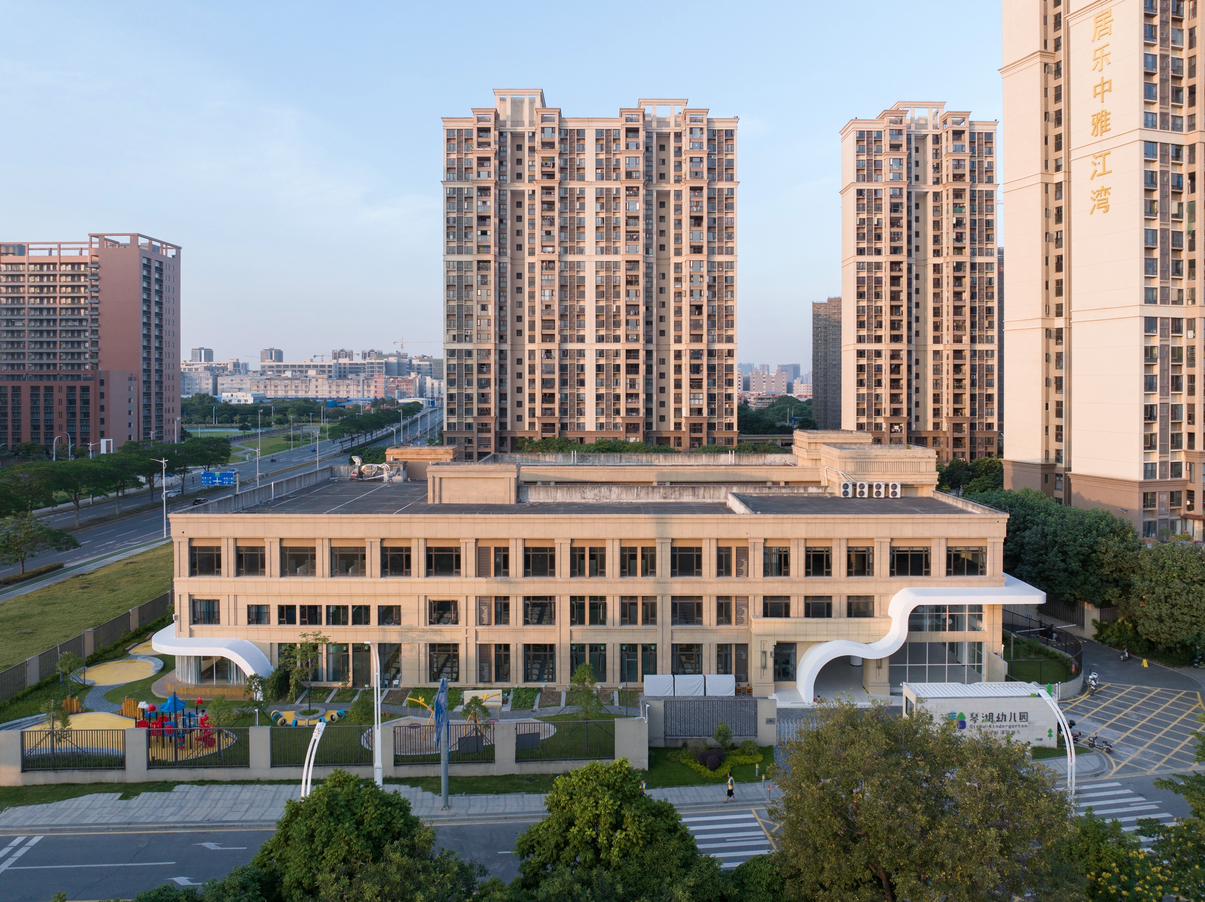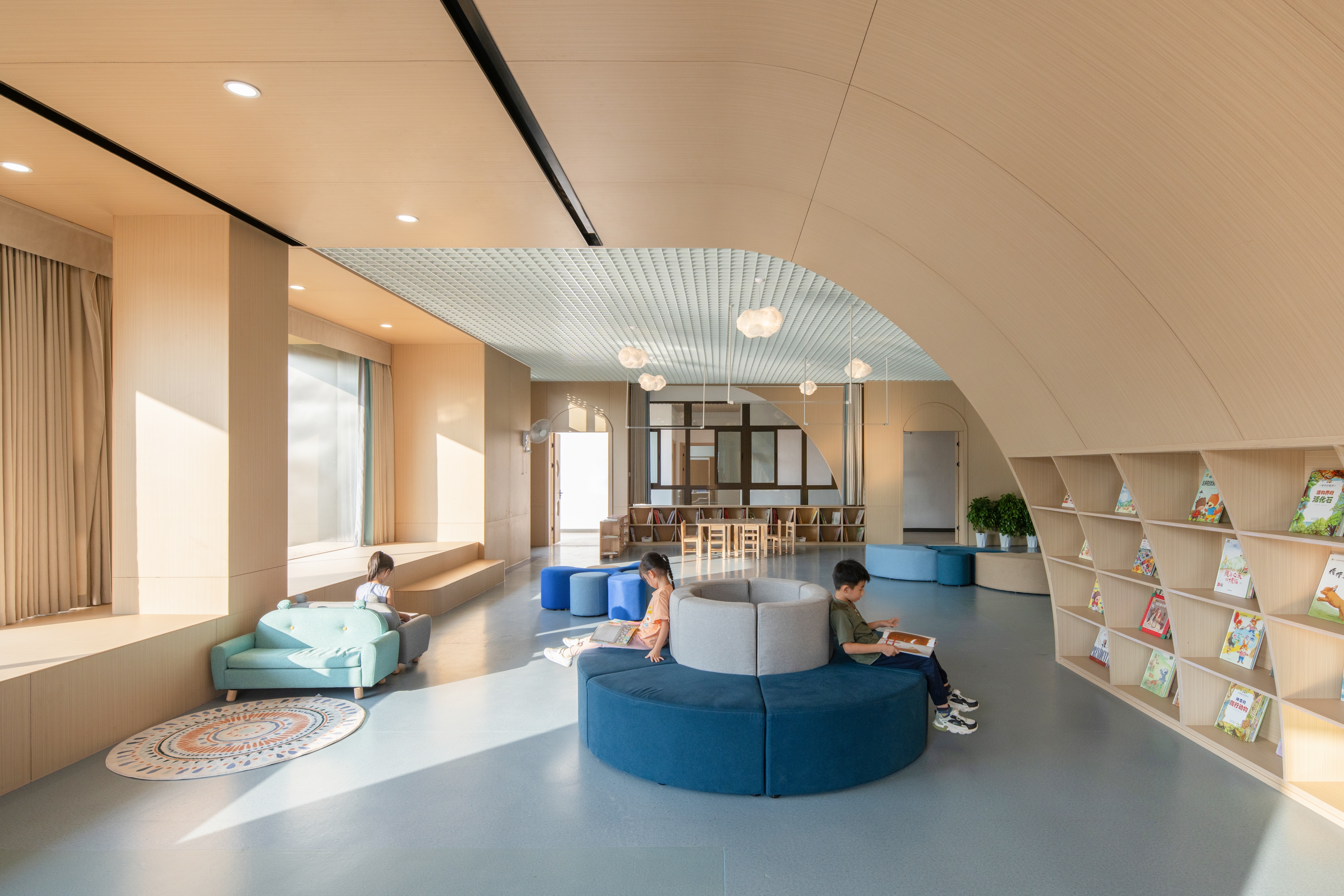 The architectural layout presents a U-shaped configuration, creating a semi-enclosed inner courtyard within the site, along with open space surrounding the perimeter of the building.Located to the south of Qinhu Wetland Park, we aimed to infuse the natural landscape of the park into the kindergarten, making it full of wilderness and fun. This became the primary goal of our renovation. At the same time, we intended to allow children to explore, play, and experience nature, creating an immersive natural teaching environment.We divided the outdoor space into three natural themed areas: “Learning in the Wilds”, “Exploring in the Wilds” and “Playing in the Wilds”.Through renovation, the formerly rigid architectural image has become a place where green plants thrive, making it vibrant and lively. The “Wild Fun Park” has also become a beloved activity area for the children.We believe that nature is the best teacher. In the rapidly changing “concrete jungle”, we aim to create more natural environments for children to interact with and plant the seeds of nature in their hearts.