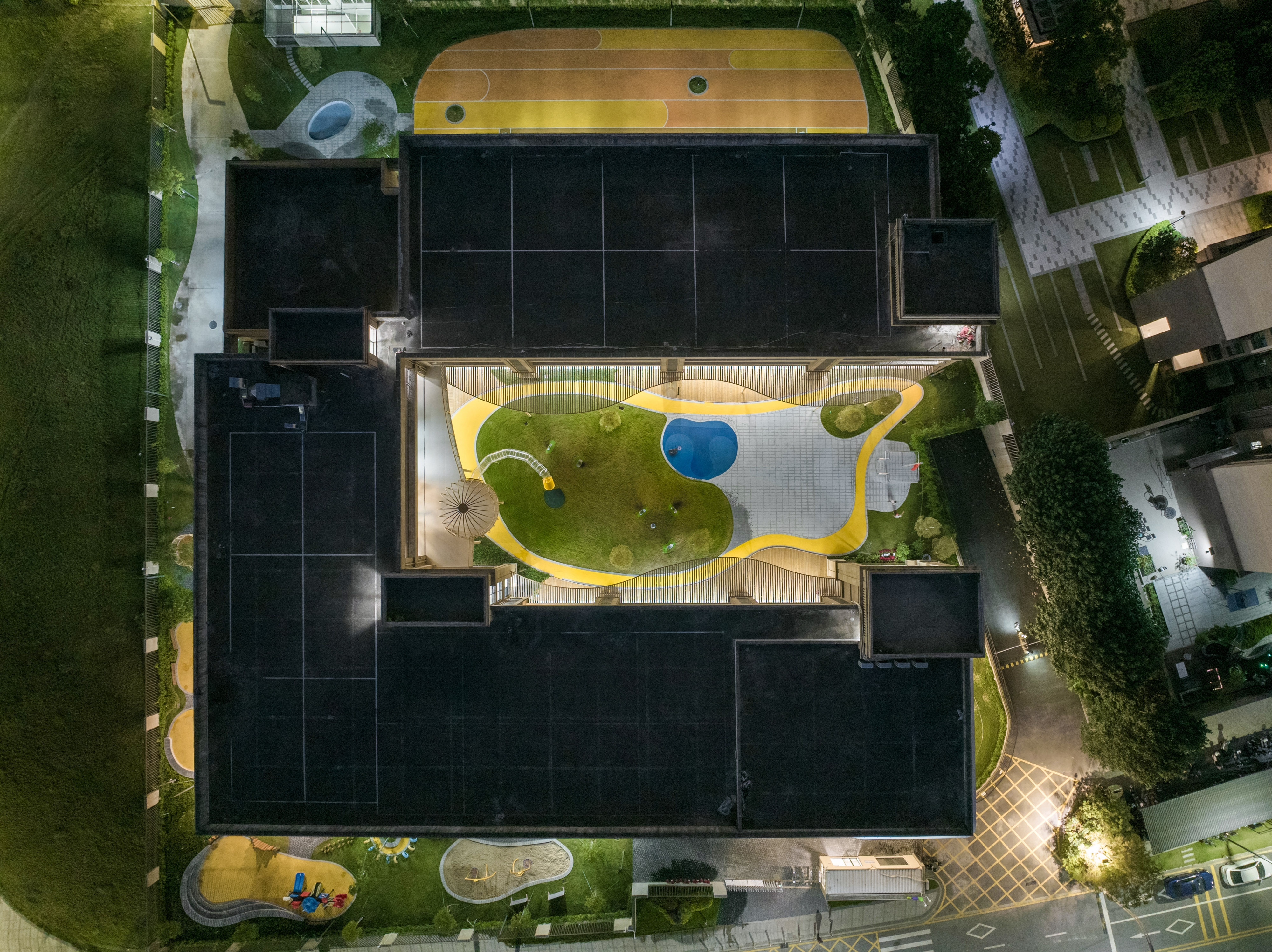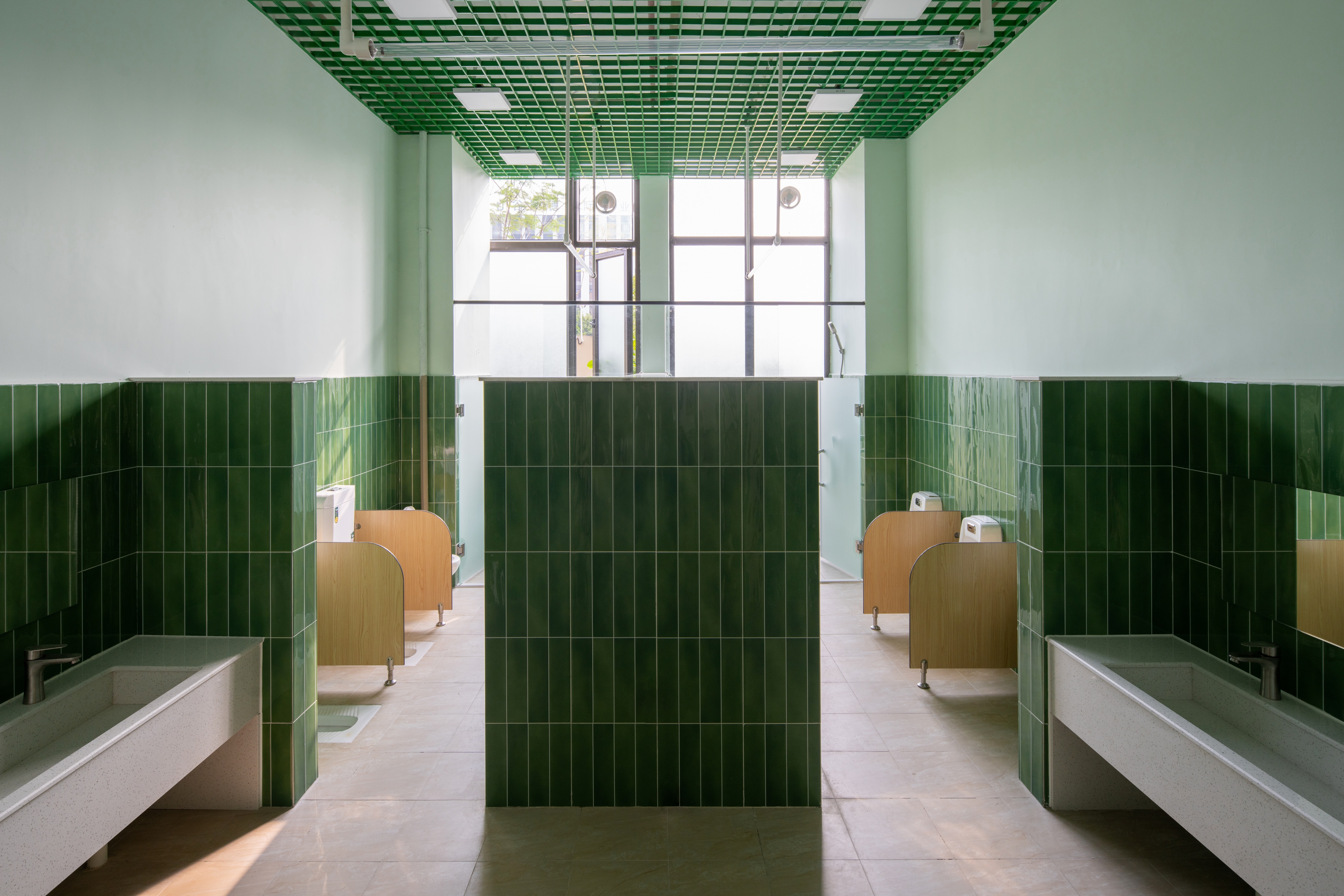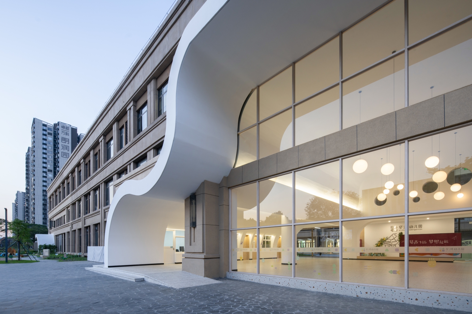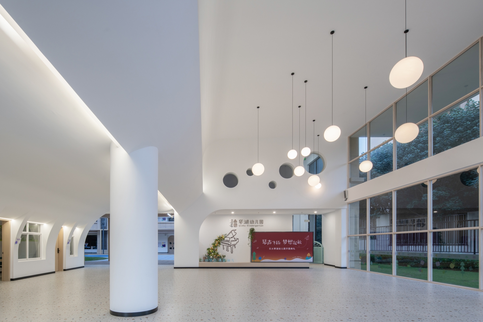 The architectural layout presents a U-shaped configuration, creating a semi-enclosed inner courtyard within the site, along with open space surrounding the perimeter of the building.Located to the south of Qinhu Wetland Park, we aimed to infuse the natural landscape of the park into the kindergarten, making it full of wilderness and fun. This became the primary goal of our renovation. At the same time, we intended to allow children to explore, play, and experience nature, creating an immersive natural teaching environment.We divided the outdoor space into three natural themed areas: “Learning in the Wilds”, “Exploring in the Wilds” and “Playing in the Wilds”.Through renovation, the formerly rigid architectural image has become a place where green plants thrive, making it vibrant and lively. The “Wild Fun Park” has also become a beloved activity area for the children.We believe that nature is the best teacher. In the rapidly changing “concrete jungle”, we aim to create more natural environments for children to interact with and plant the seeds of nature in their hearts.