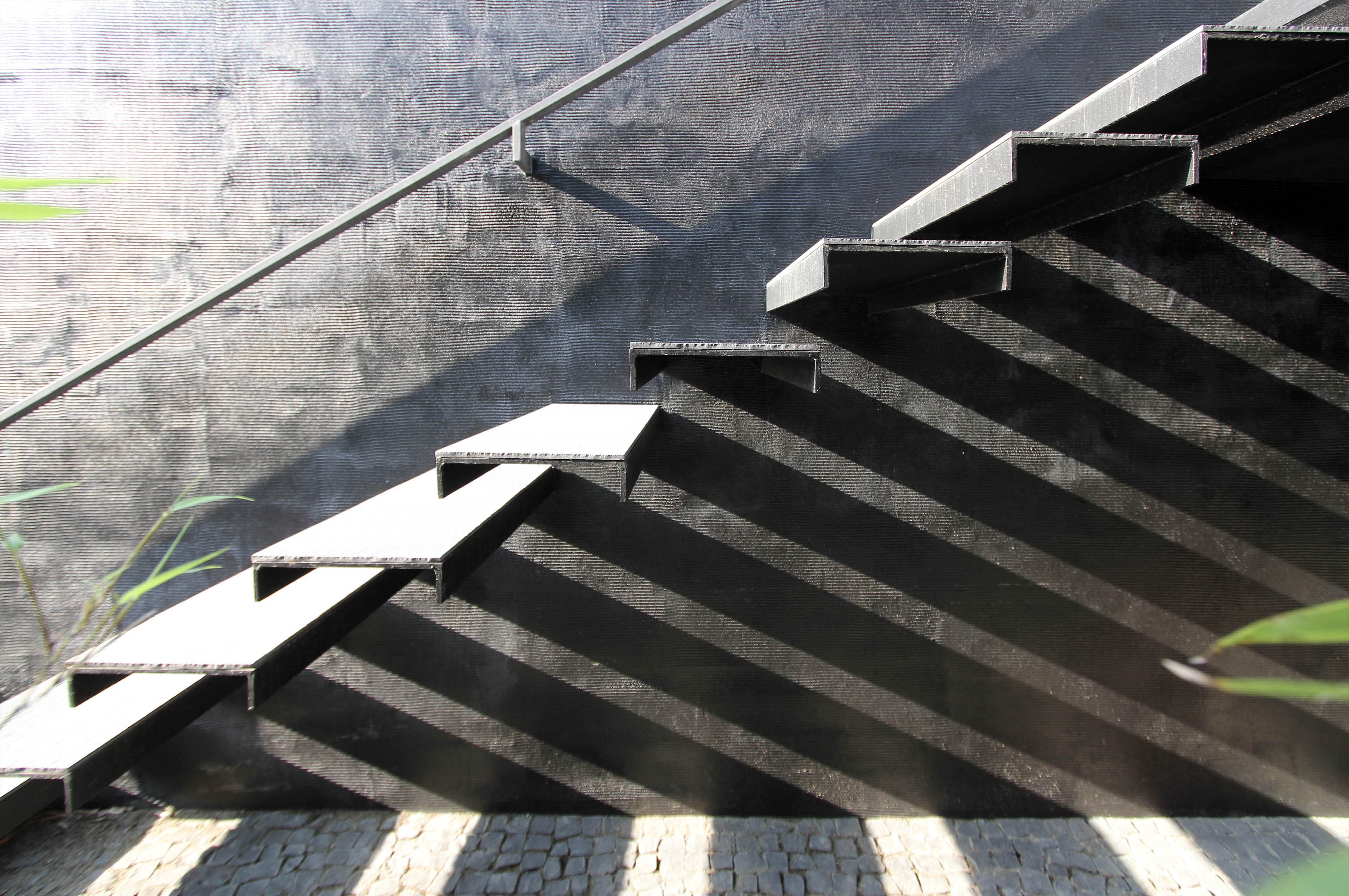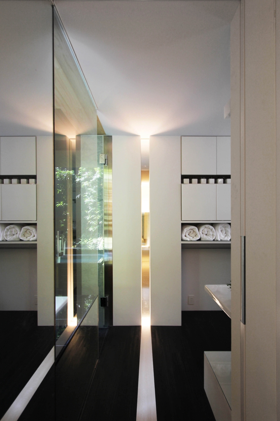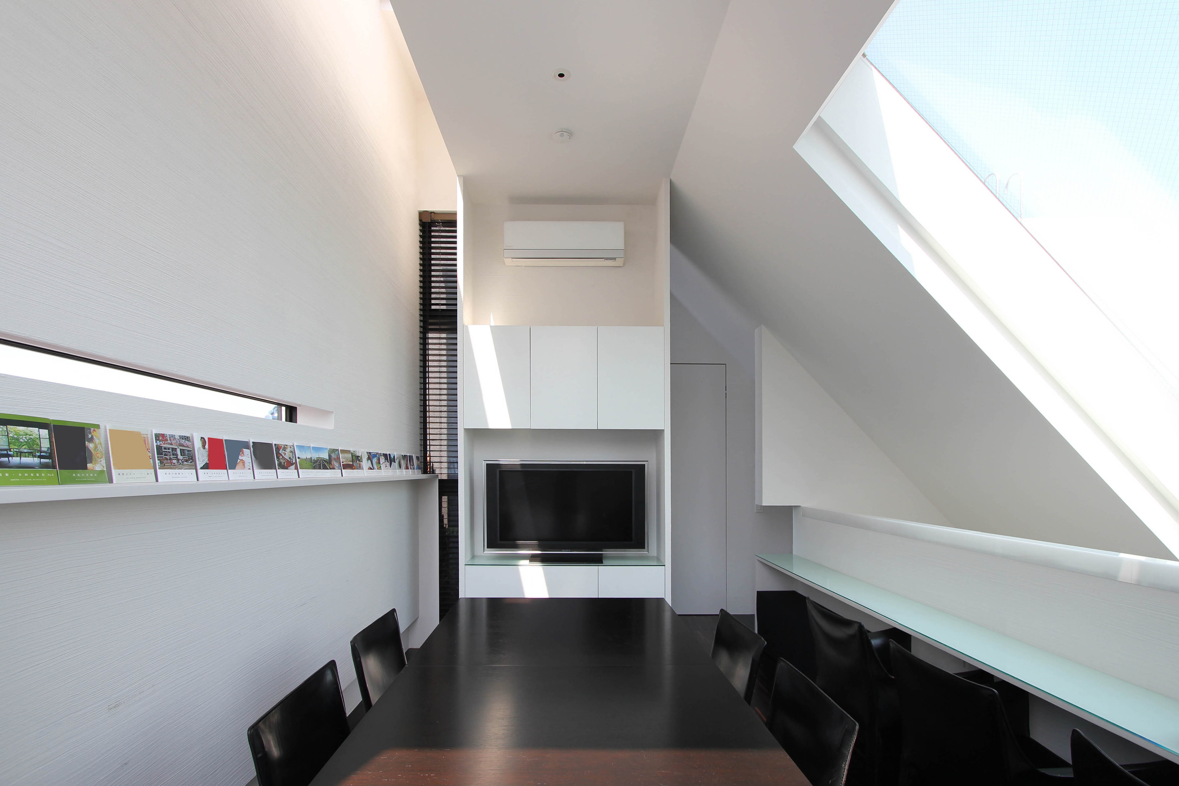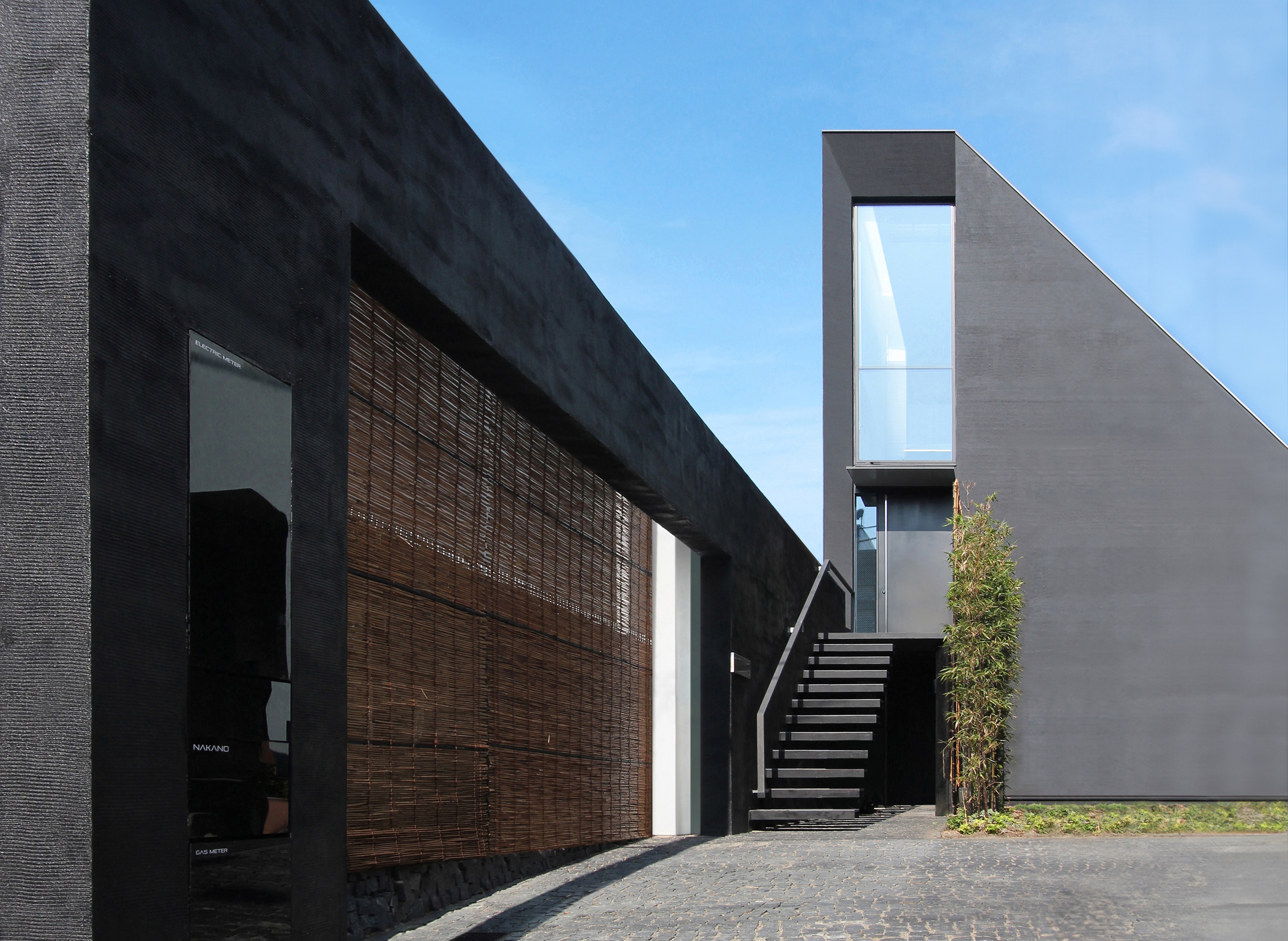 This sculptural black residence was planned in a quiet residential area of Tokyo. The site is narrow at the entrance and elongates towards the back, forming a slender shape. Designed for a parent and their child, this custom house is on an extremely narrow flag lot with no more than two meters of frontage. While complying with Japanese architectural regulations, such as shadow regulation on neighboring lands and building height restrictions, the design aims to create dynamic spaces that capitalize on this unique site shape. The approach features a monolithic black wall integrated with the architecture, incorporating elements like stairs and lighting, leading visitors to the second-floor entrance and enriching the spatial experience. The residence consists of three layers, with half of the first floor buried below ground to maximize interior volume. The first floor includes private spaces, while the second floor serves as guest rooms, and a central void connects to the third-floor dining area. The tsubo-niwa, a small Japanese-style courtyard garden, brings light and air into the home, enhancing the living environment.