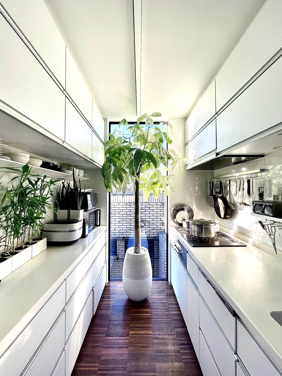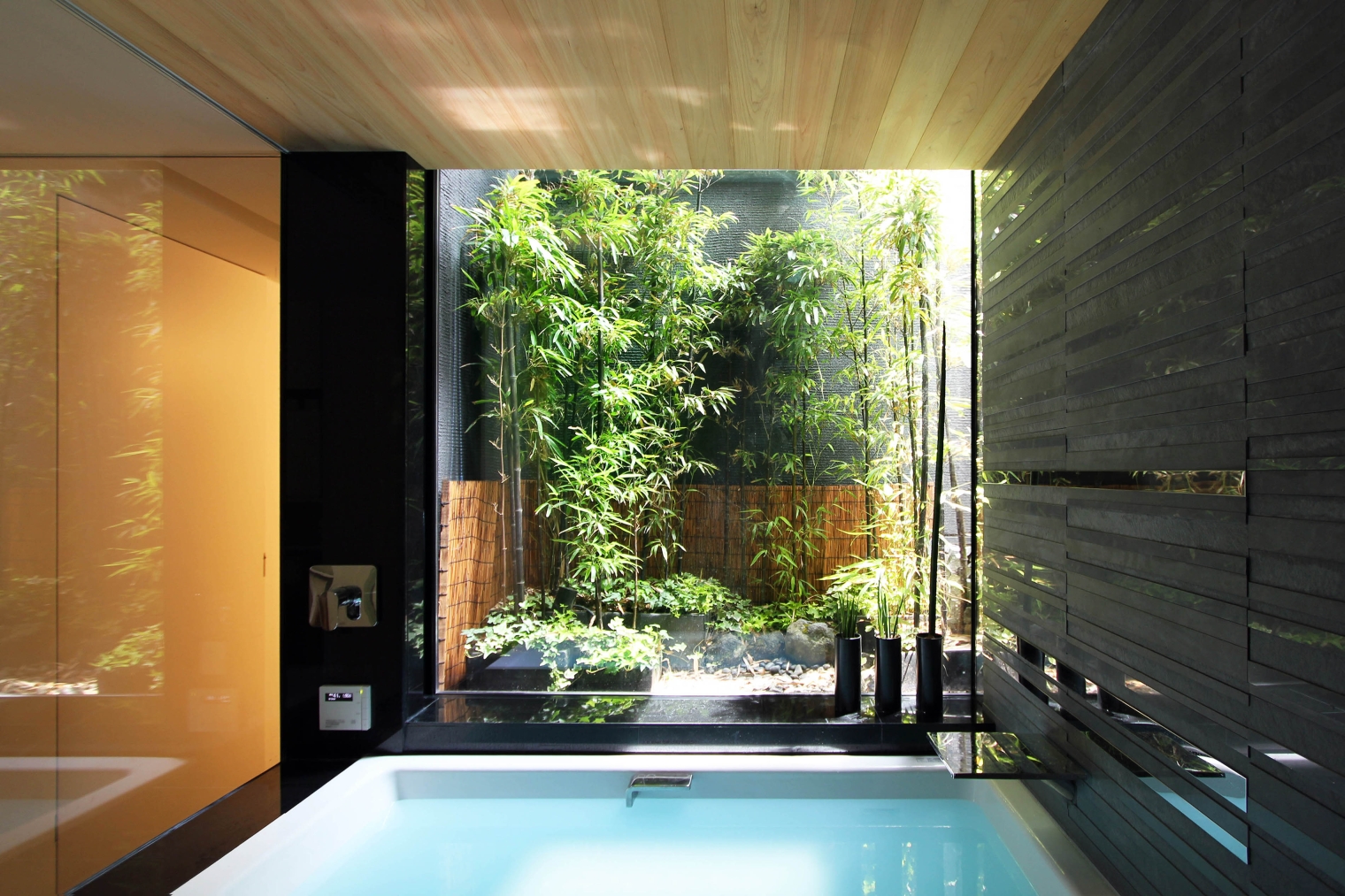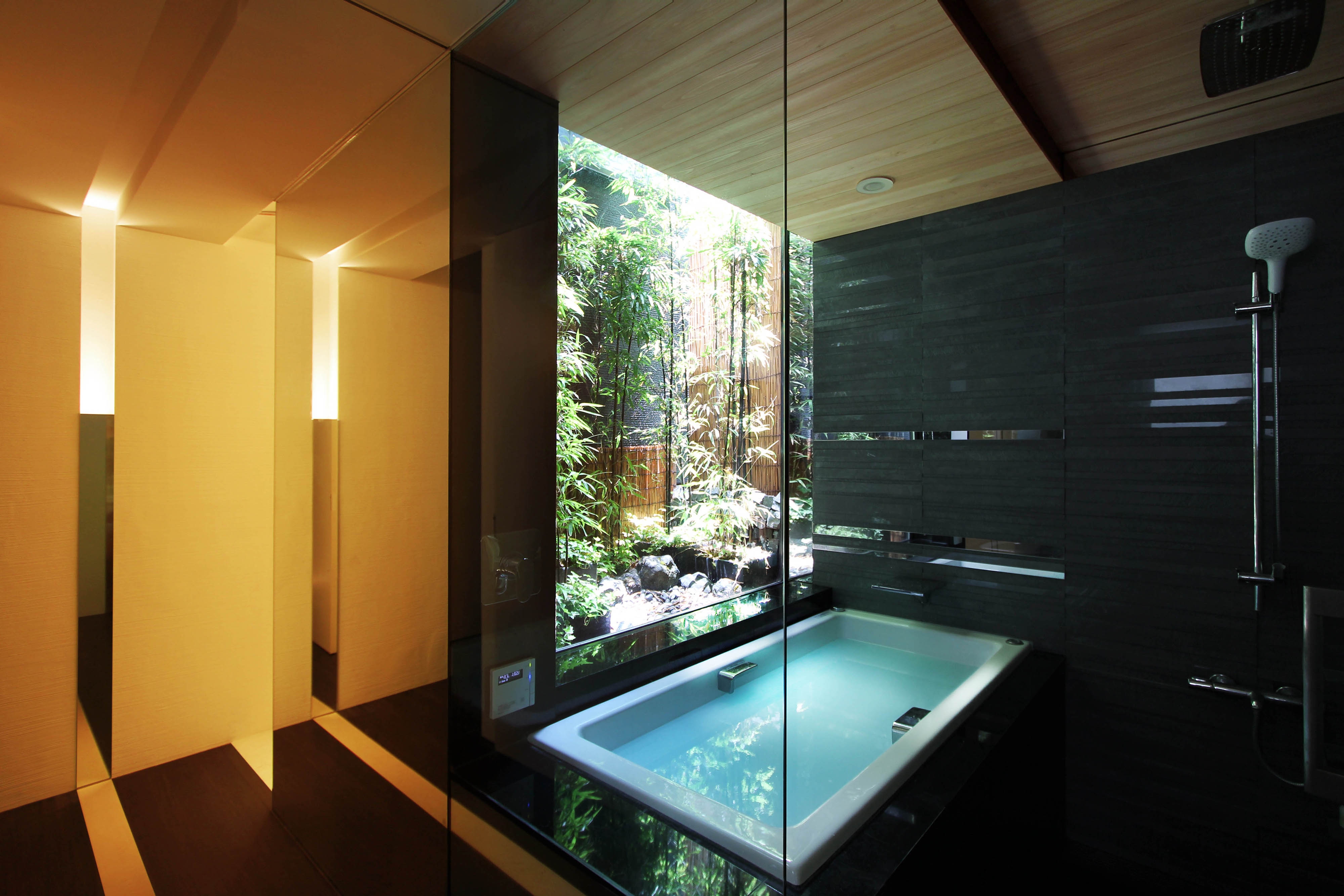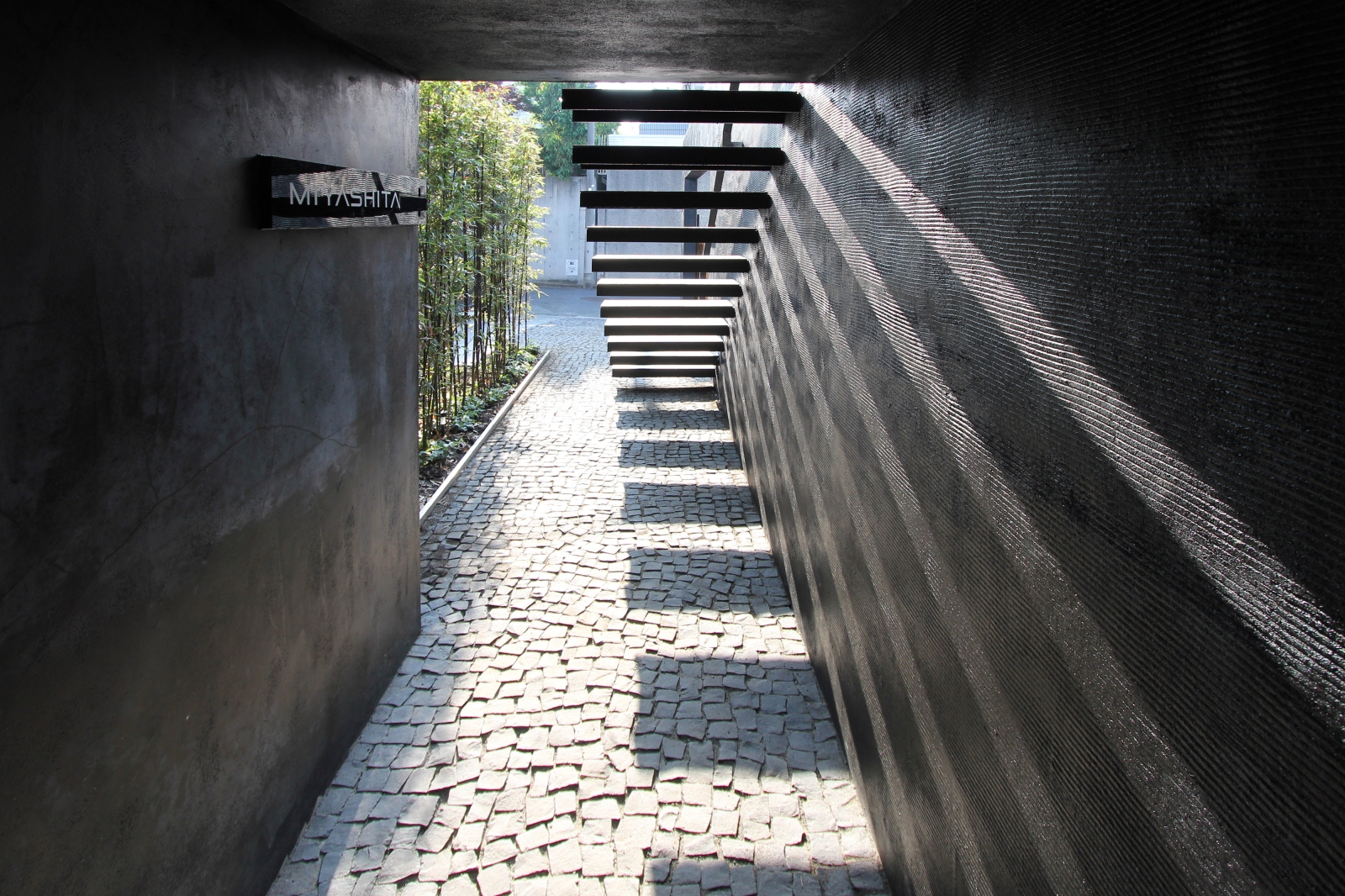 This sculptural black residence was planned in a quiet residential area of Tokyo. The site is narrow at the entrance and elongates towards the back, forming a slender shape. Designed for a parent and their child, this custom house is on an extremely narrow flag lot with no more than two meters of frontage. While complying with Japanese architectural regulations, such as shadow regulation on neighboring lands and building height restrictions, the design aims to create dynamic spaces that capitalize on this unique site shape. The approach features a monolithic black wall integrated with the architecture, incorporating elements like stairs and lighting, leading visitors to the second-floor entrance and enriching the spatial experience. The residence consists of three layers, with half of the first floor buried below ground to maximize interior volume. The first floor includes private spaces, while the second floor serves as guest rooms, and a central void connects to the third-floor dining area. The tsubo-niwa, a small Japanese-style courtyard garden, brings light and air into the home, enhancing the living environment.