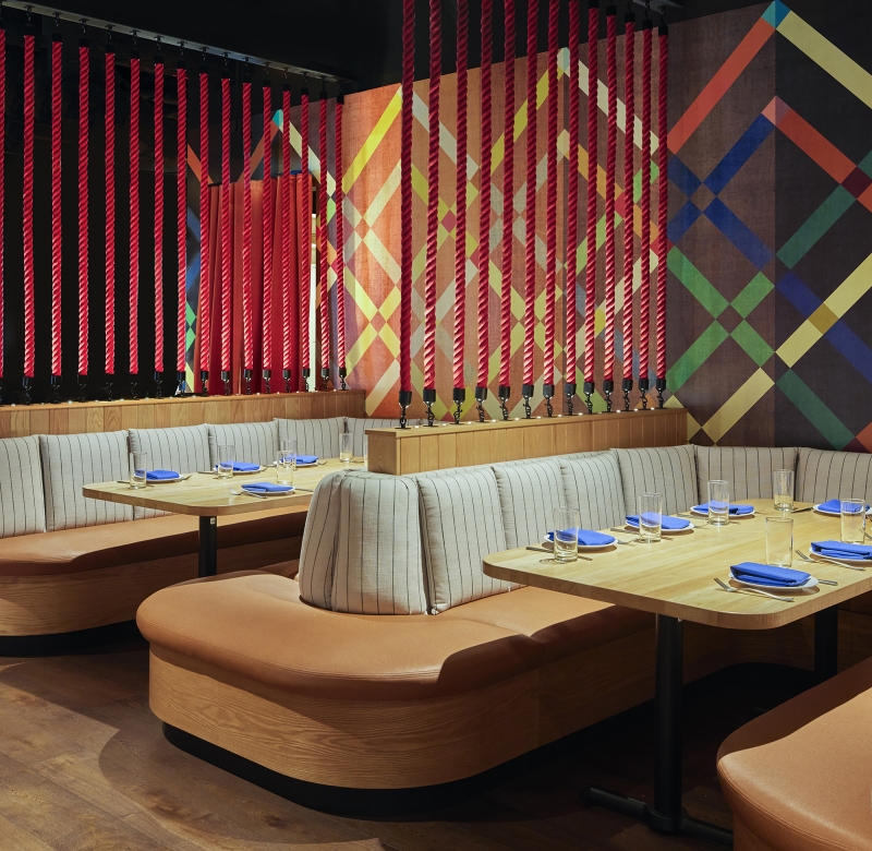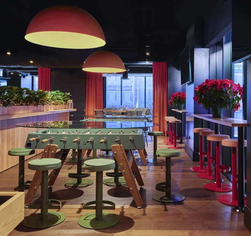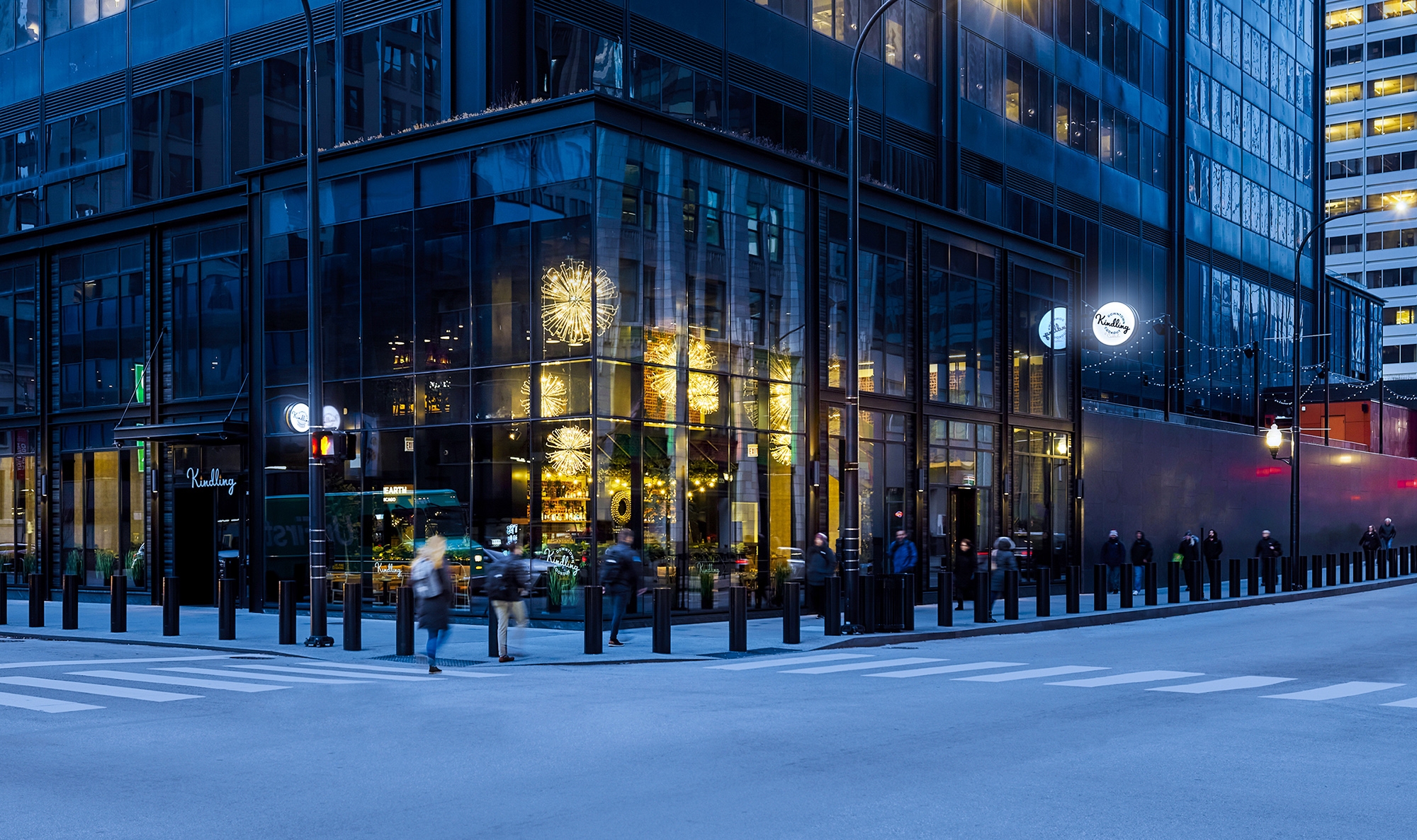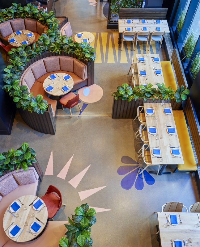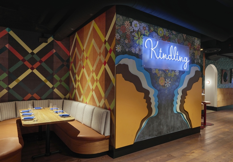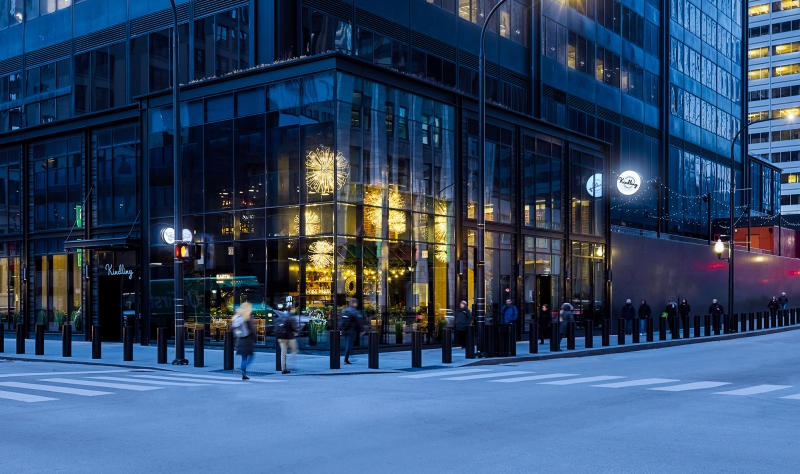 Cookouts, campfires and long summer days are the spark behind this dining experience. At the base of Willis Tower, this restaurant features an open-fire grill with an elevated American menu. The interior design sculpts the space into moments alternating between dimension and intimacy. Pathways meander through the tables and up the stairs, which frame a statement art piece: a child’s silhouette blowing dandelion seeds. Lush plant life fill in the space while dandelion pendants create bursts of light and motion in the space overhead. The ground floor consists of semicircular banquettes and rows of tables that peek through the foliage in intimate seating arrangements, while the upper-level has a field day with open seating, game tables and a terrace. Branding was inspired by the original identity present at the completion of the Sears Tower, lending a throwback feel to the touchpoints. Bold, avant-garde signs and sidewalk-inspired floor art are drawn from Chicago’s parks. This space stands for what the Willis Tower represents today. The old and new come together to highlight the building’s architectural spirit while breathing new life into a historic space.