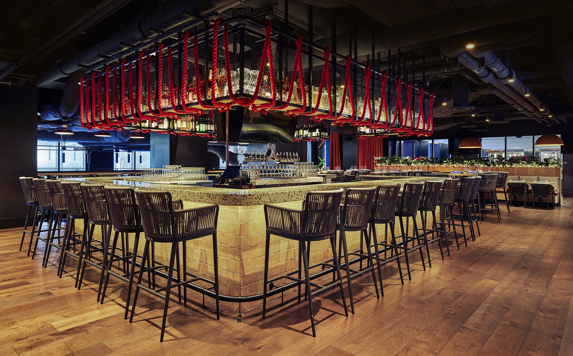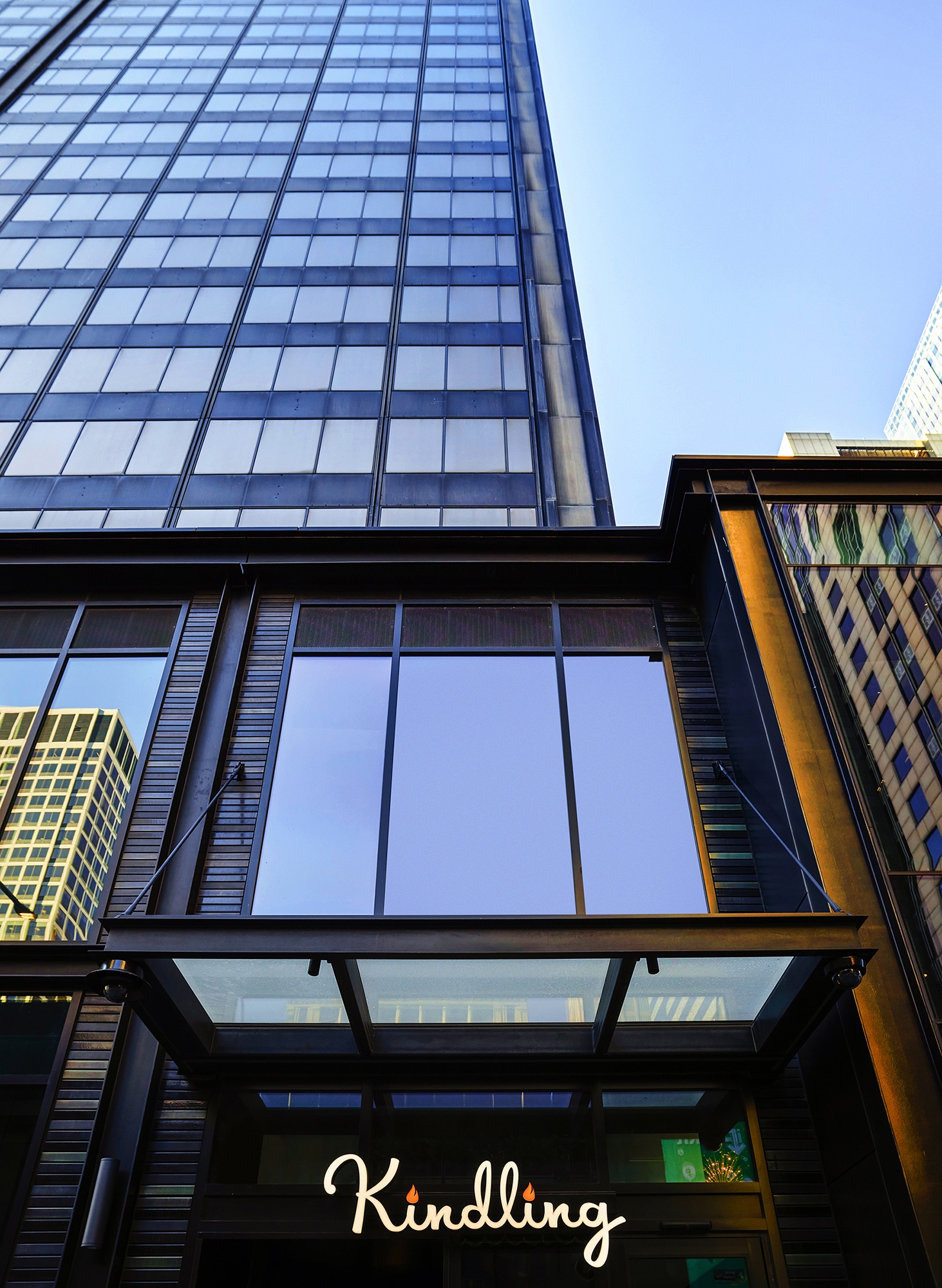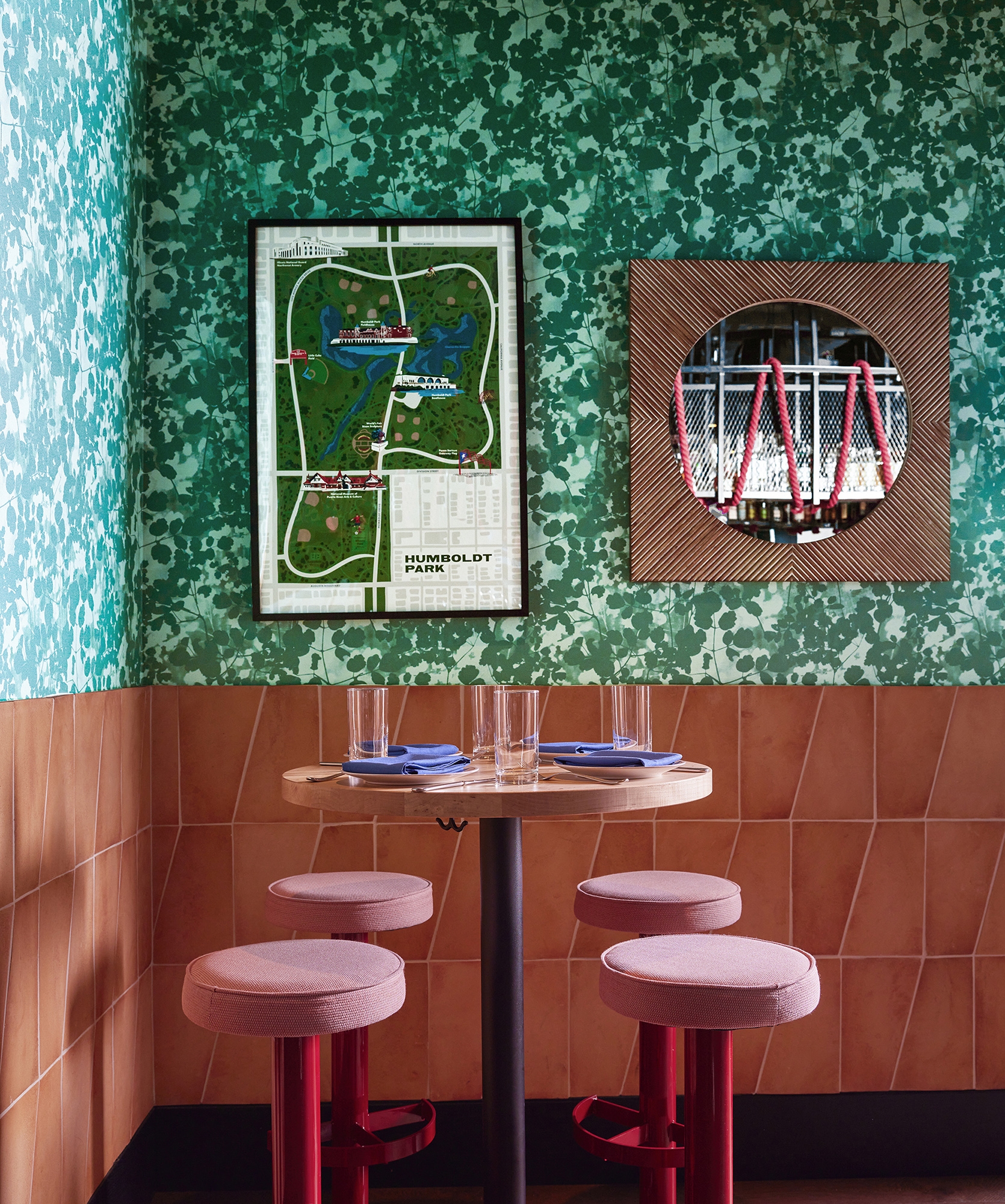 Cookouts, campfires and long summer days are the spark behind this dining experience. At the base of Willis Tower, this restaurant features an open-fire grill with an elevated American menu. The interior design sculpts the space into moments alternating between dimension and intimacy. Pathways meander through the tables and up the stairs, which frame a statement art piece: a child’s silhouette blowing dandelion seeds. Lush plant life fill in the space while dandelion pendants create bursts of light and motion in the space overhead. The ground floor consists of semicircular banquettes and rows of tables that peek through the foliage in intimate seating arrangements, while the upper-level has a field day with open seating, game tables and a terrace. Branding was inspired by the original identity present at the completion of the Sears Tower, lending a throwback feel to the touchpoints. Bold, avant-garde signs and sidewalk-inspired floor art are drawn from Chicago’s parks. This space stands for what the Willis Tower represents today. The old and new come together to highlight the building’s architectural spirit while breathing new life into a historic space.